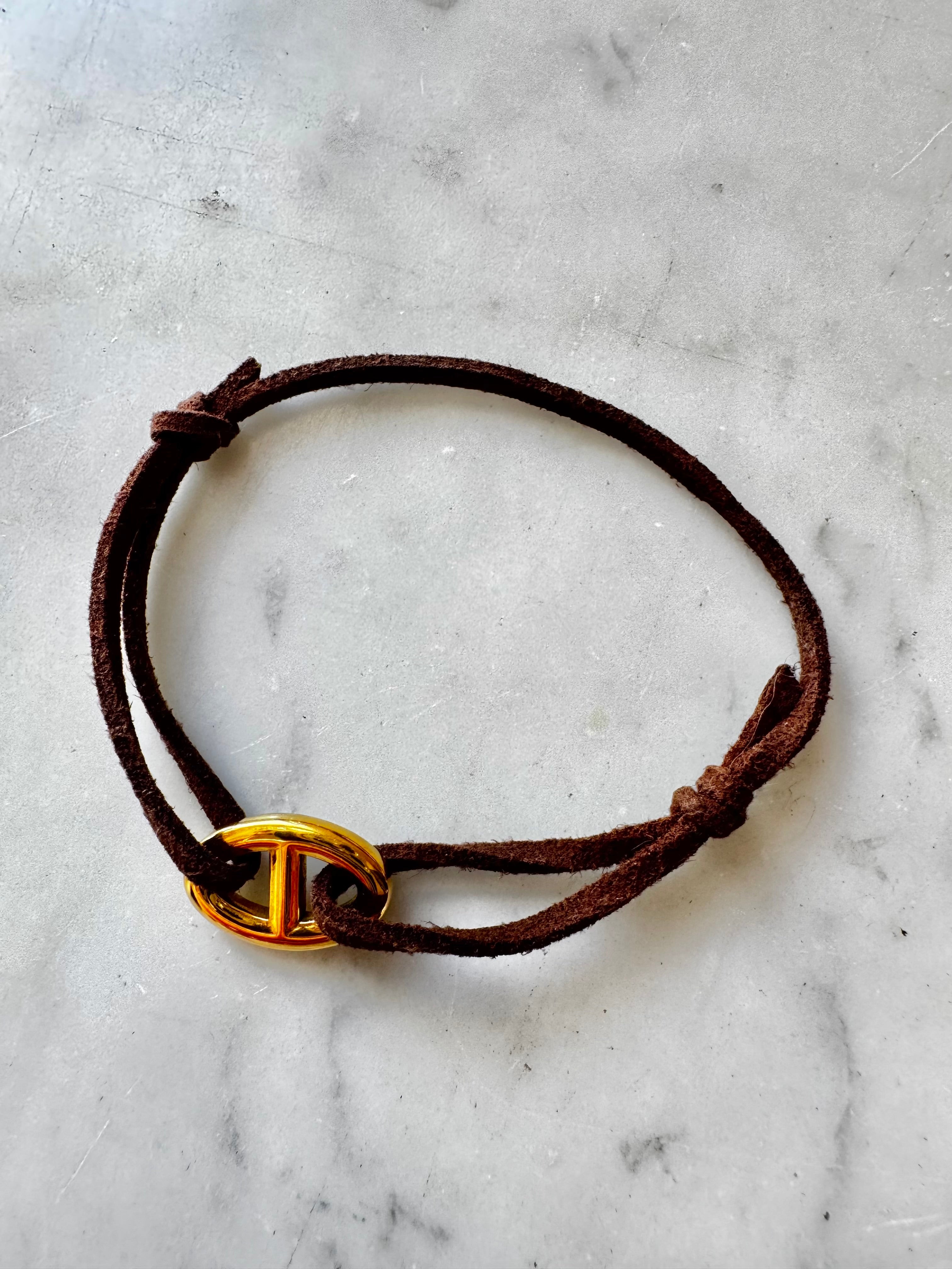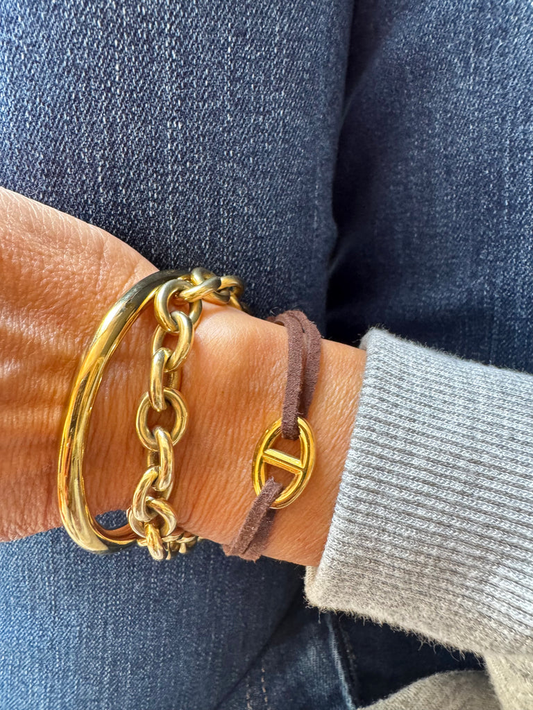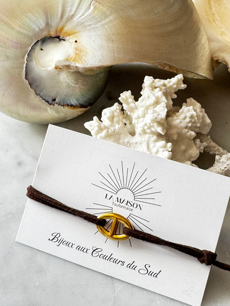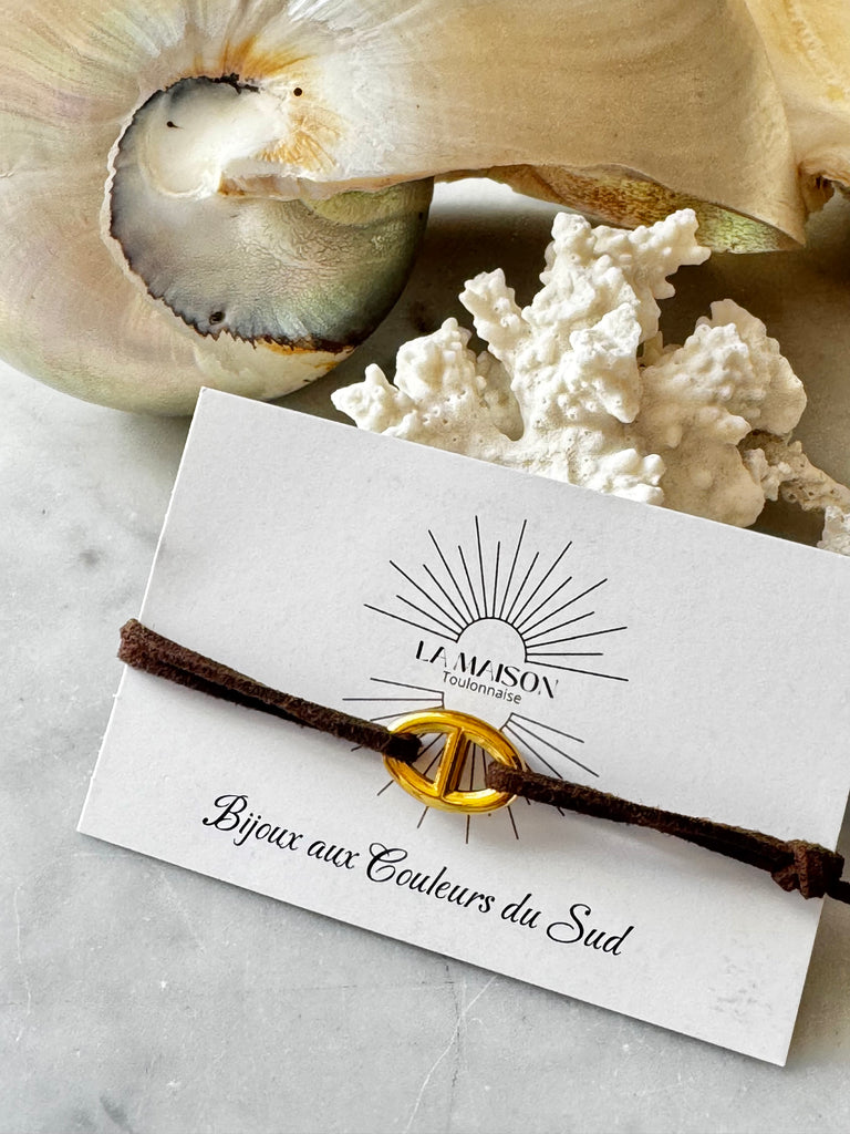 En hommage à la mer, Bracelet maille marine en acier inoxydable plaqué or 18k, montée sur un lien en cuir suédine marron.