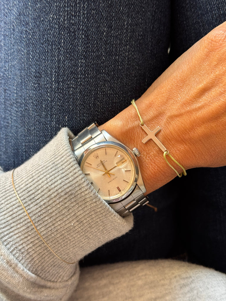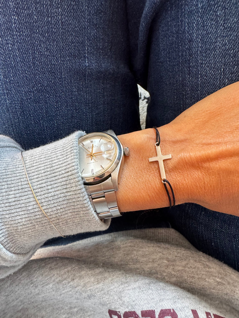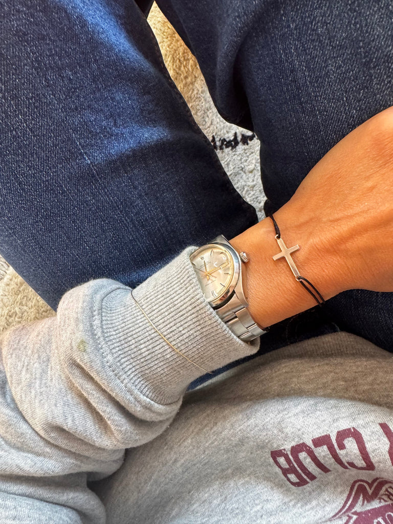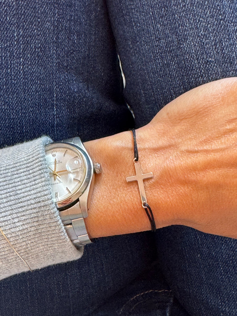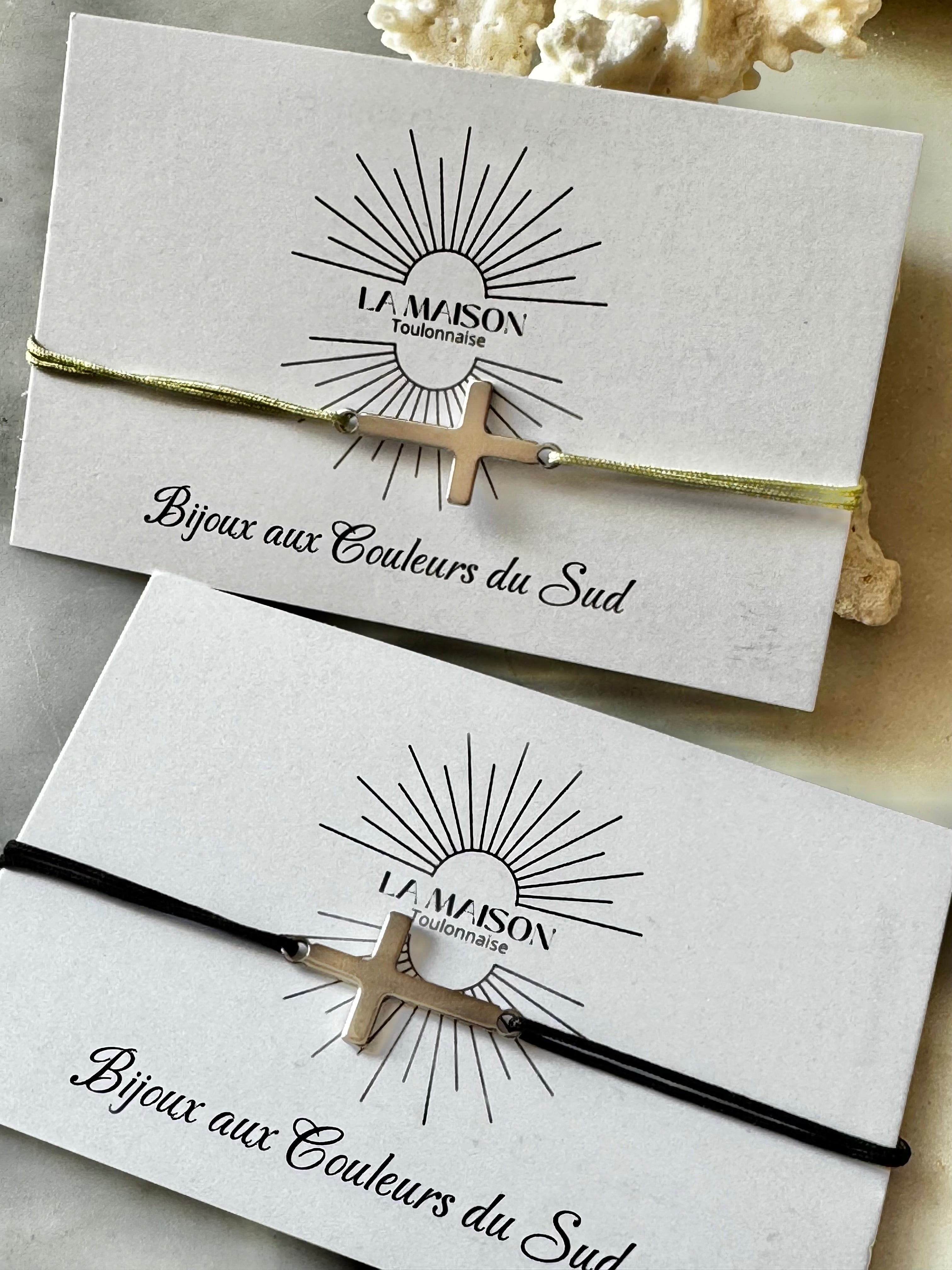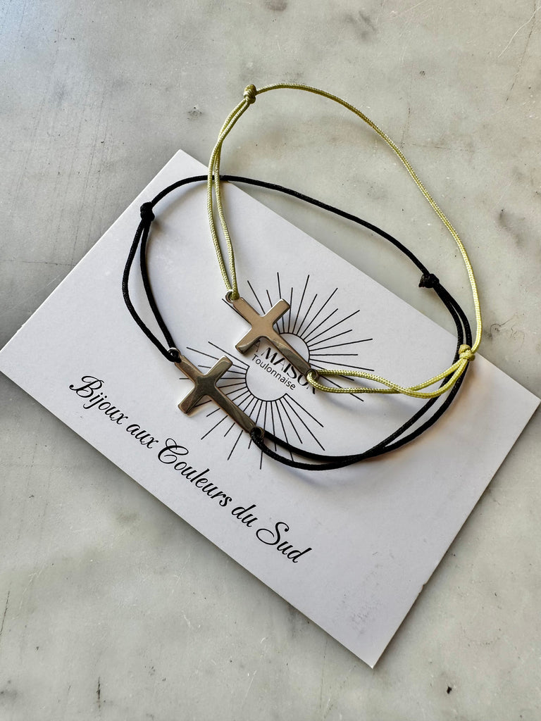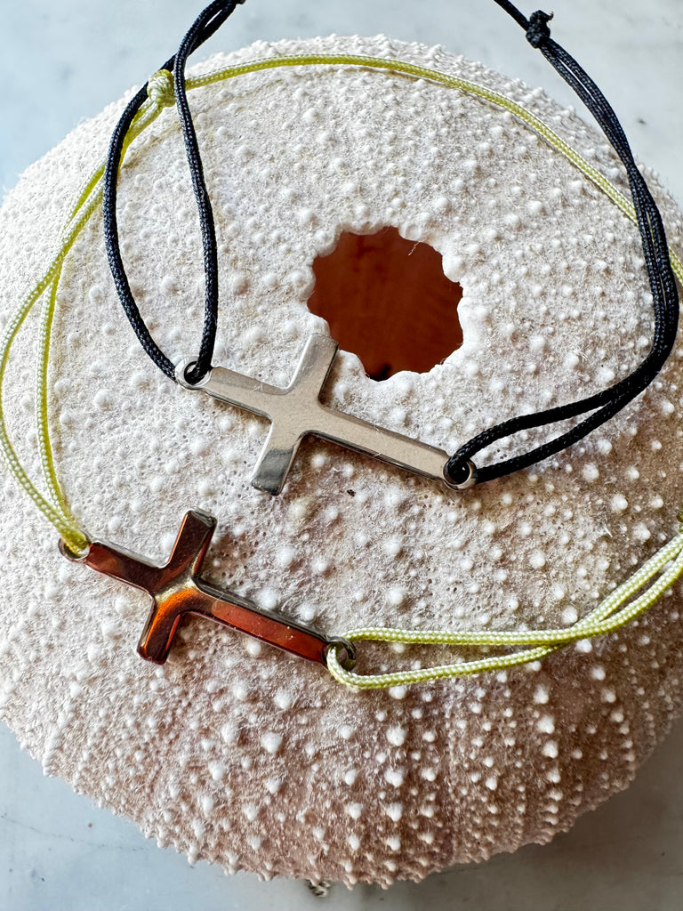 Jolie croix en acier inoxydable montée sur un fil de soie kaki ou noir.