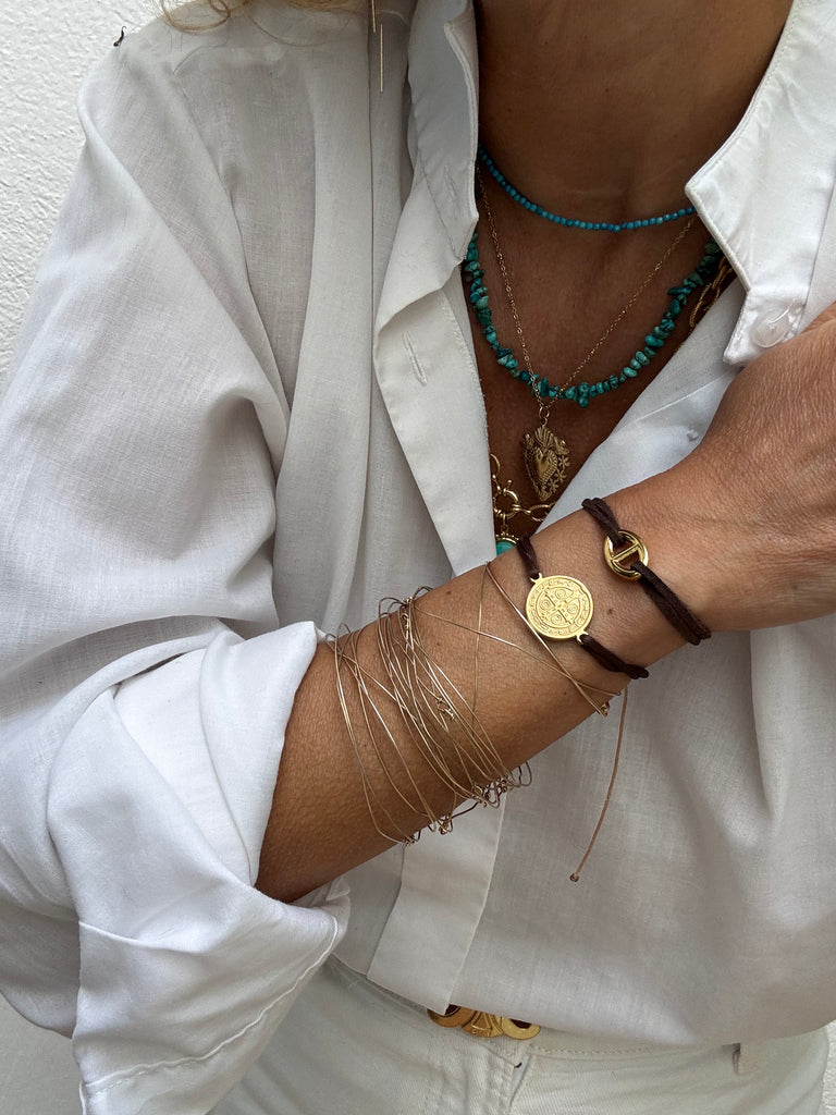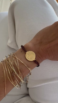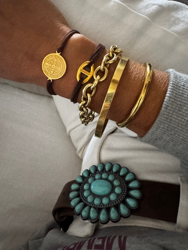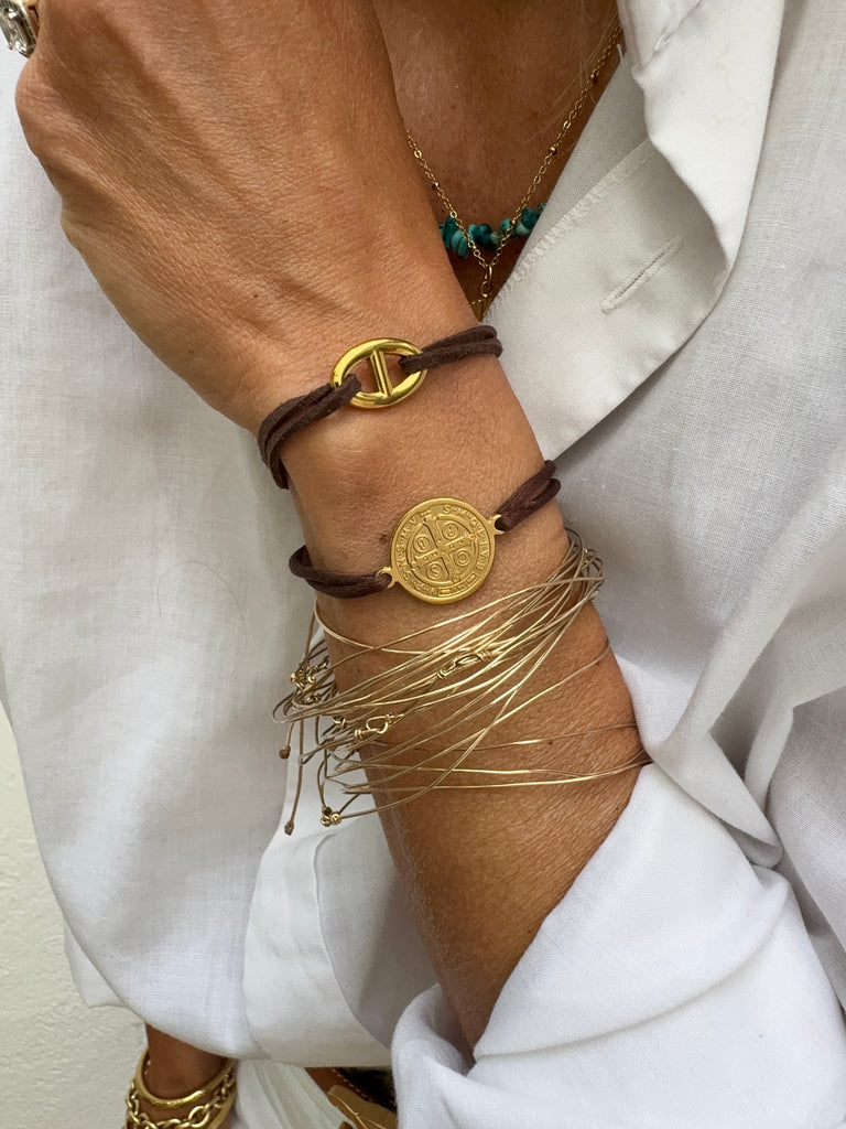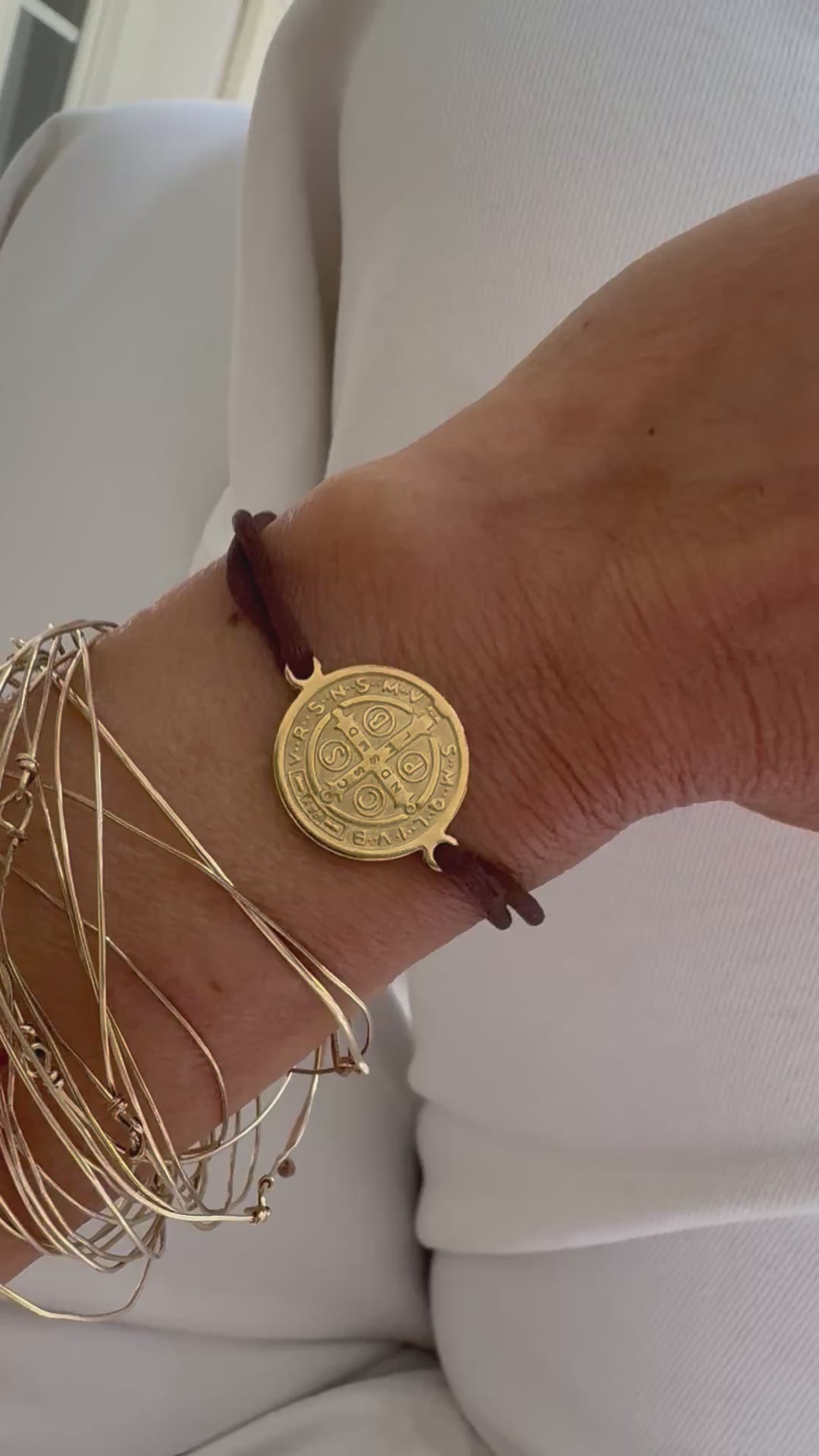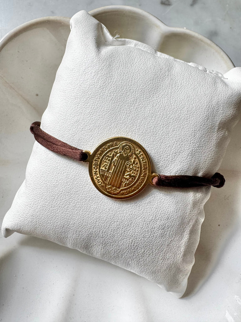 Superbe Bracelet avec médaille de Saint Benoit en acier inoxydable montée sur un lien marron se réglant par deux noeuds coulissants