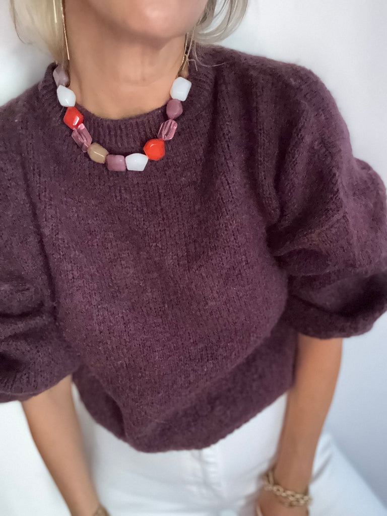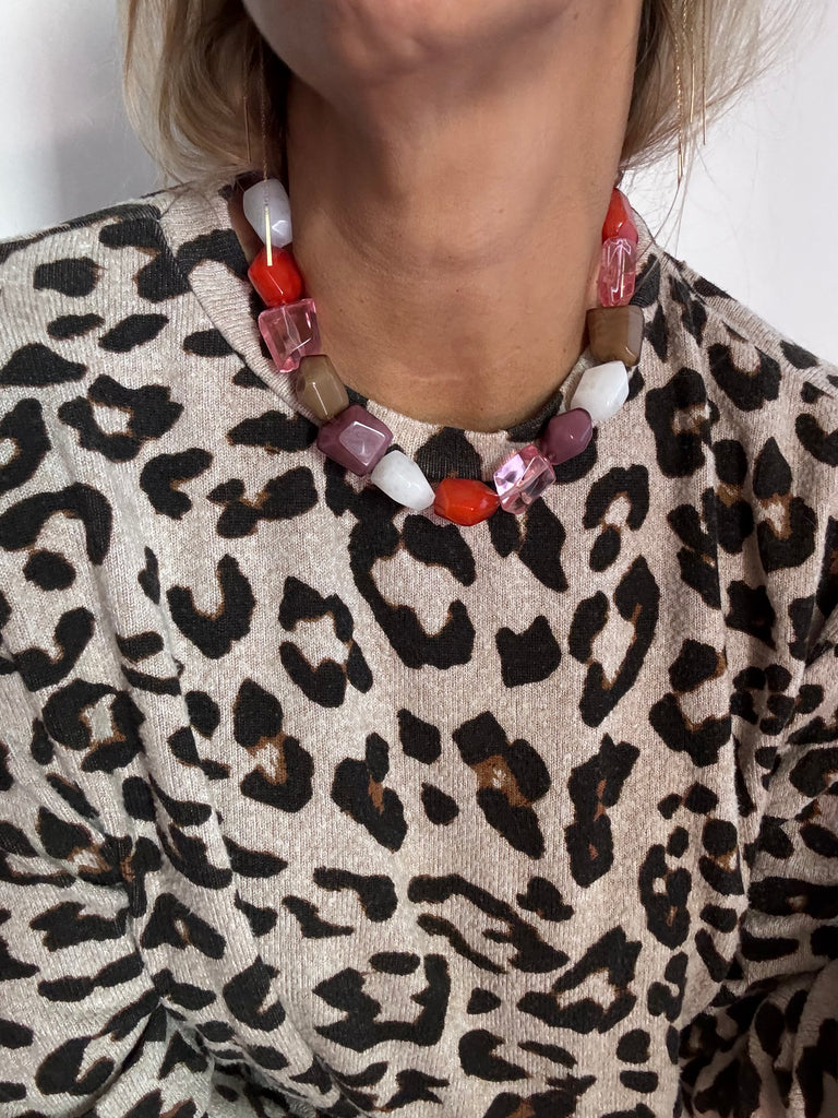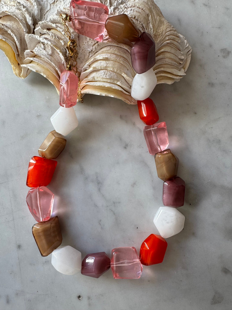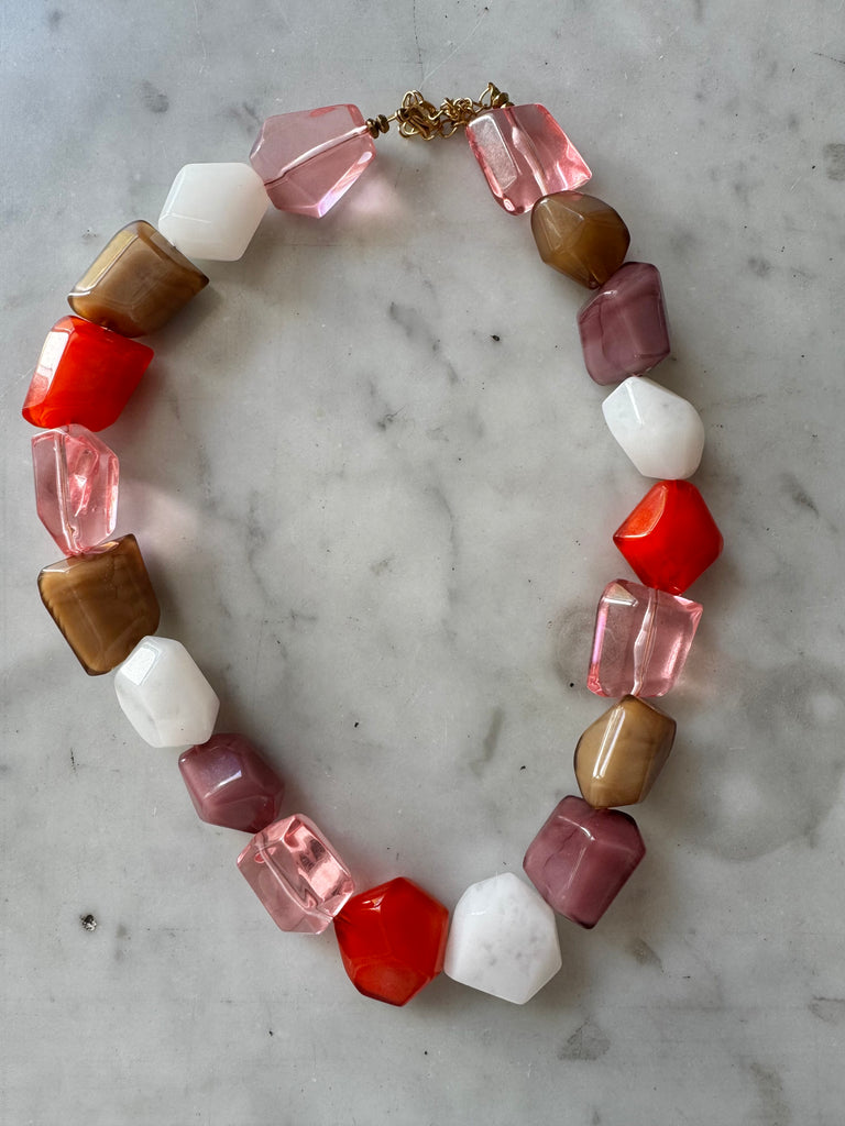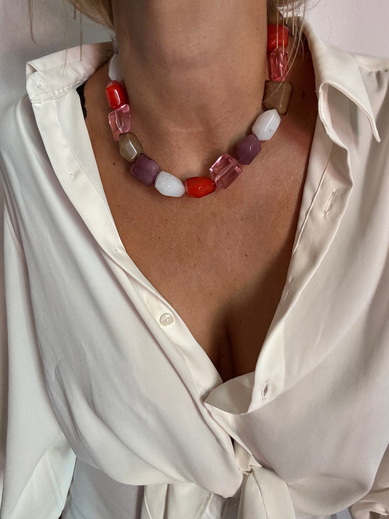 Collier en grosses perles en résine colorées de formes aléatoires.