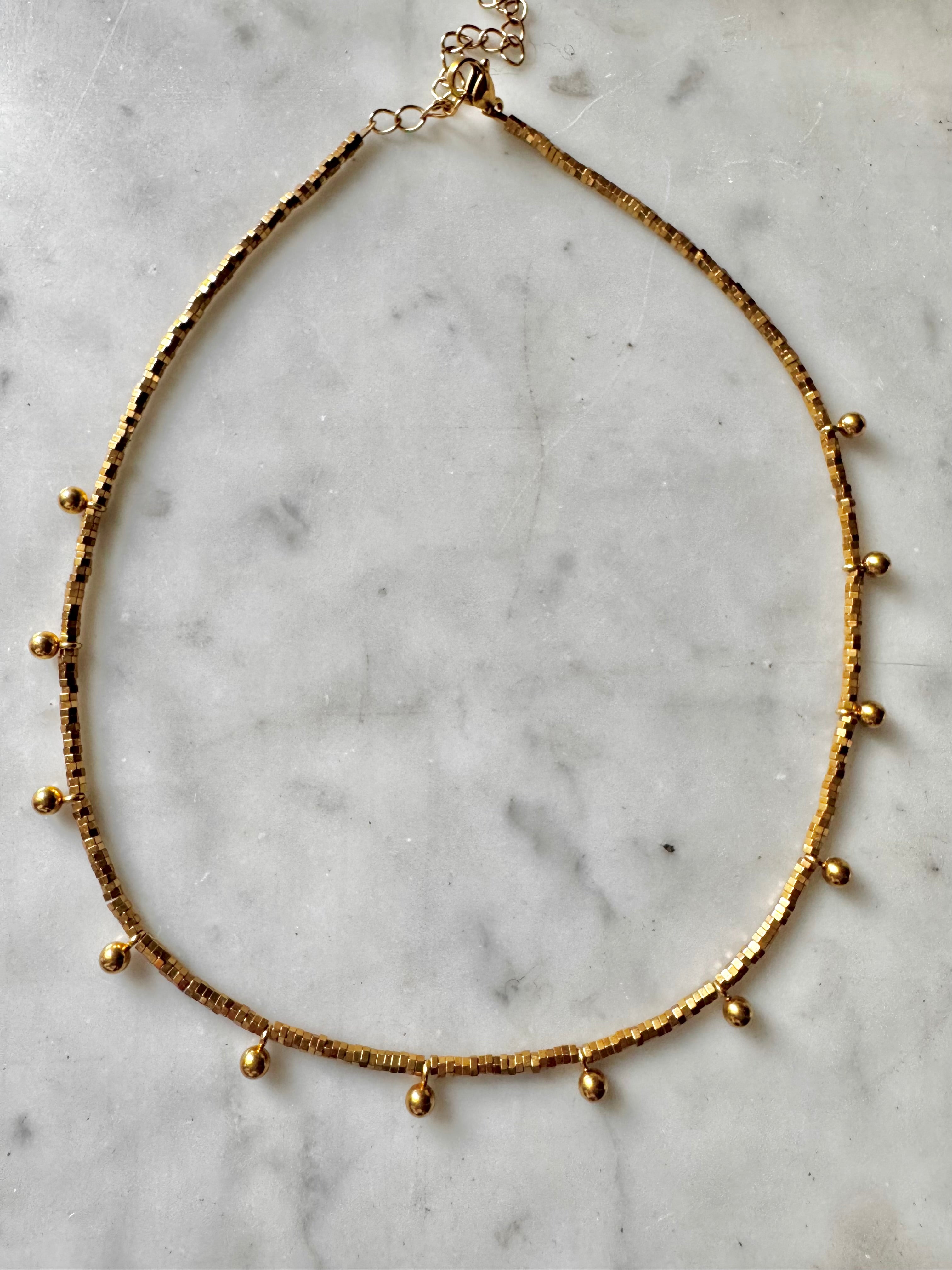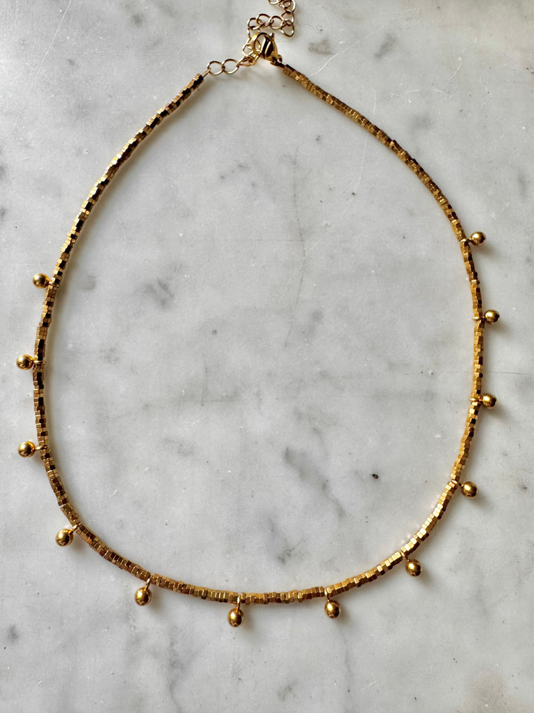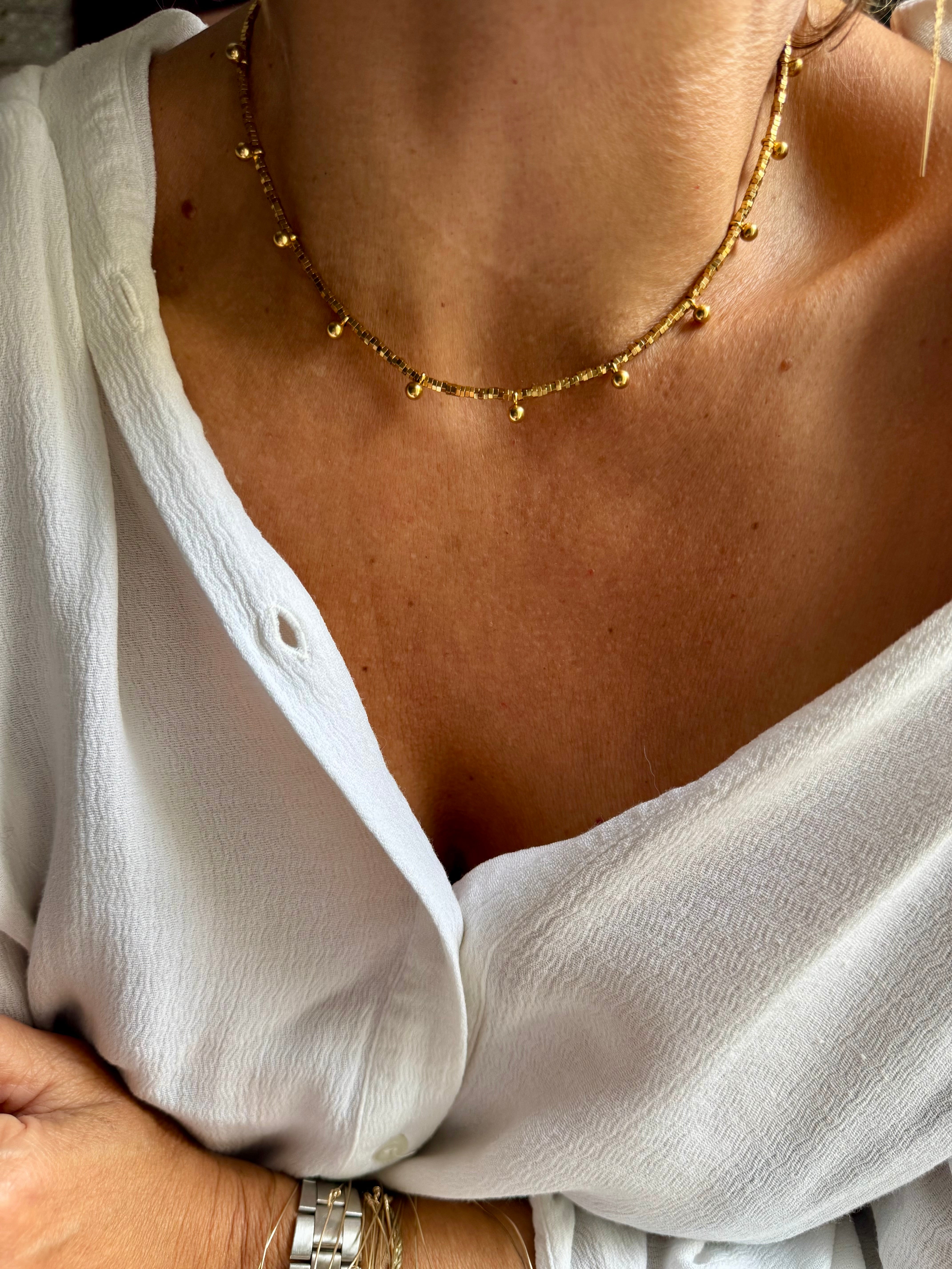 Collier ras de cou de perles en hématite dorée et perles boules en acier inoxydable.