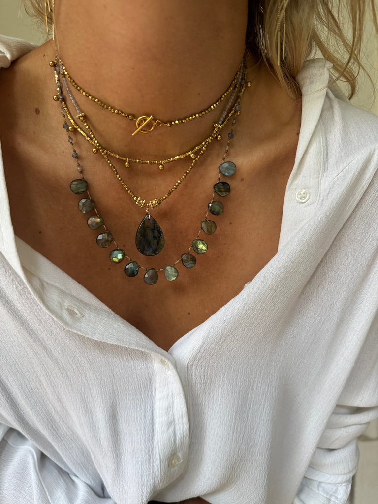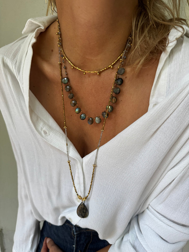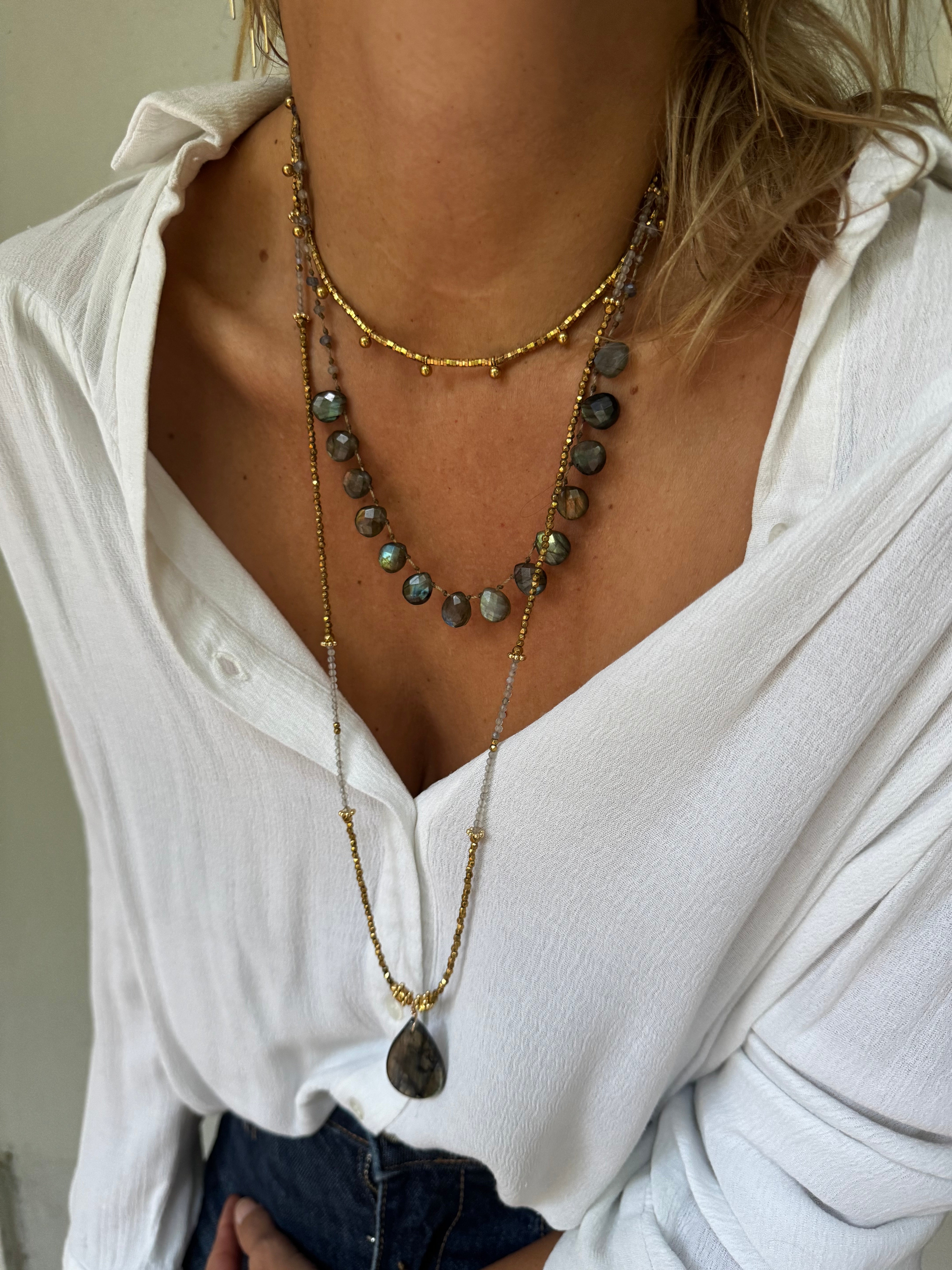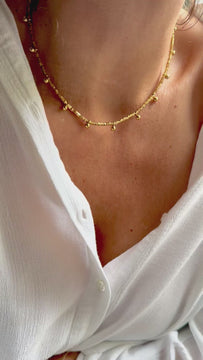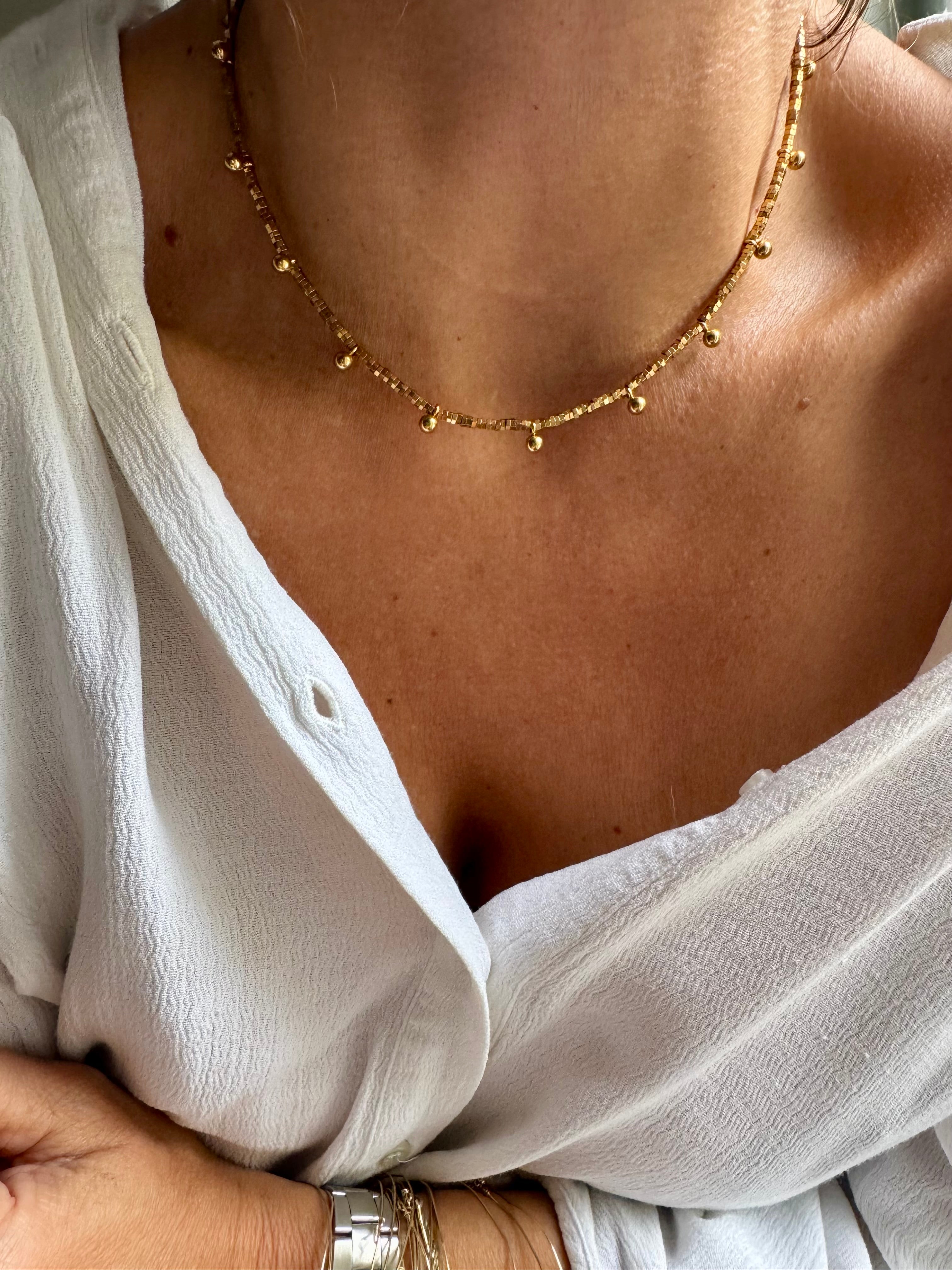 Collier ras de cou de perles en hématite dorée et perles boules en acier inoxydable.