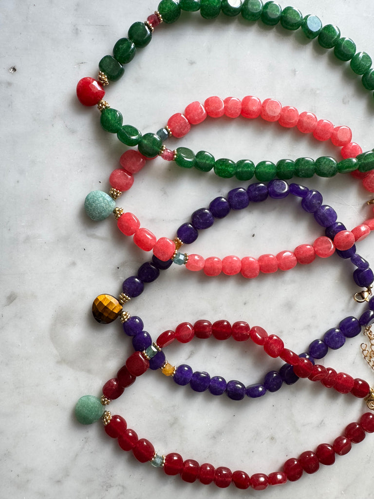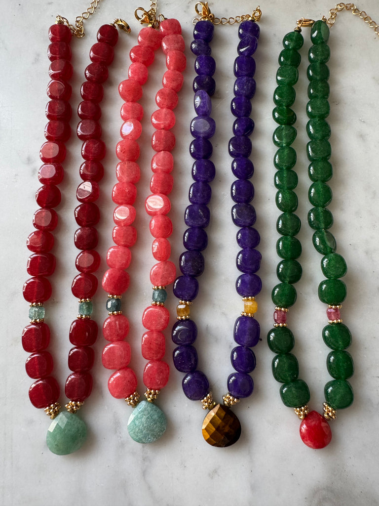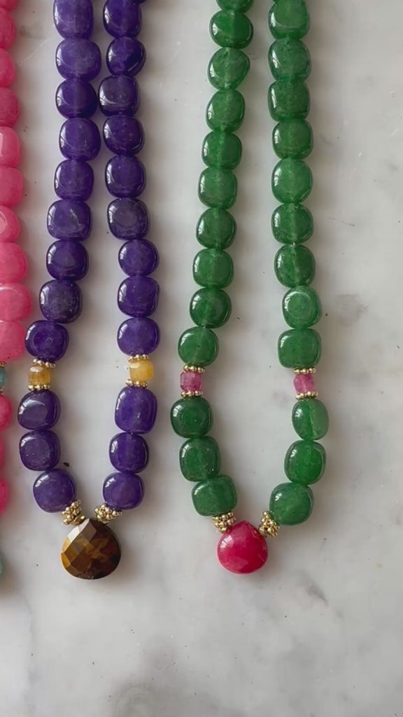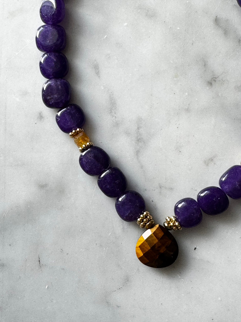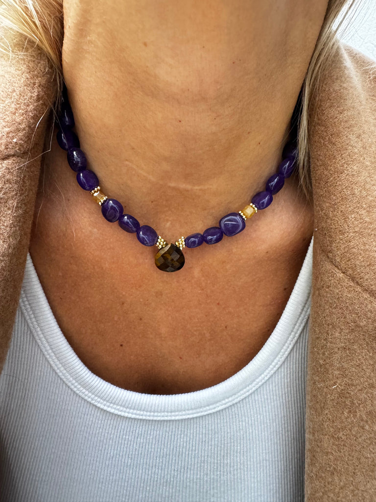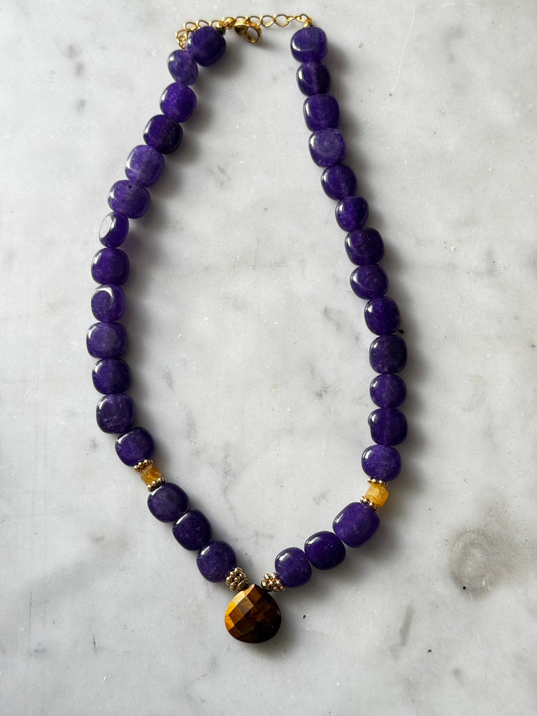 Collier en perles rondes irrégulières en Calcédoine pourpre et au centre un Œil de tigre facetté.