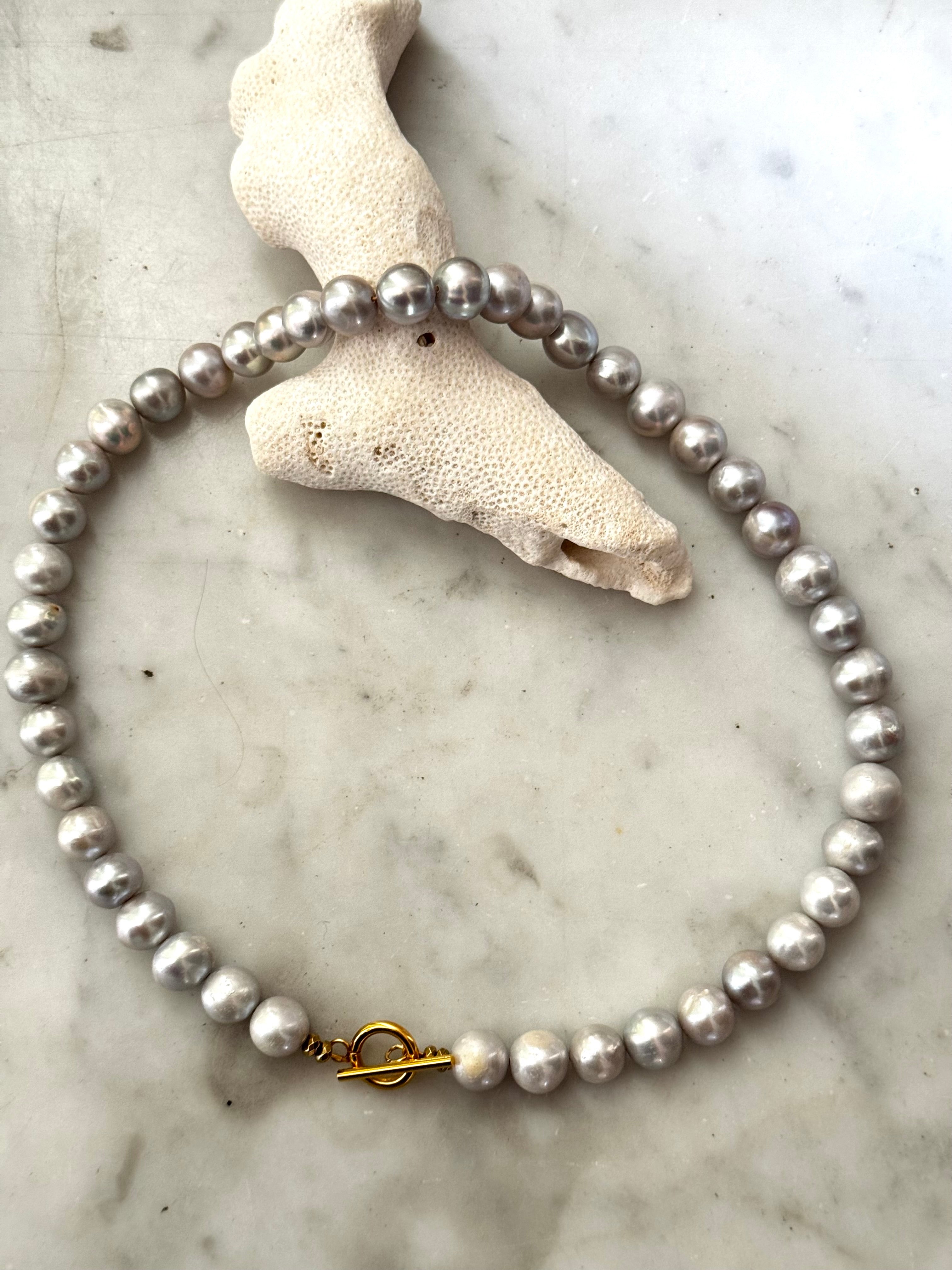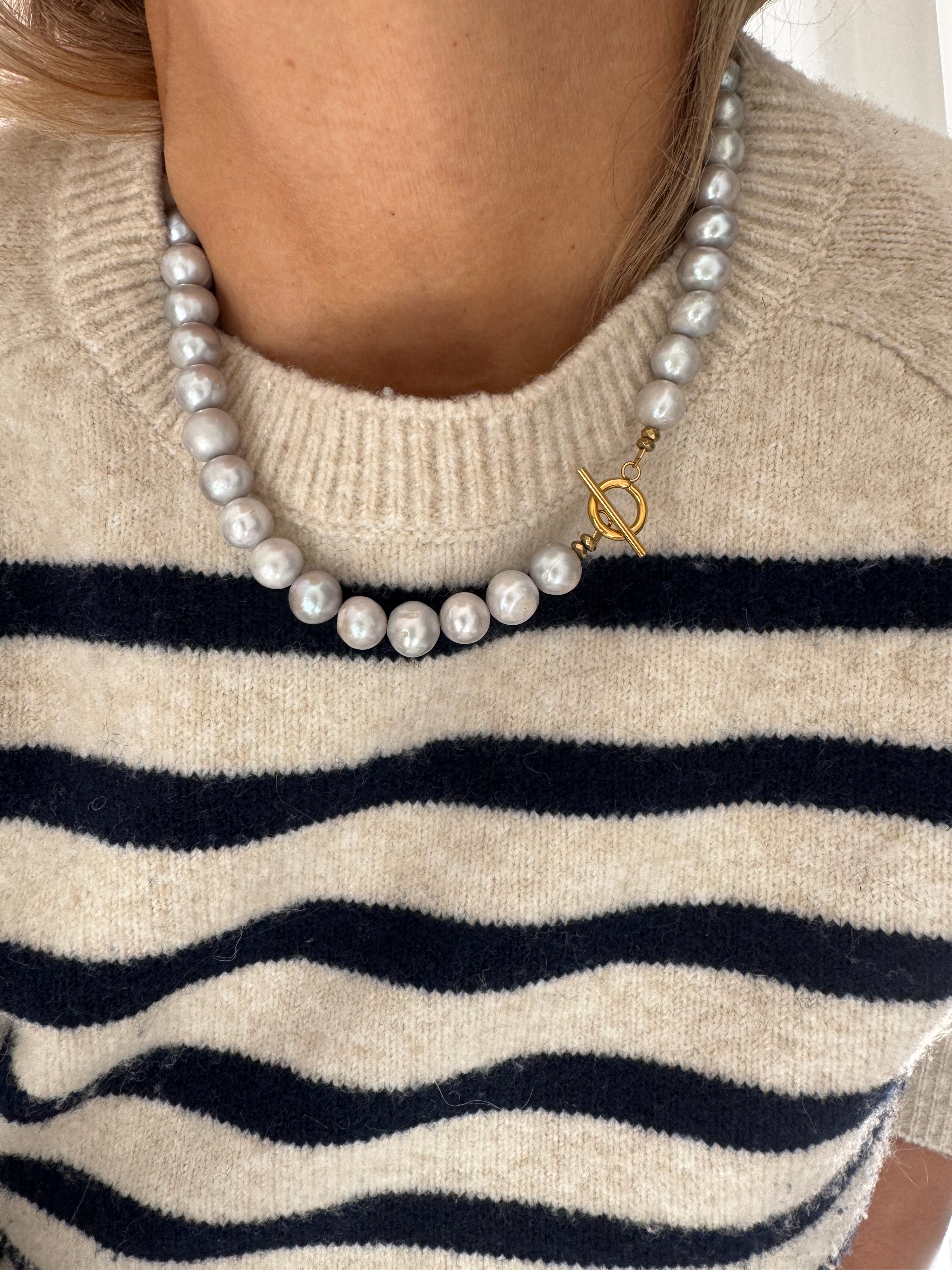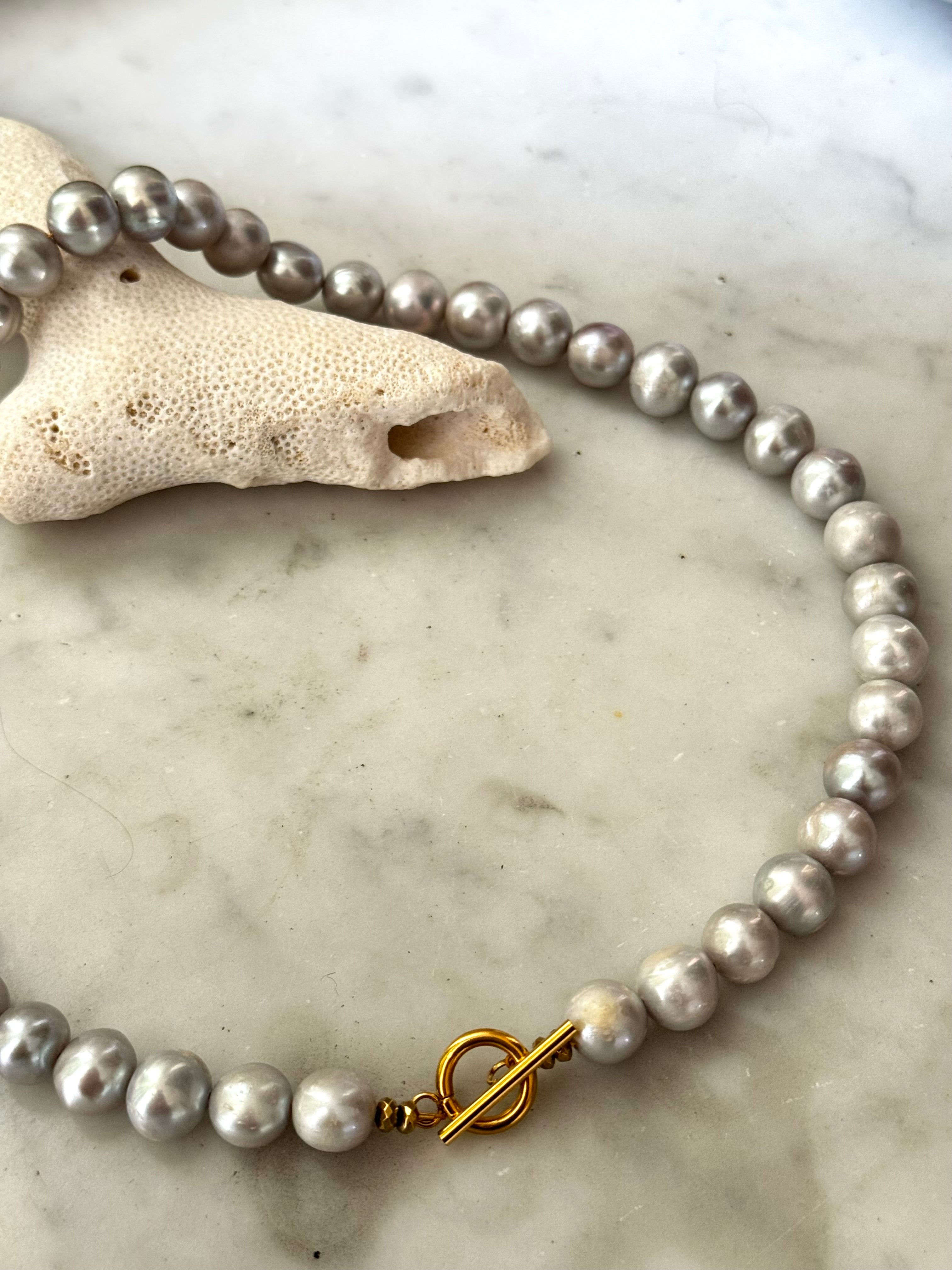 Collier en perles grises et fermoir T en acier inoxydable plaqué 18carats.