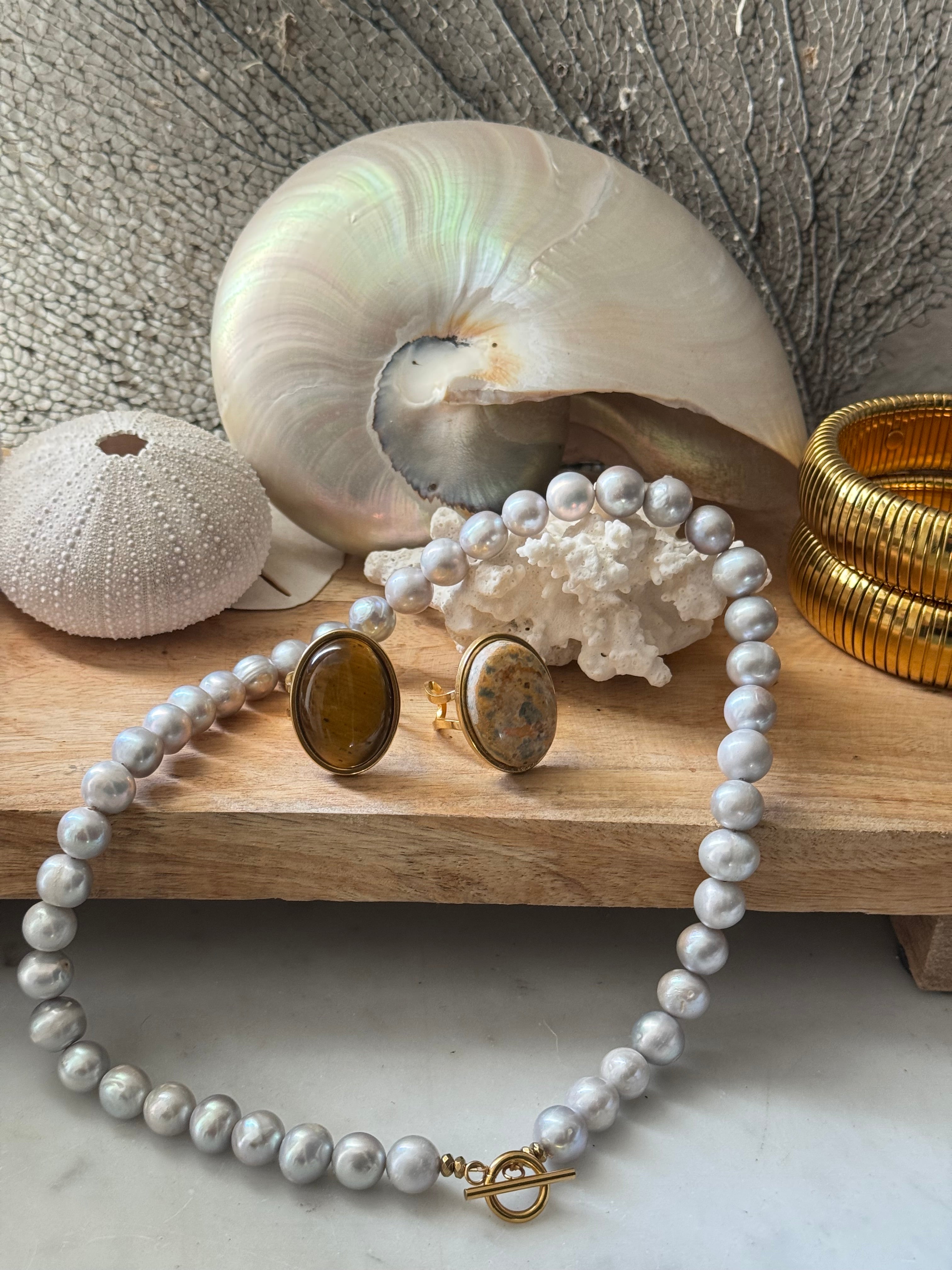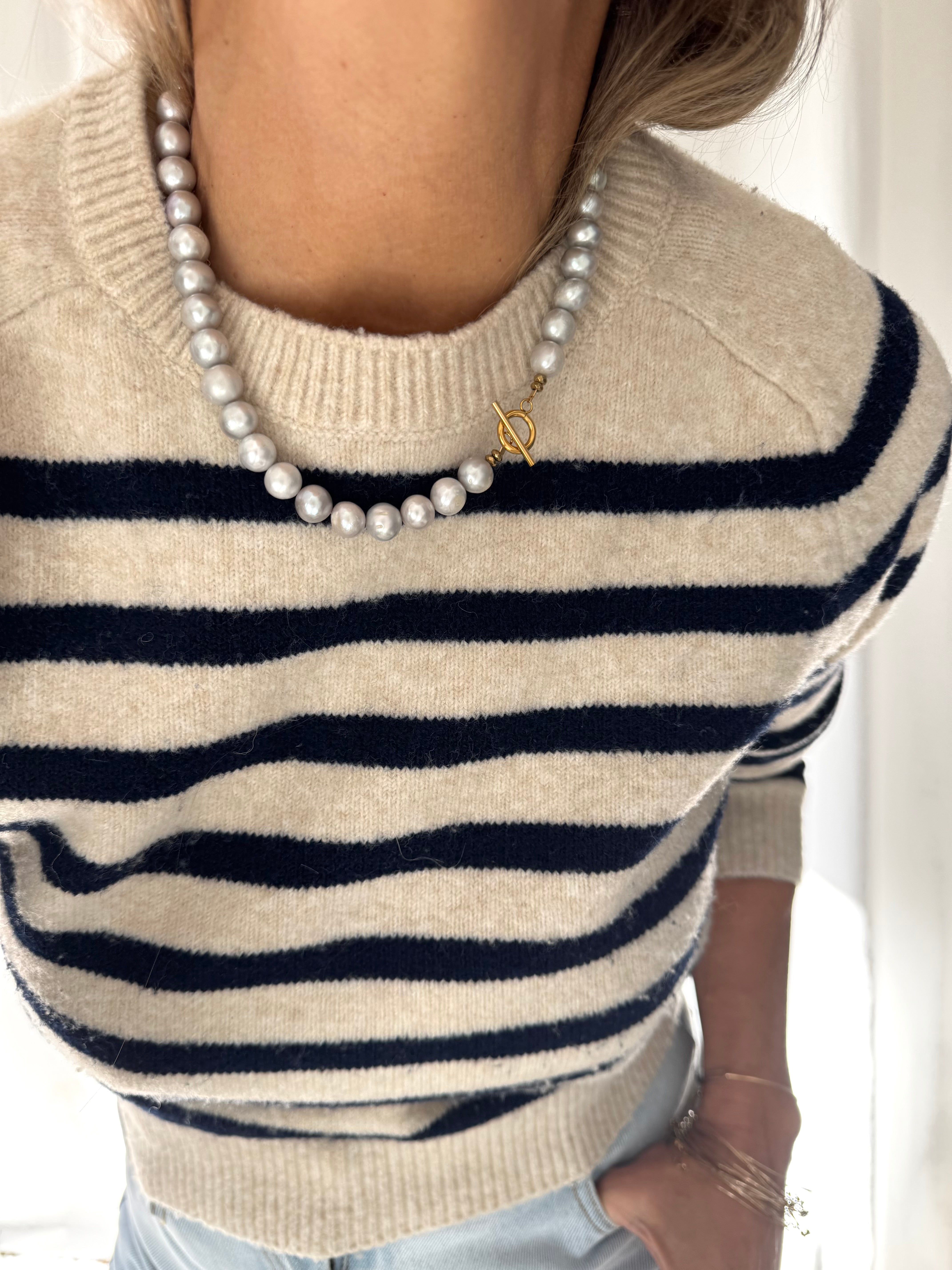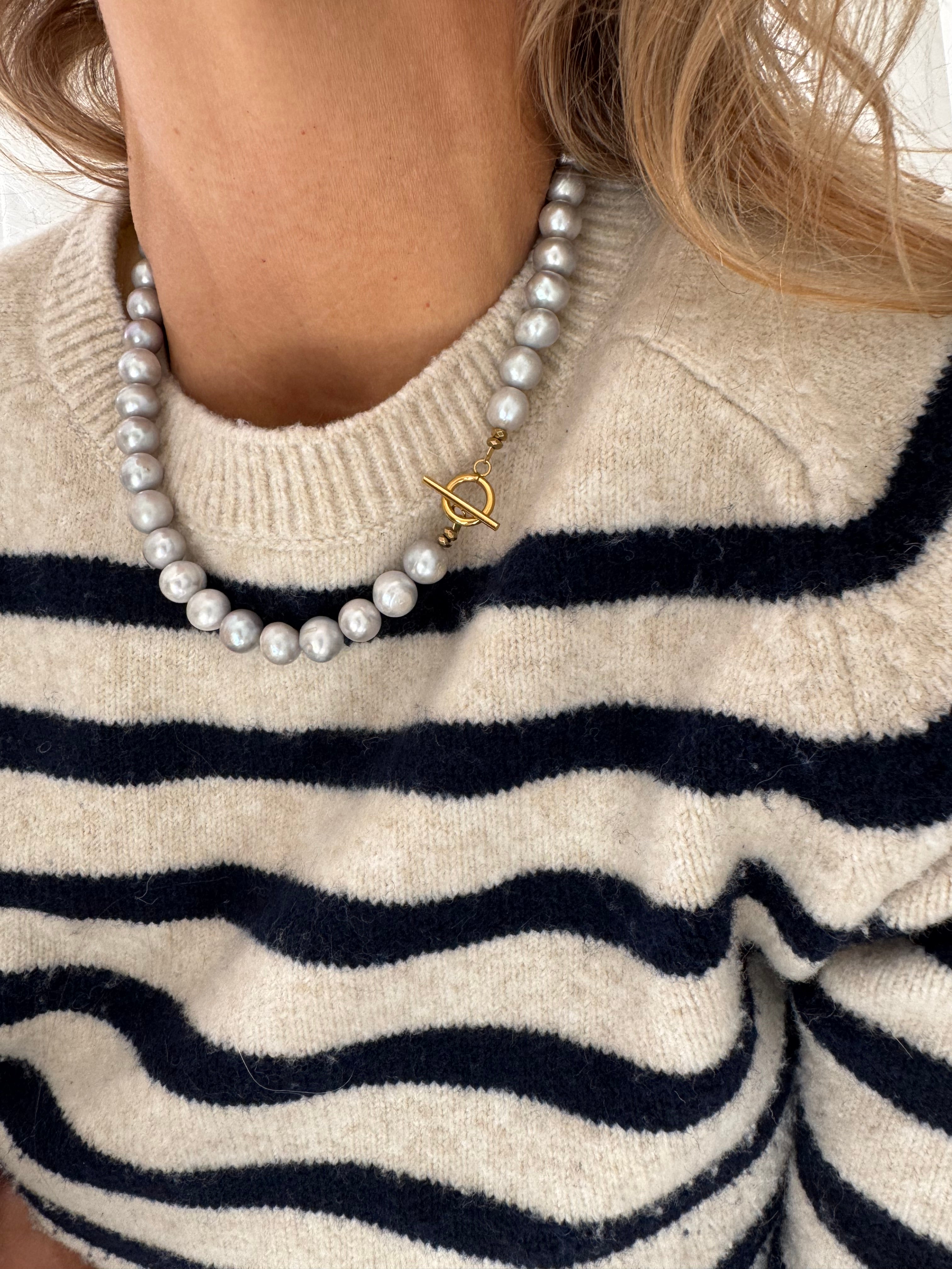 Collier en perles grises et fermoir T en acier inoxydable plaqué 18carats.