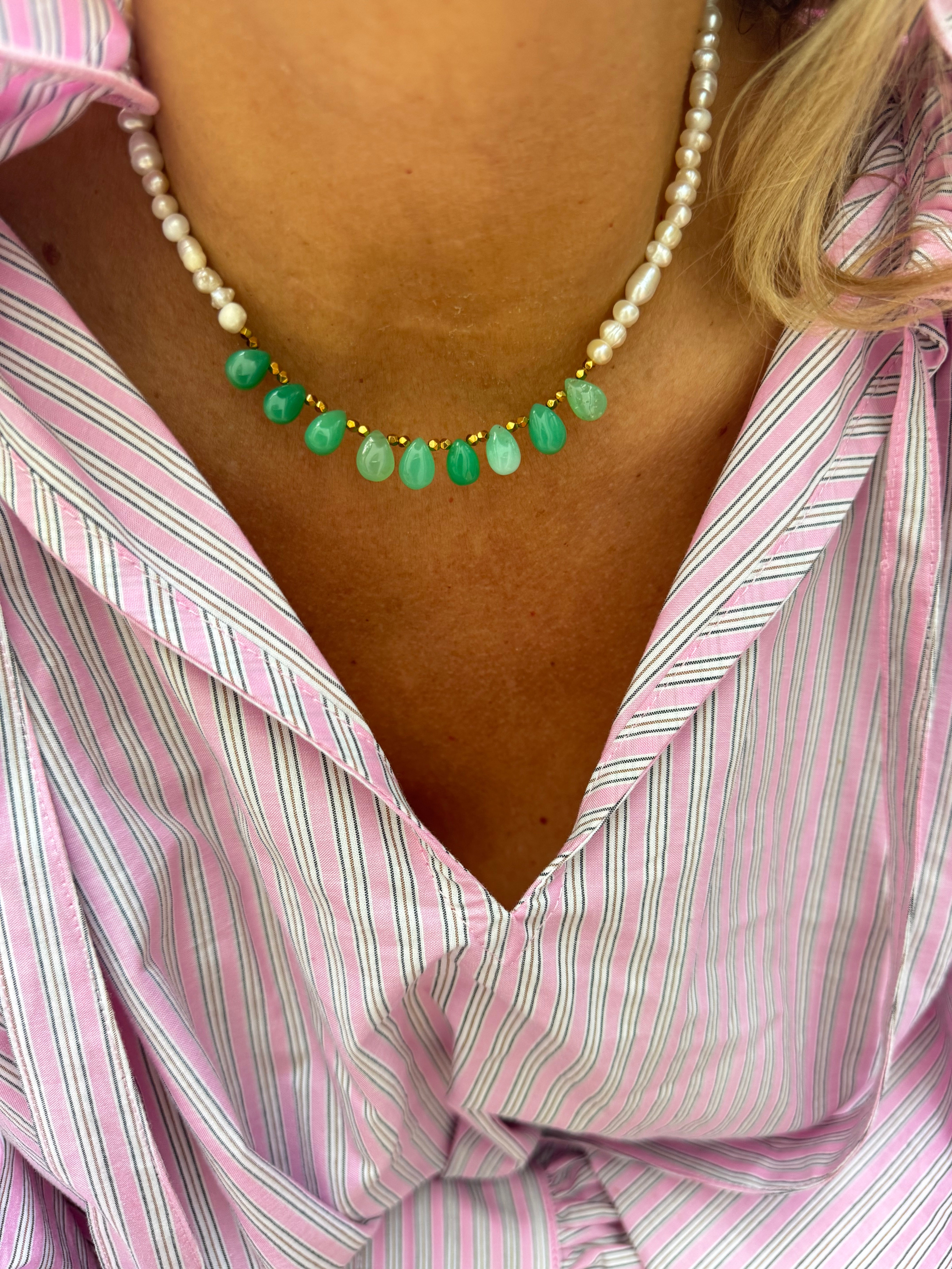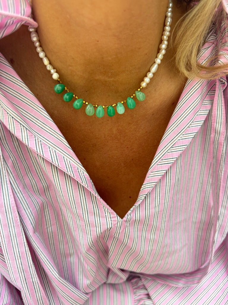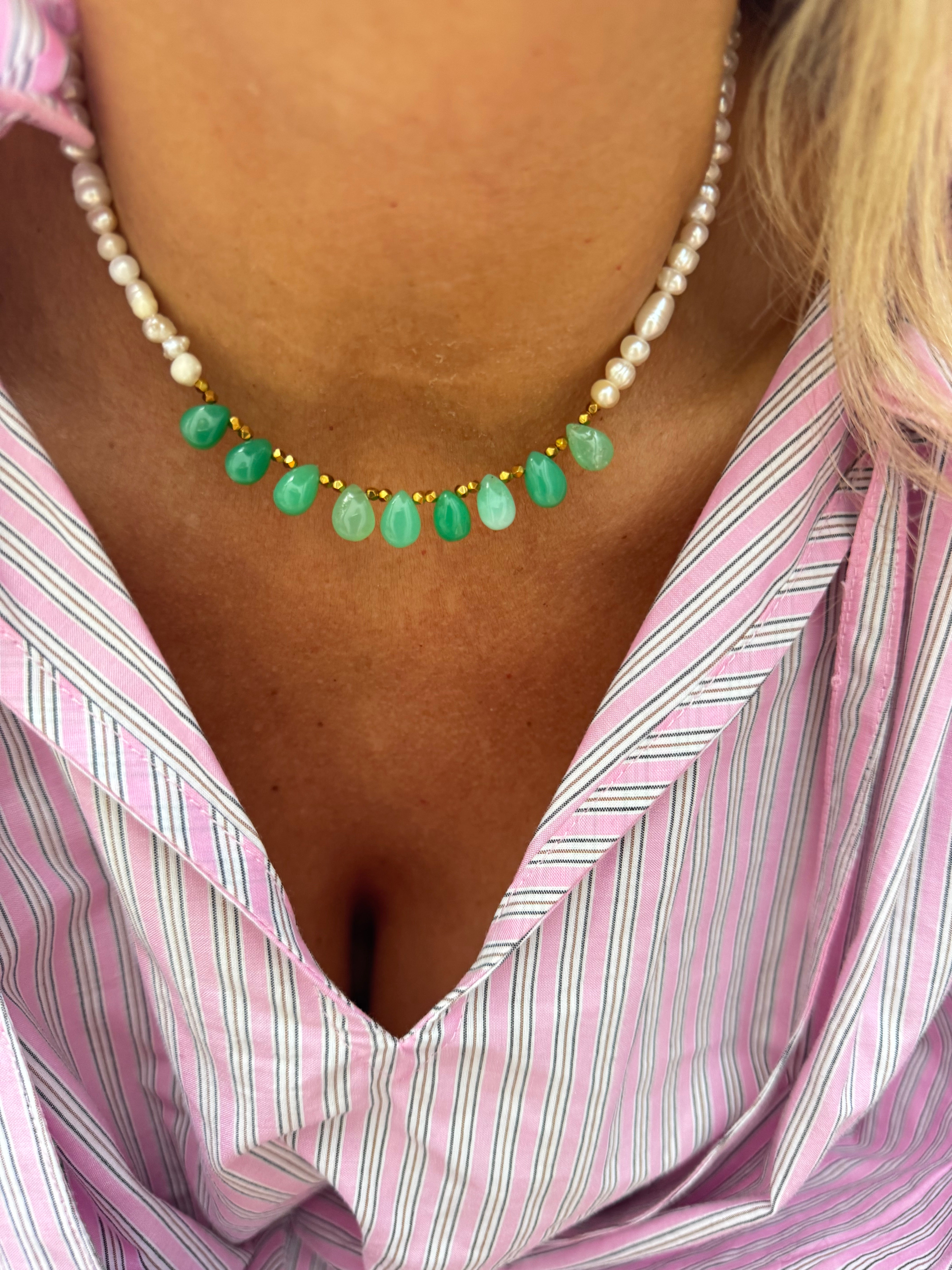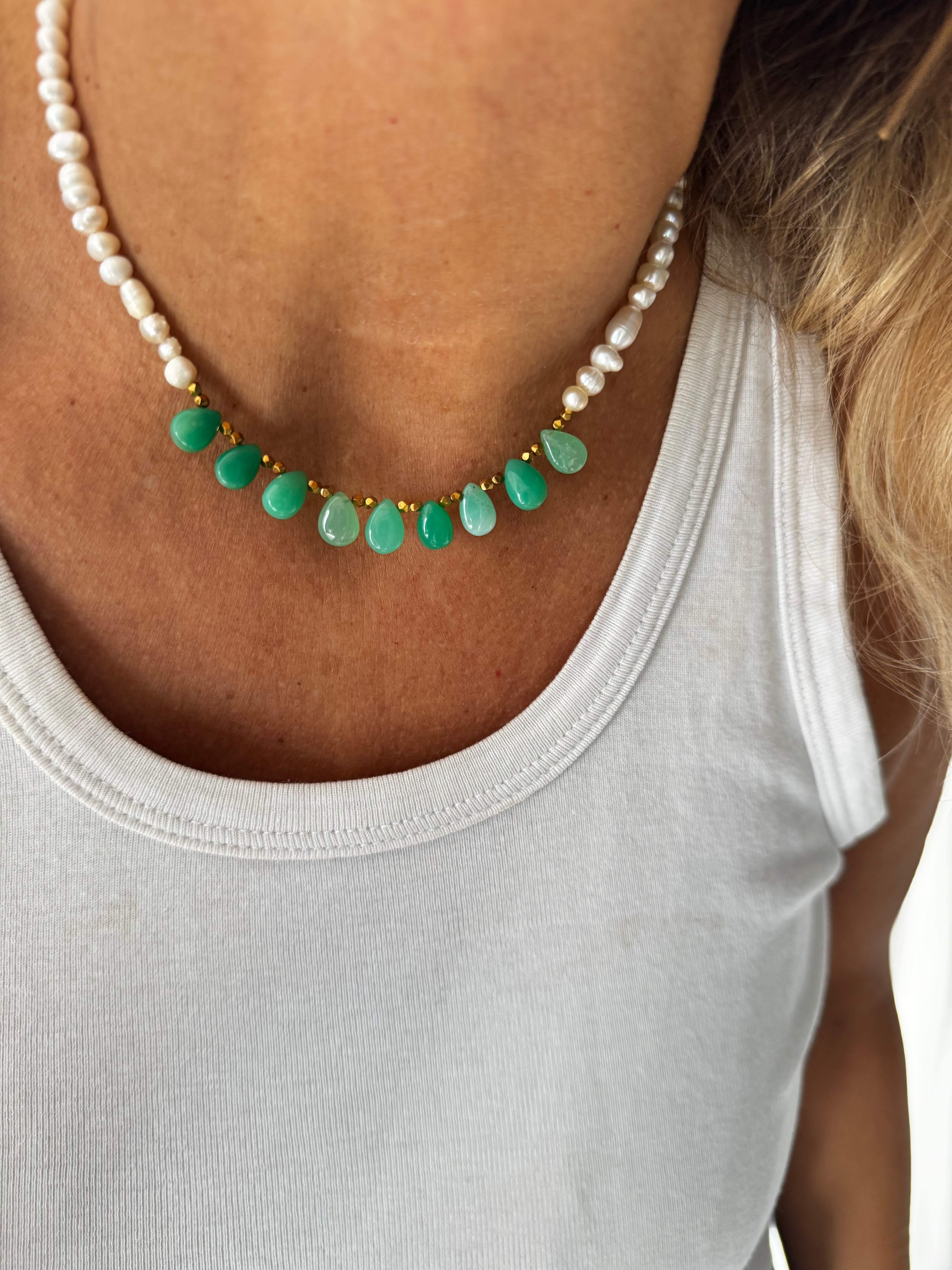 Collier en perles d’eau douce irrégulières et au centre 9 briolettes facetées en Chrysoprase chacune séparées par des perles en hématites.