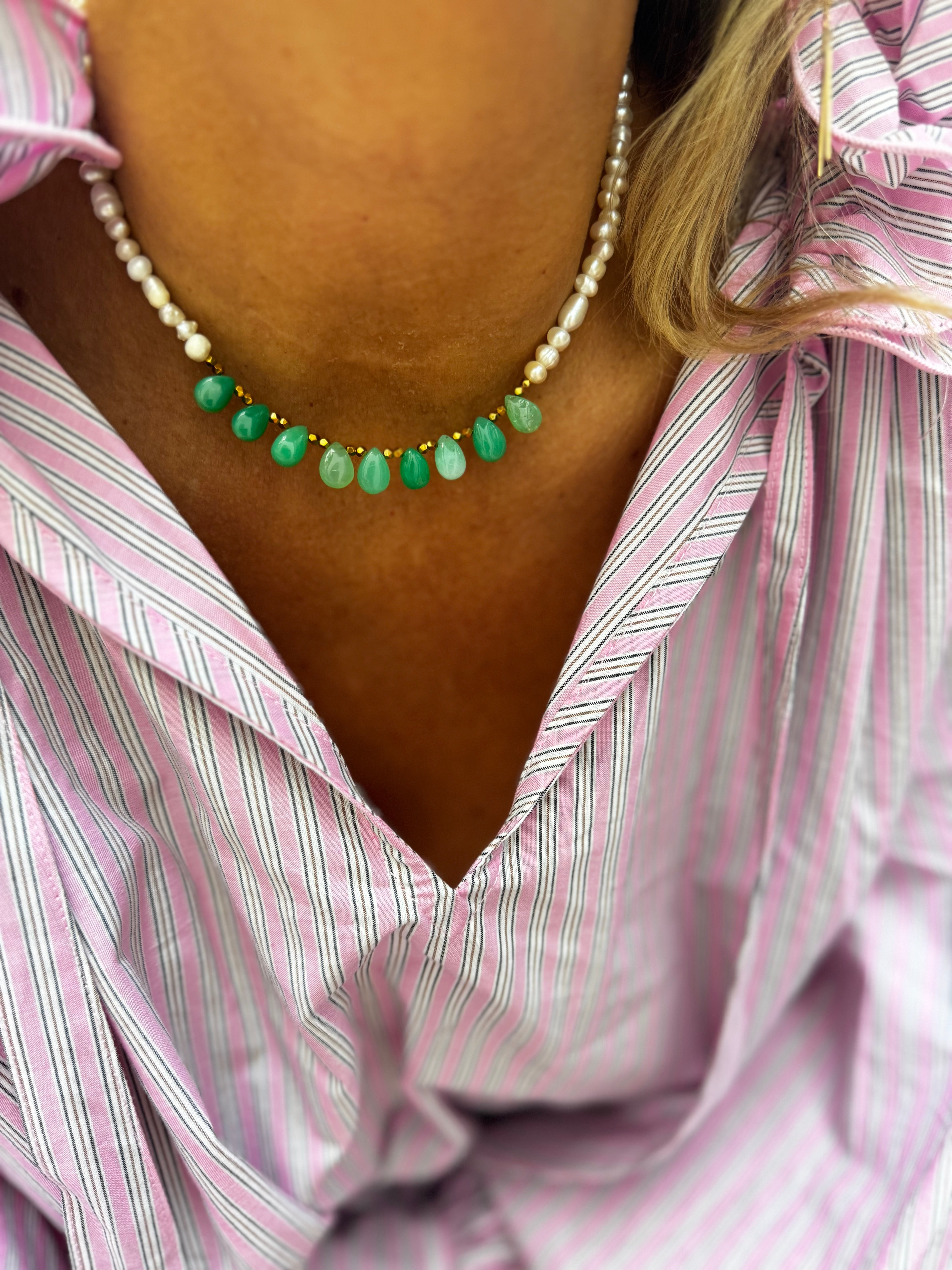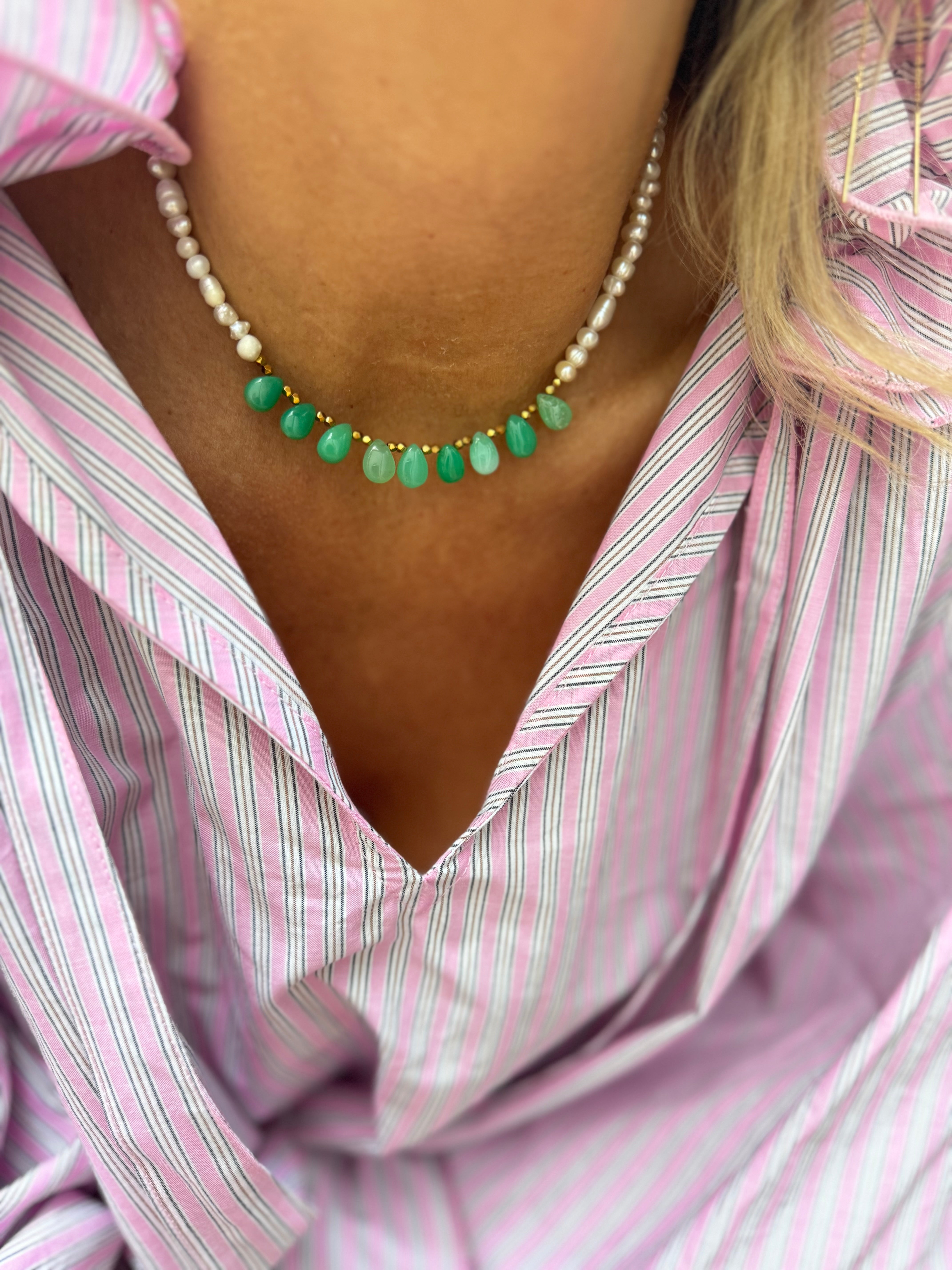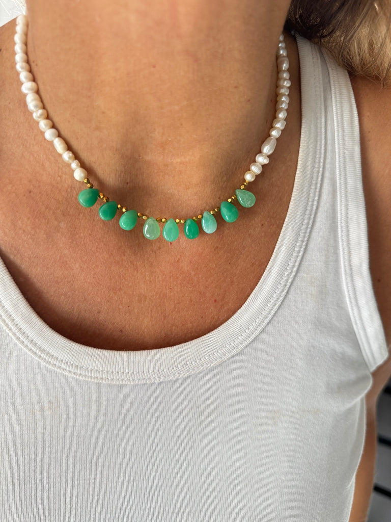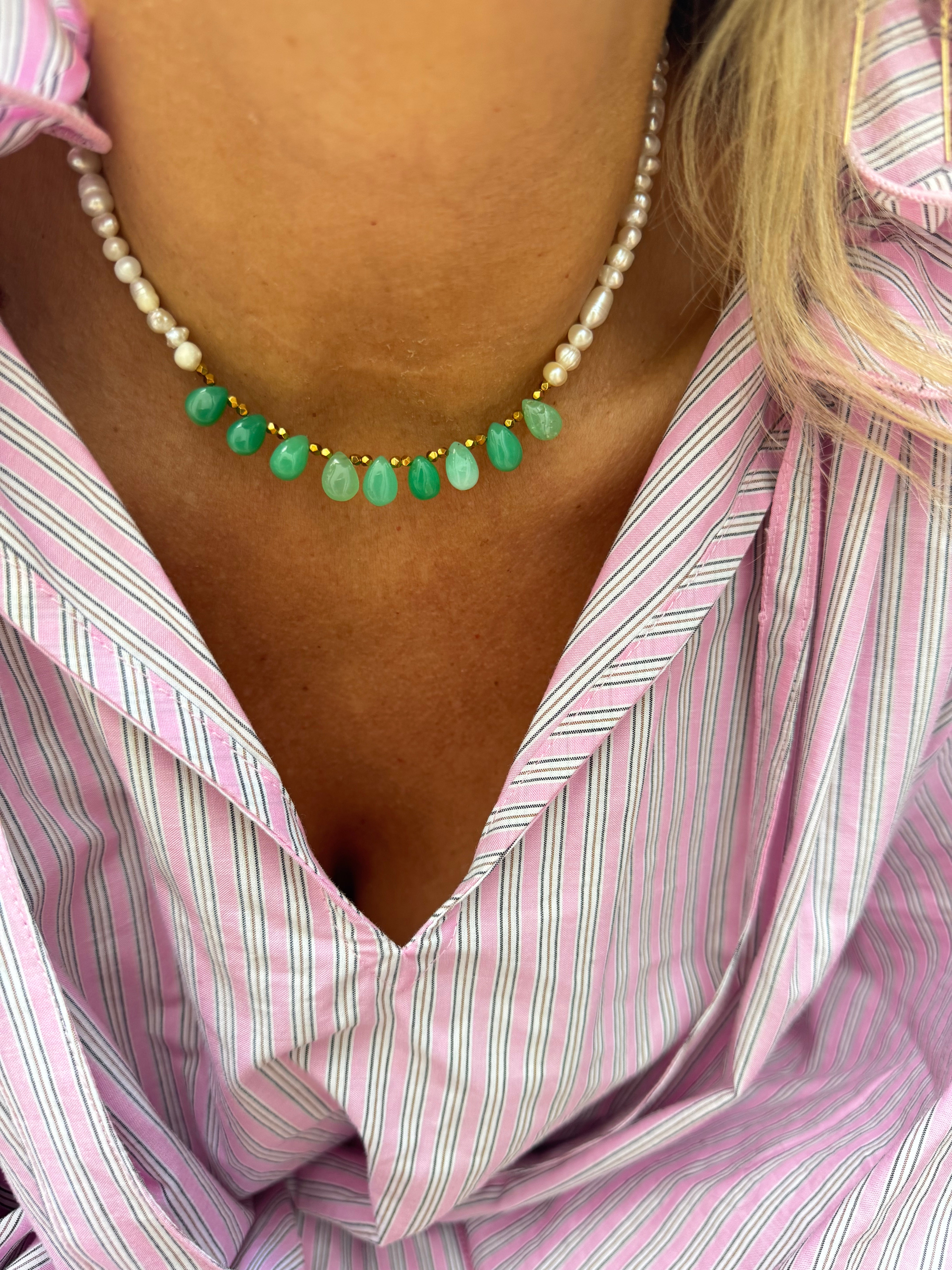 Collier en perles d’eau douce irrégulières et au centre 9 briolettes facetées en Chrysoprase chacune séparées par des perles en hématites.
