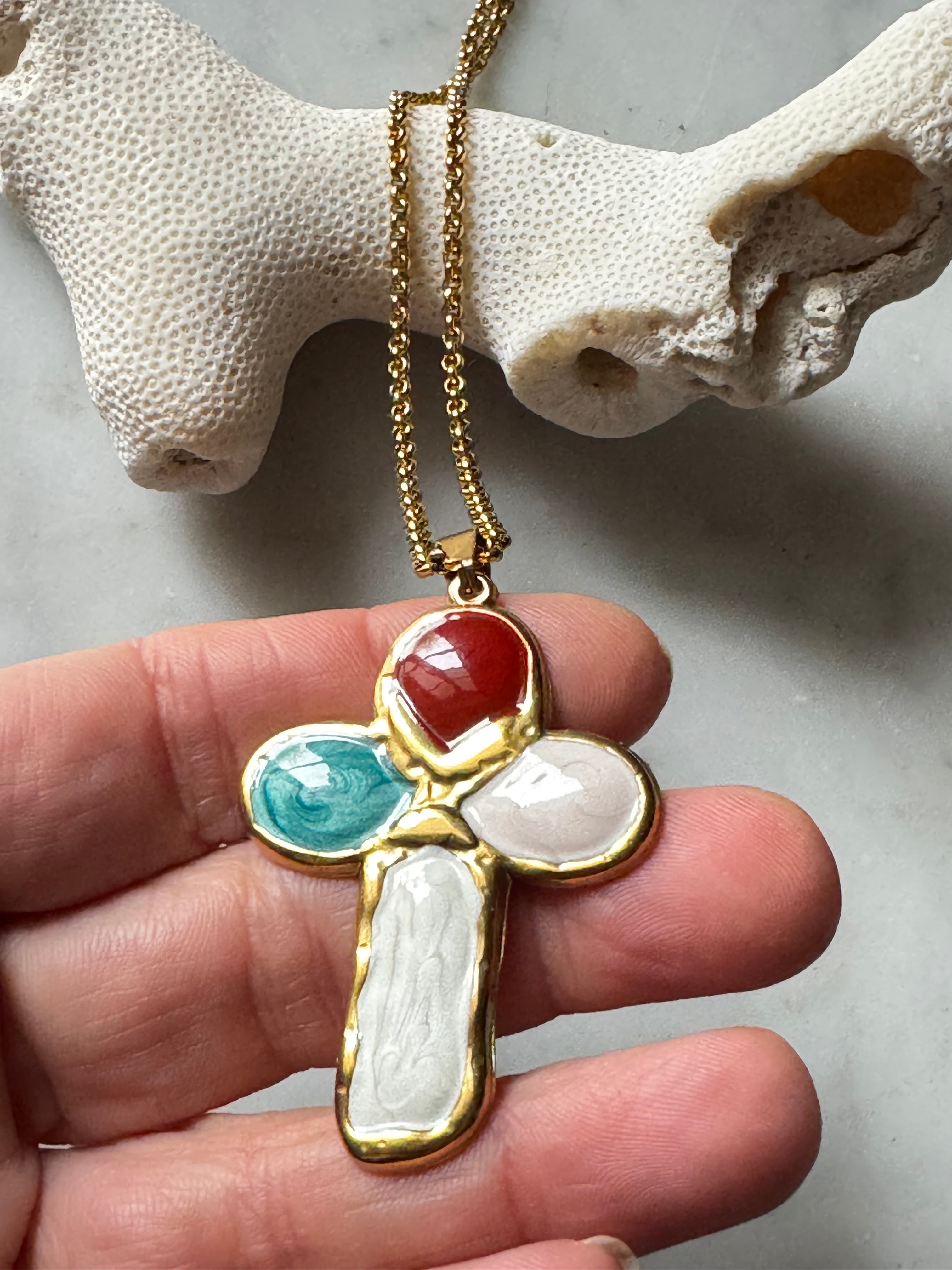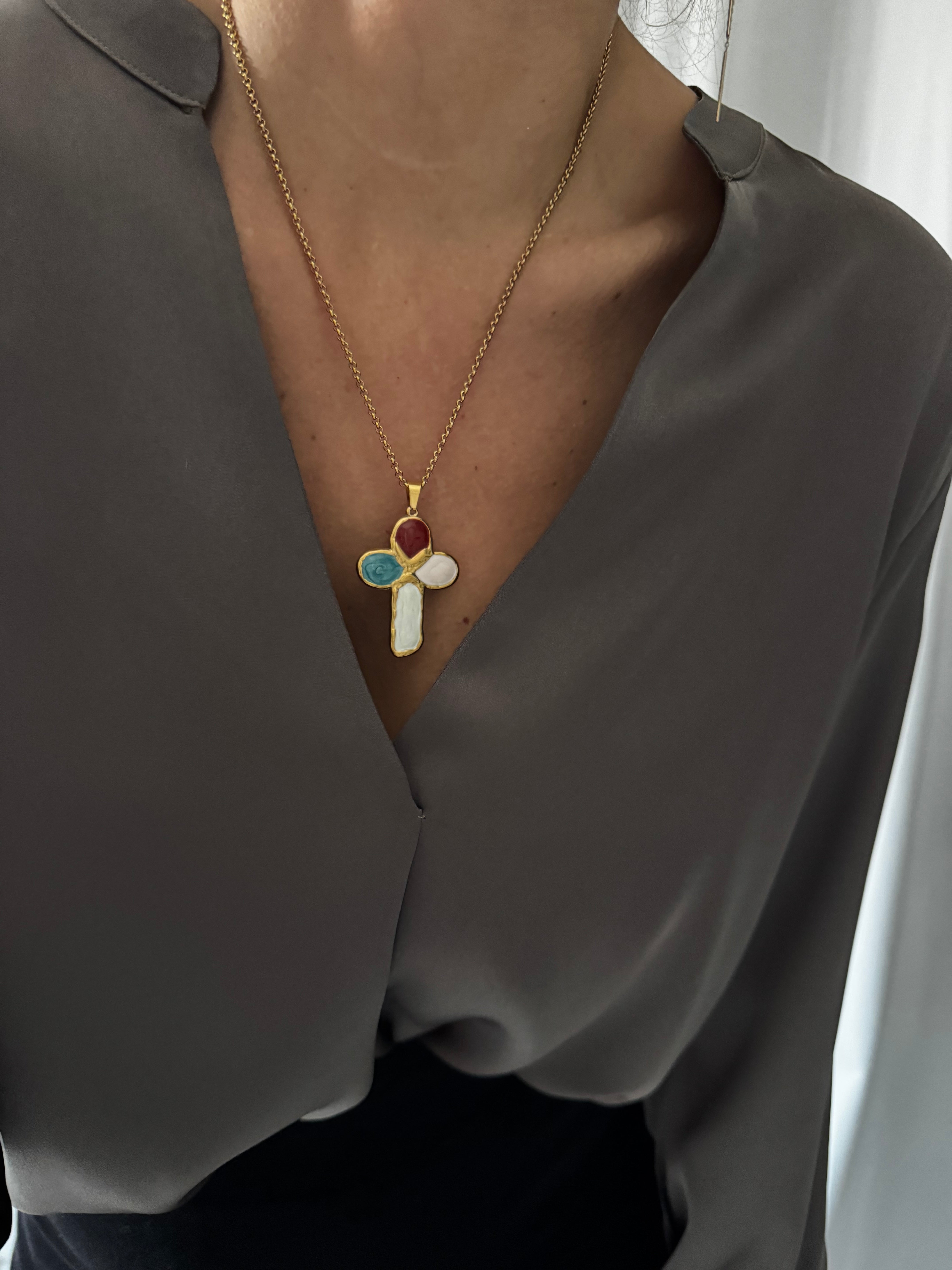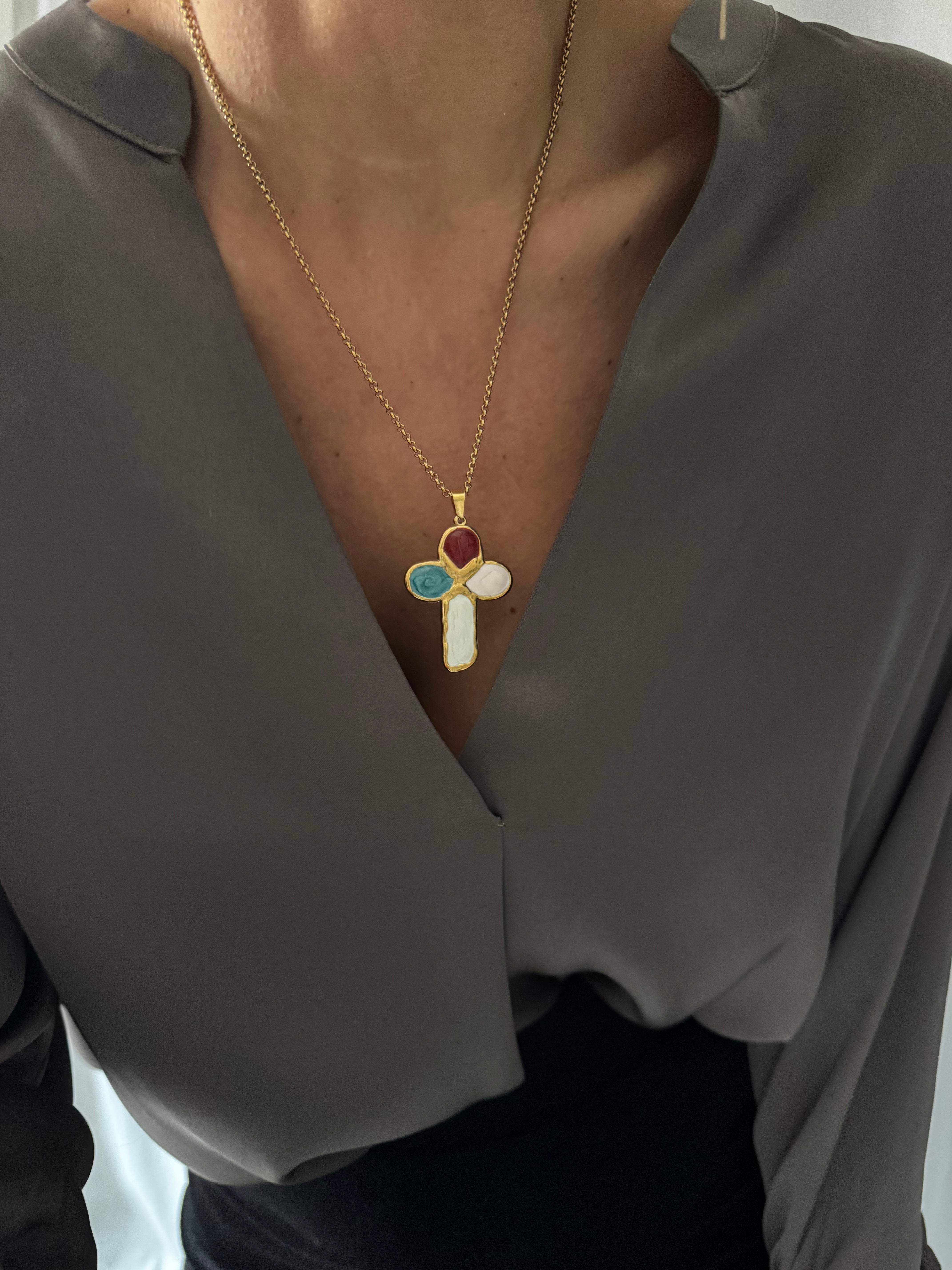 Magnifique croix en acier inoxydable et émail coloré montée sur une chaîne également en acier inoxydable !