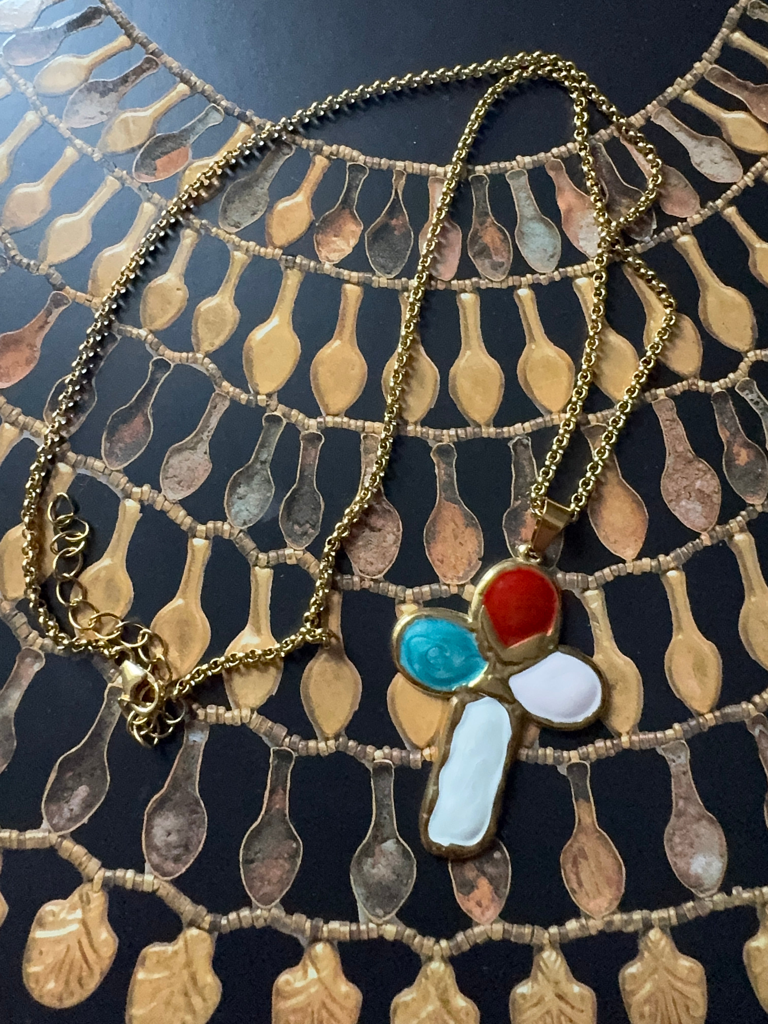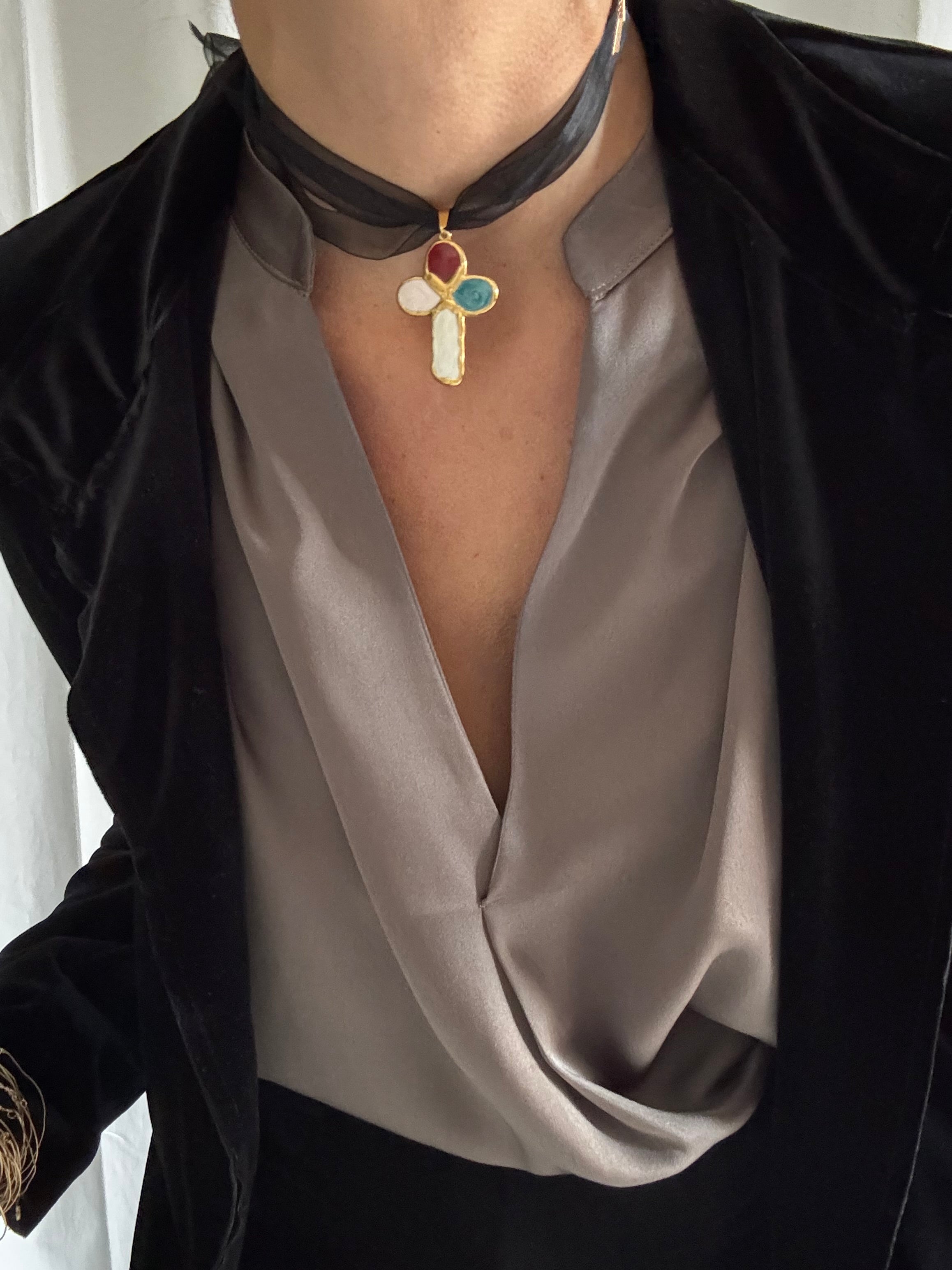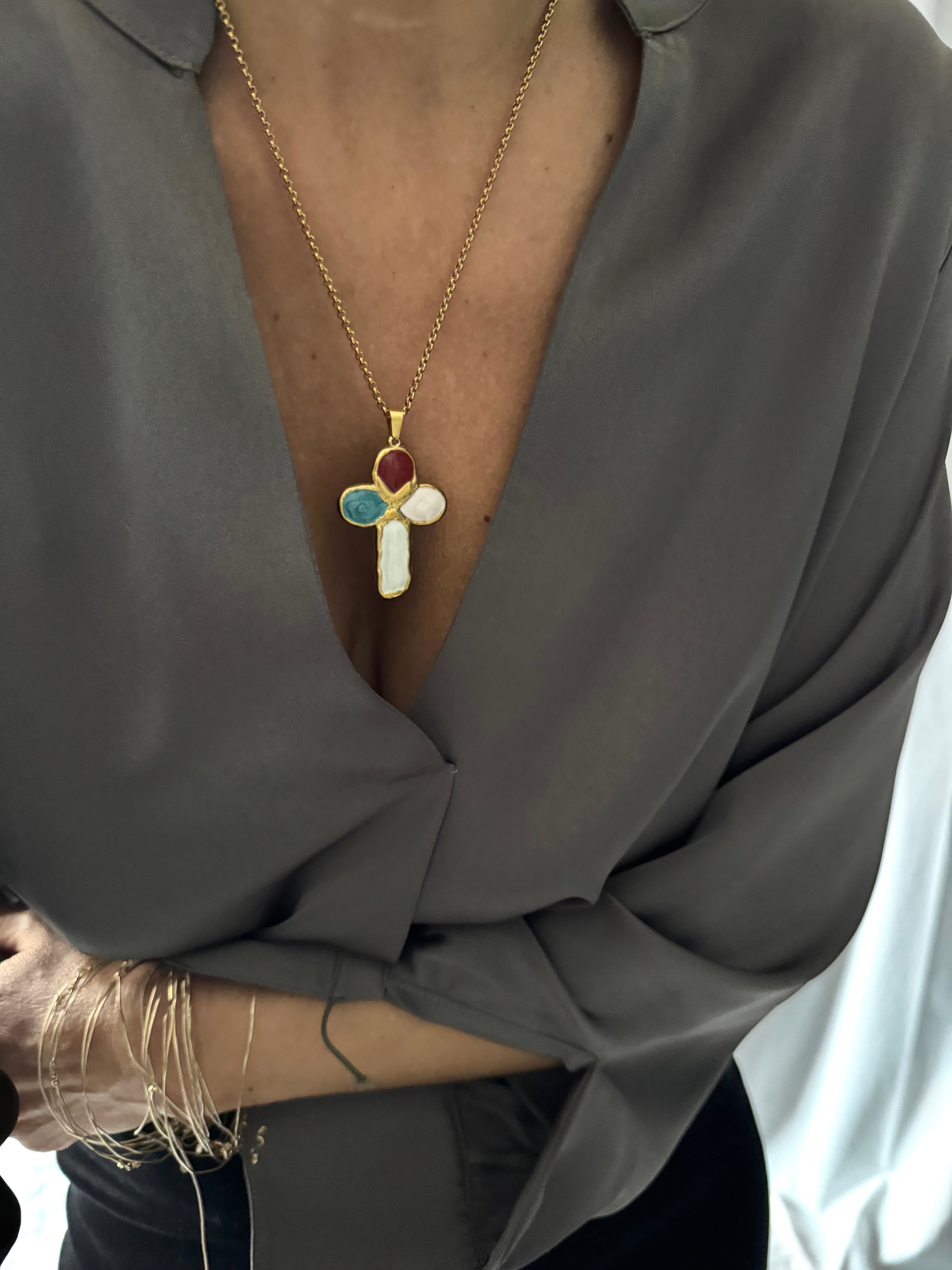 Magnifique croix en acier inoxydable et émail coloré montée sur une chaîne également en acier inoxydable !