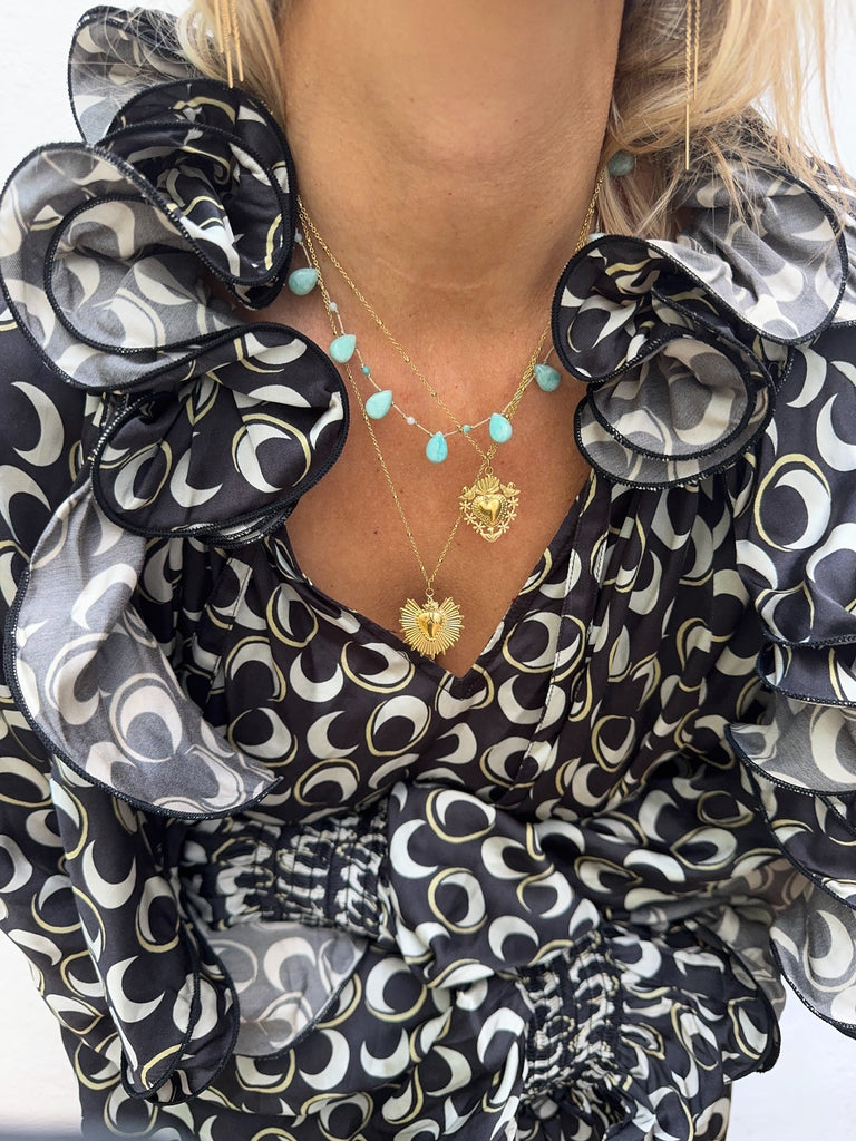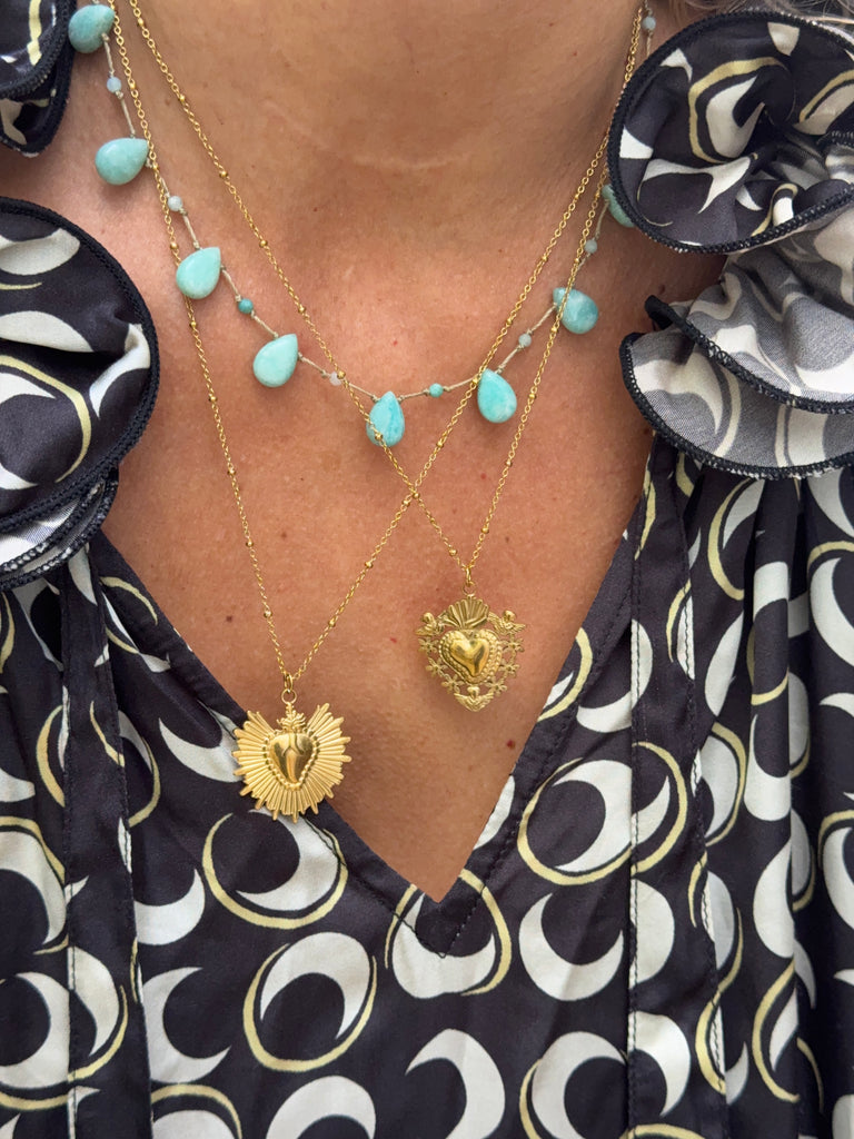 Collier chaîne fine à boules en acier inoxydable plaqué 18carats et pendentif Sacré Cœur.