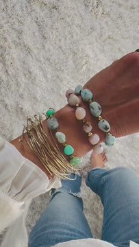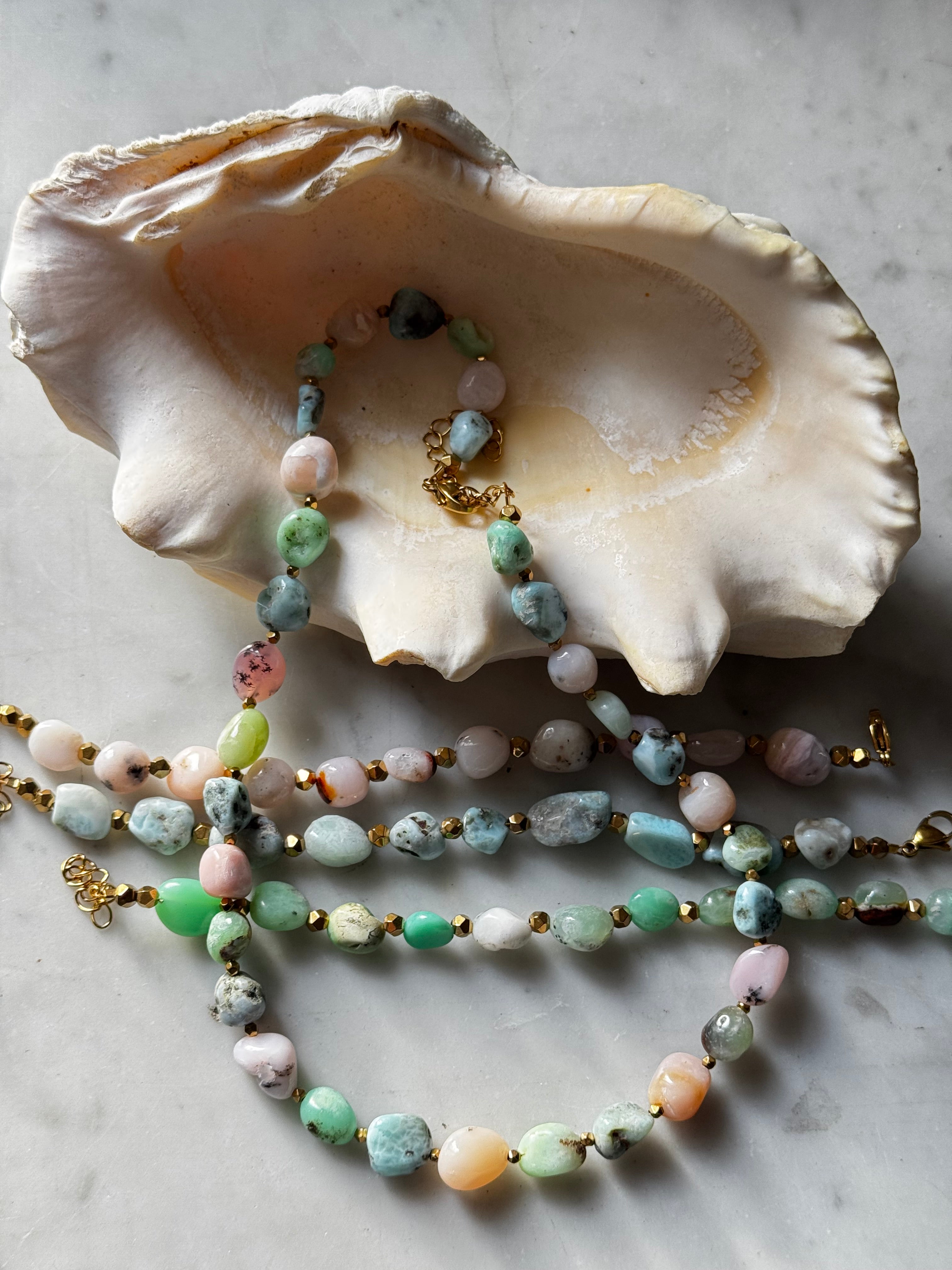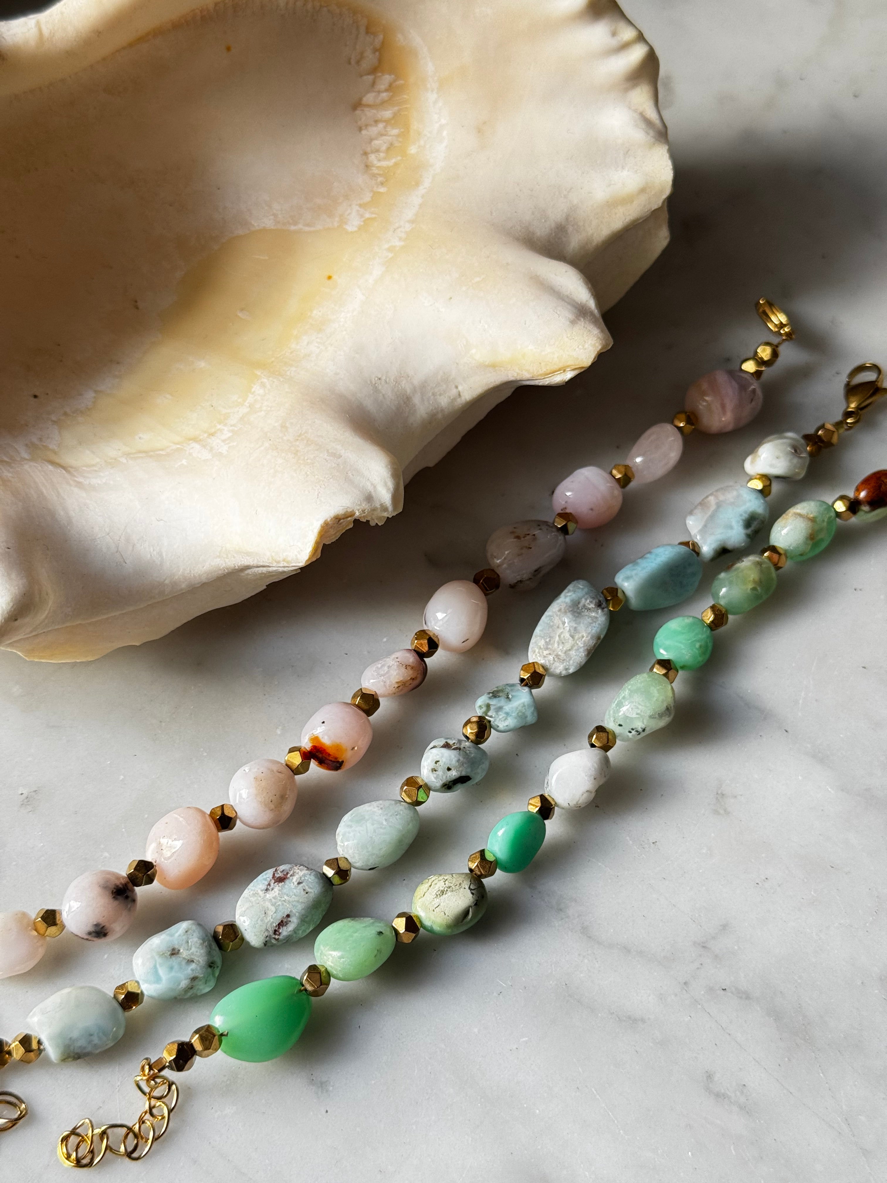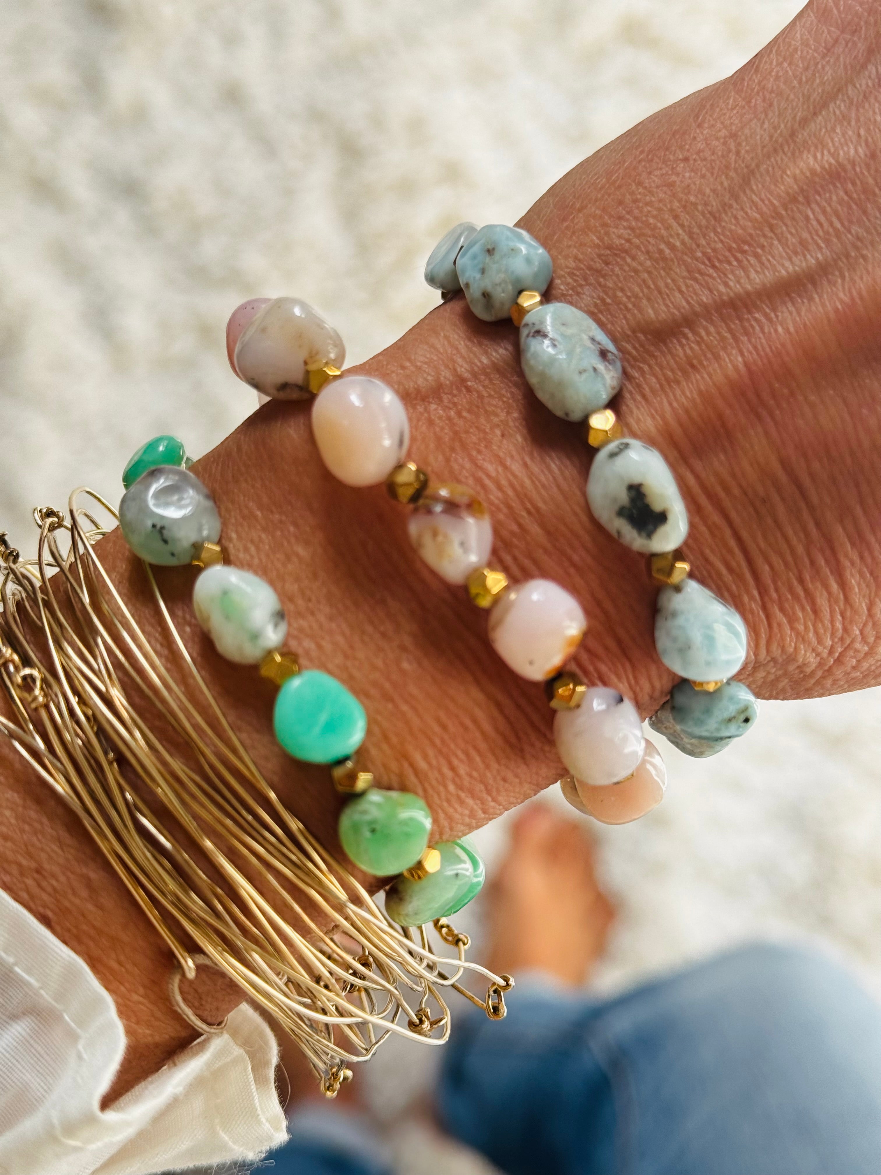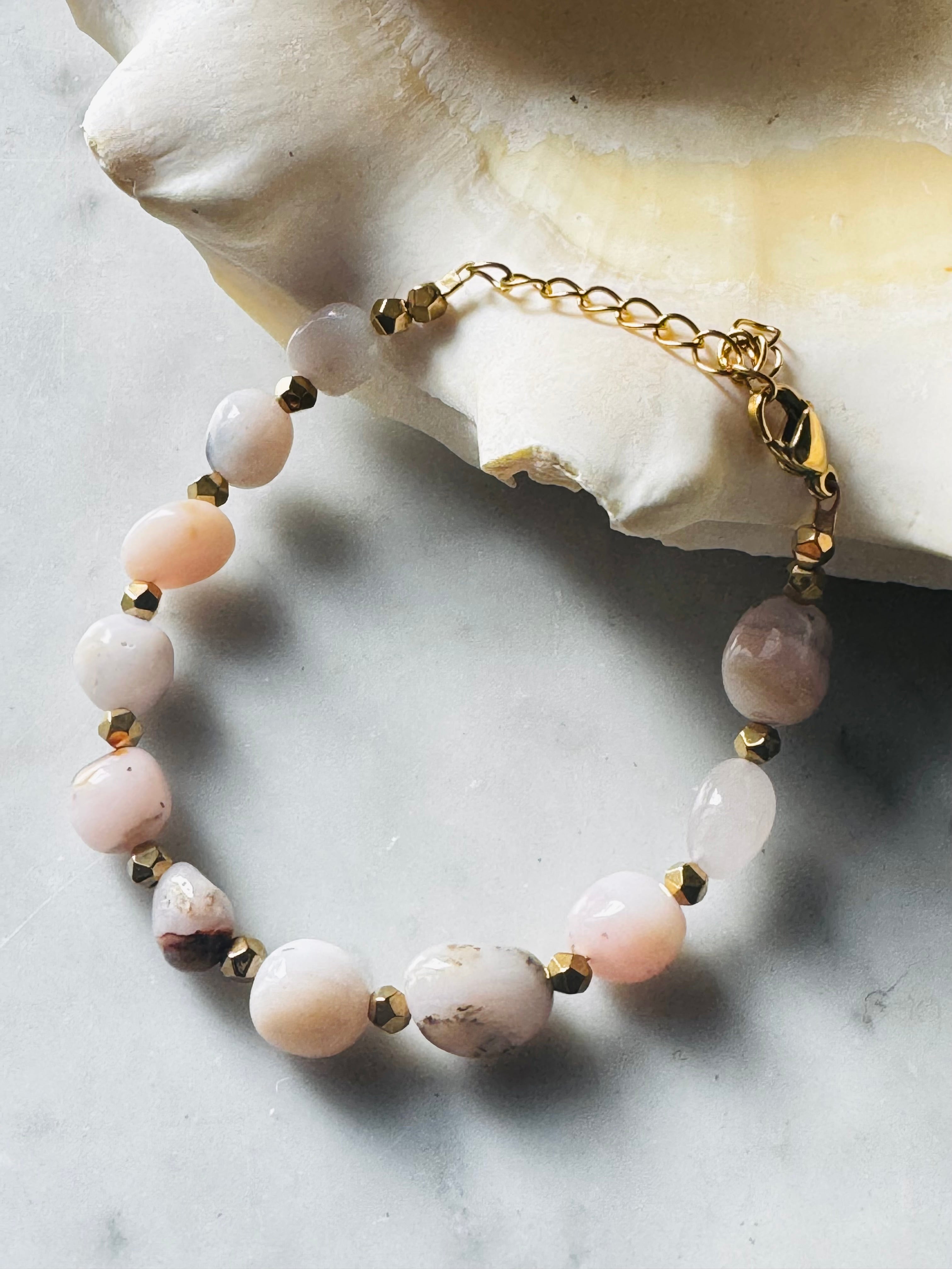 Bracelet en pierres naturelles d’Opale Rose ponctuées de perles dorées en hématite.