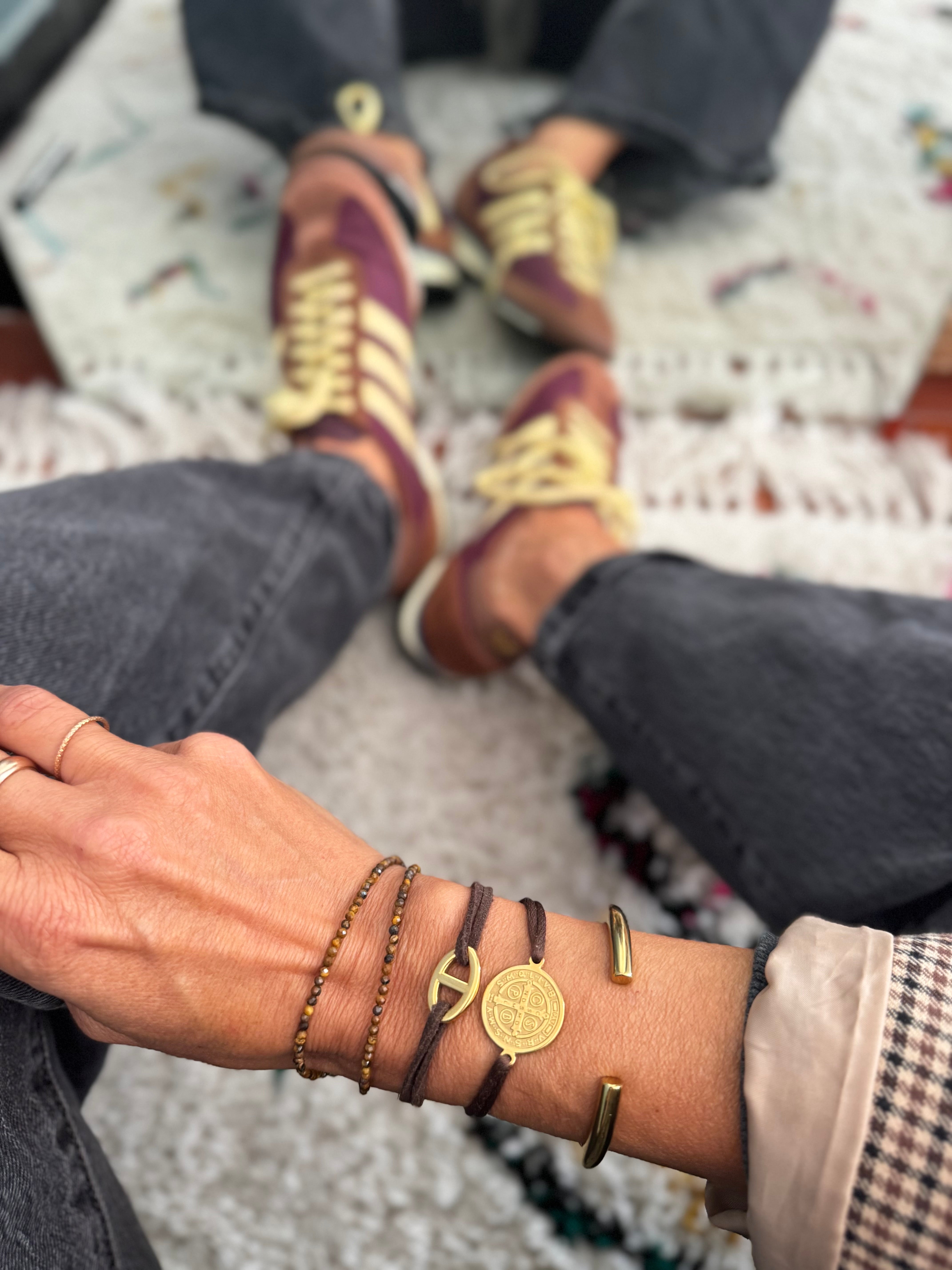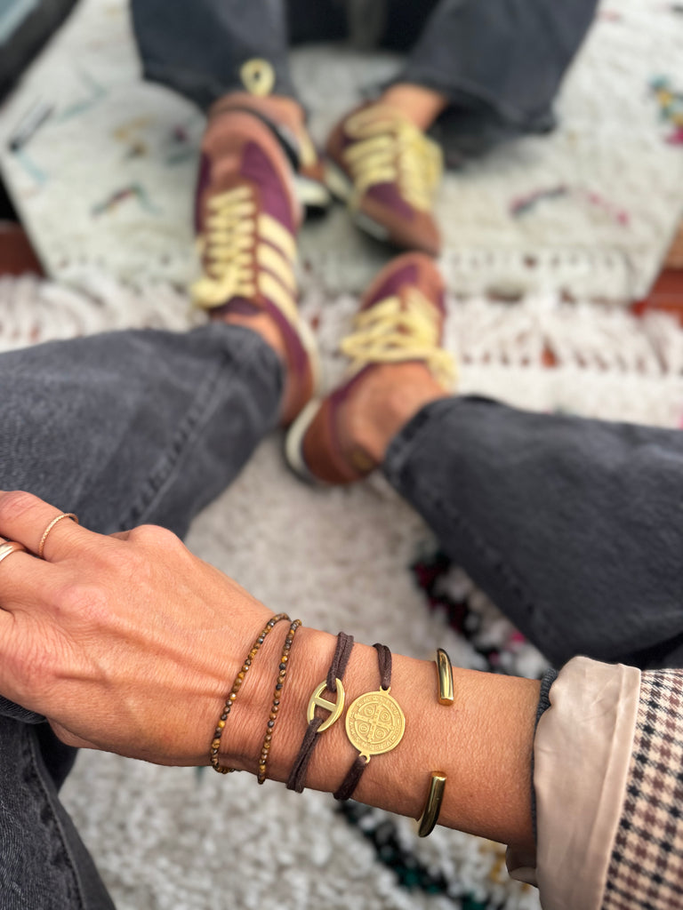 Superbe Bracelet avec médaille de Saint Benoit en acier inoxydable montée sur un lien marron se réglant par deux noeuds coulissants