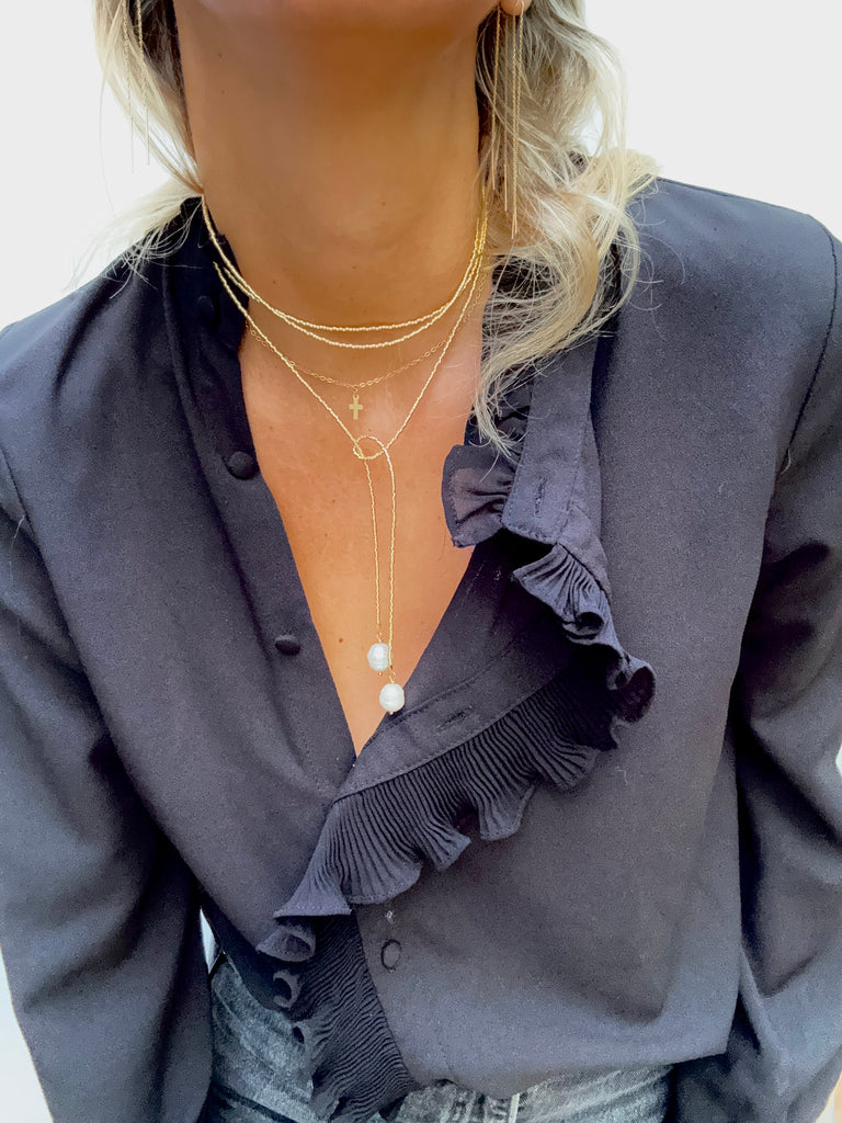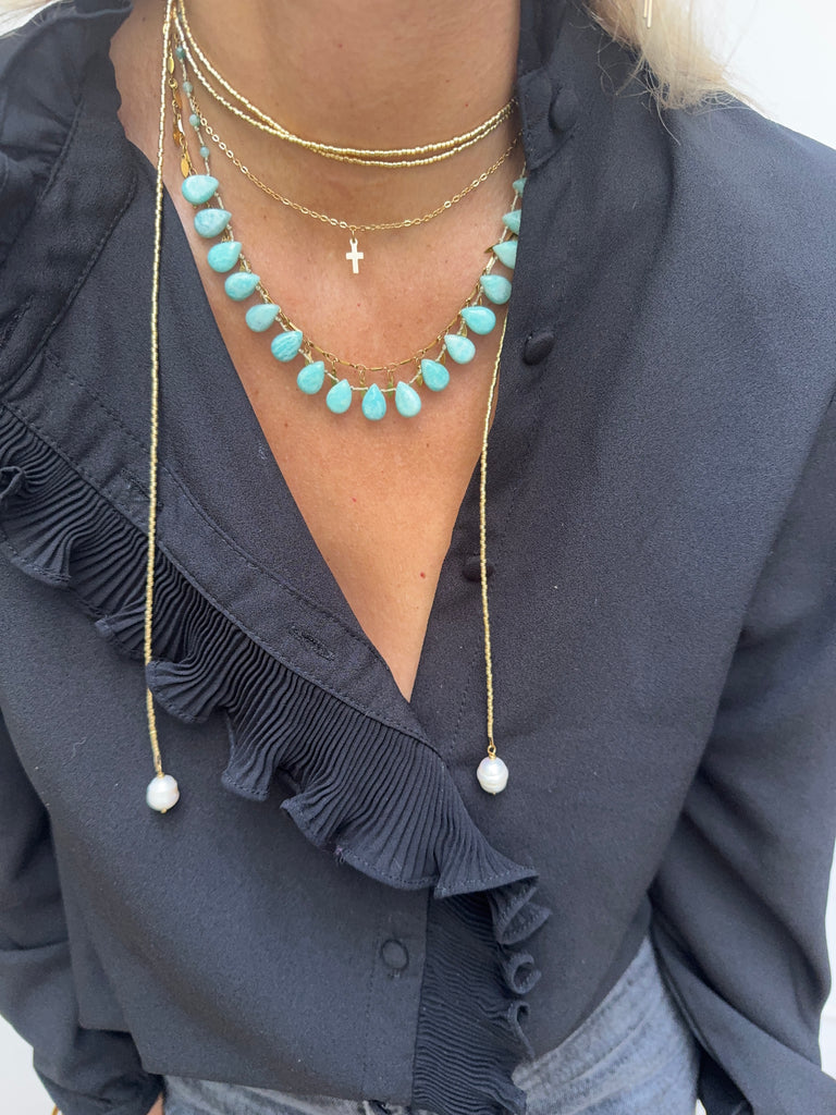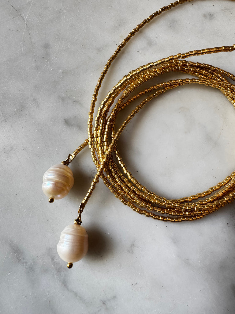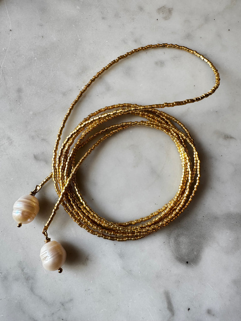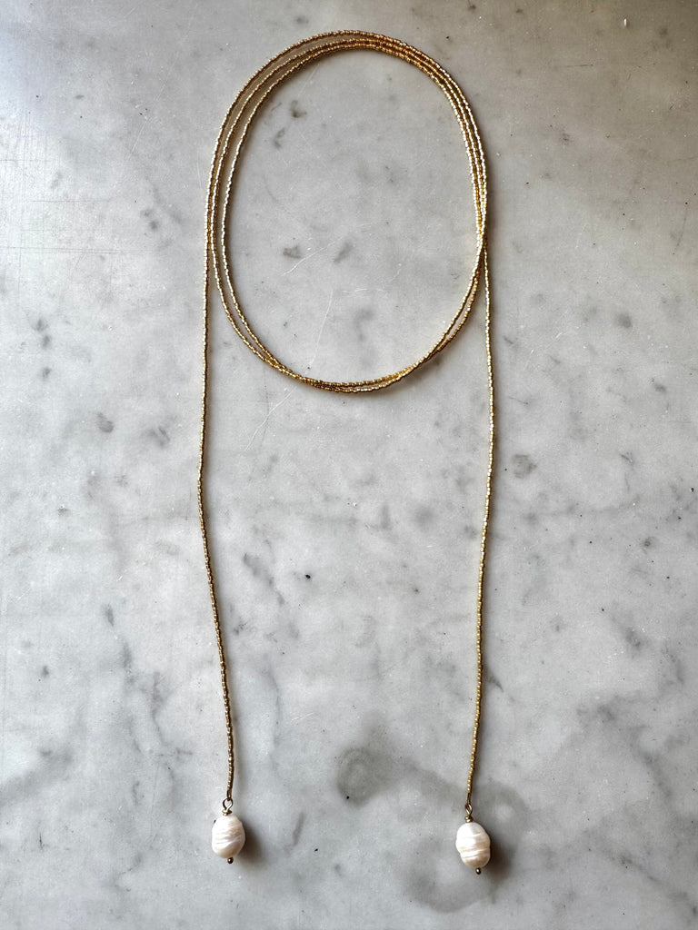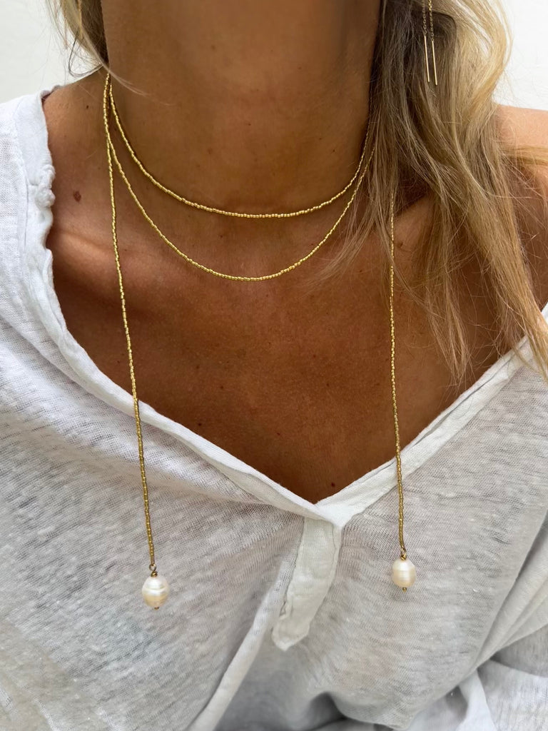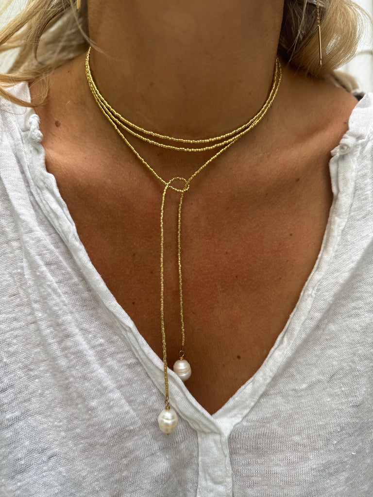 Collier très long en perles japonaises dorées terminé de chaque extrémité par une perle que vous pouvez nouer comme vous le souhaitez.