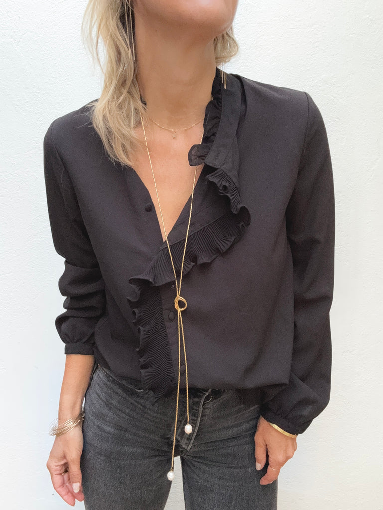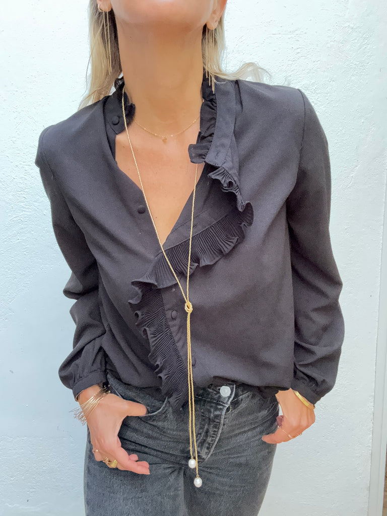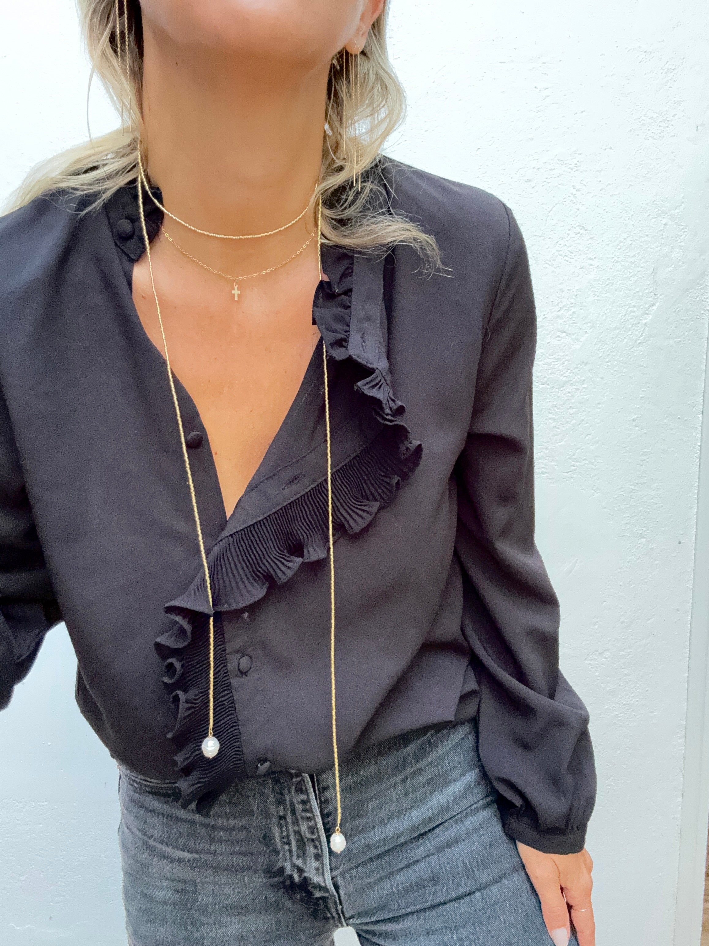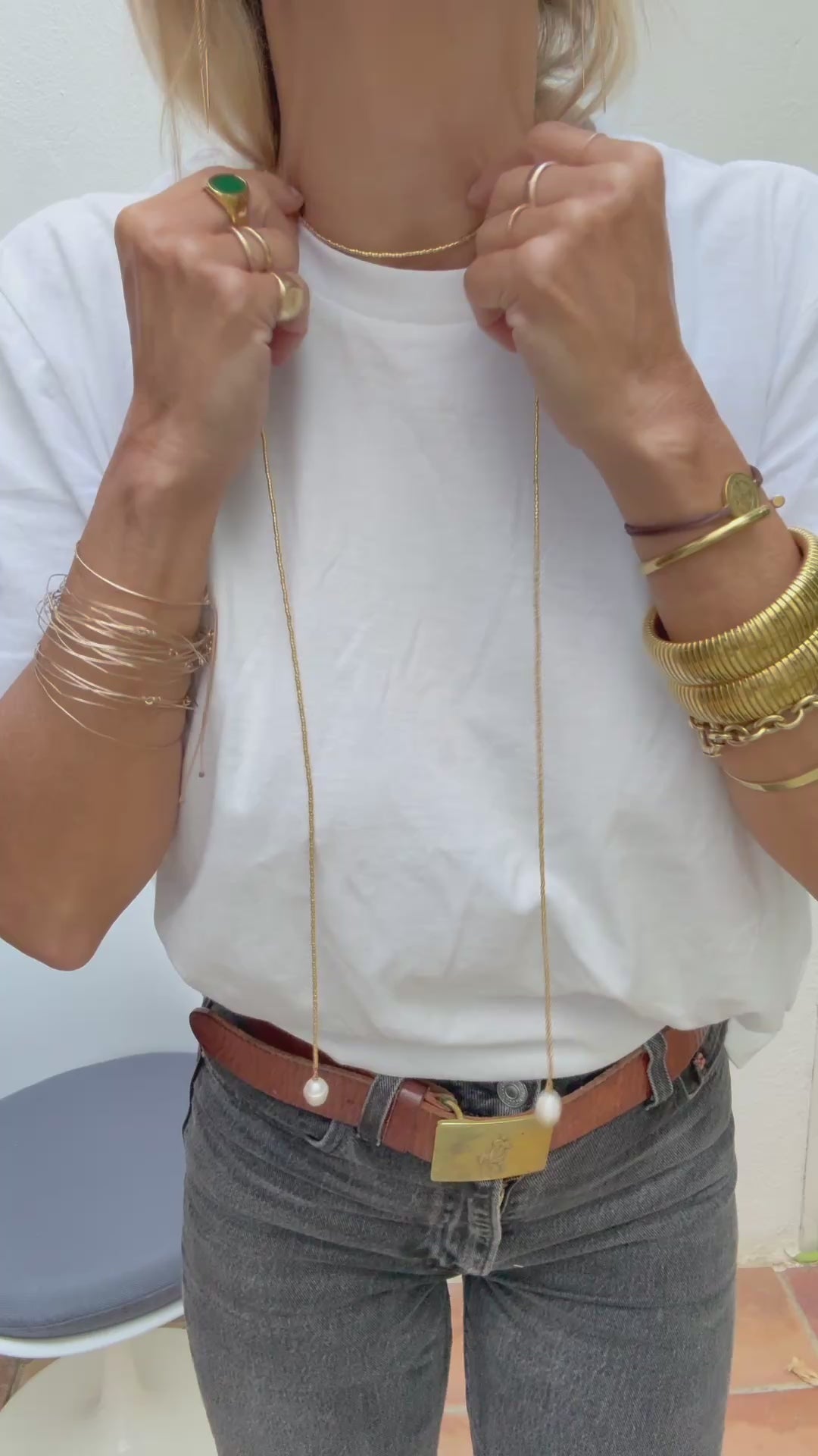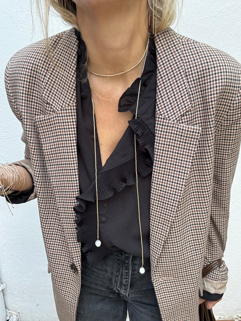 Collier très long en perles japonaises dorées terminé de chaque extrémité par une perle que vous pouvez nouer comme vous le souhaitez.