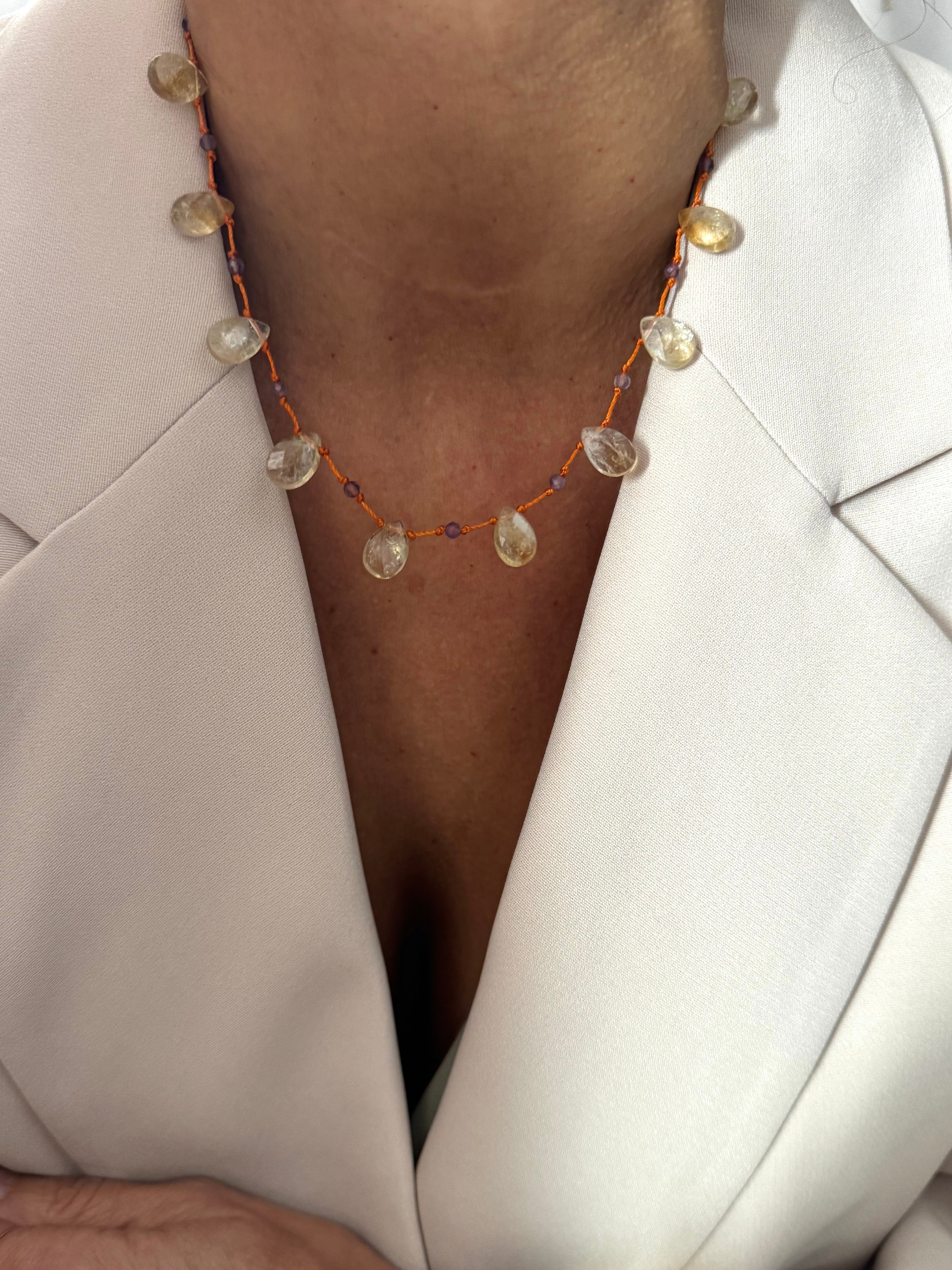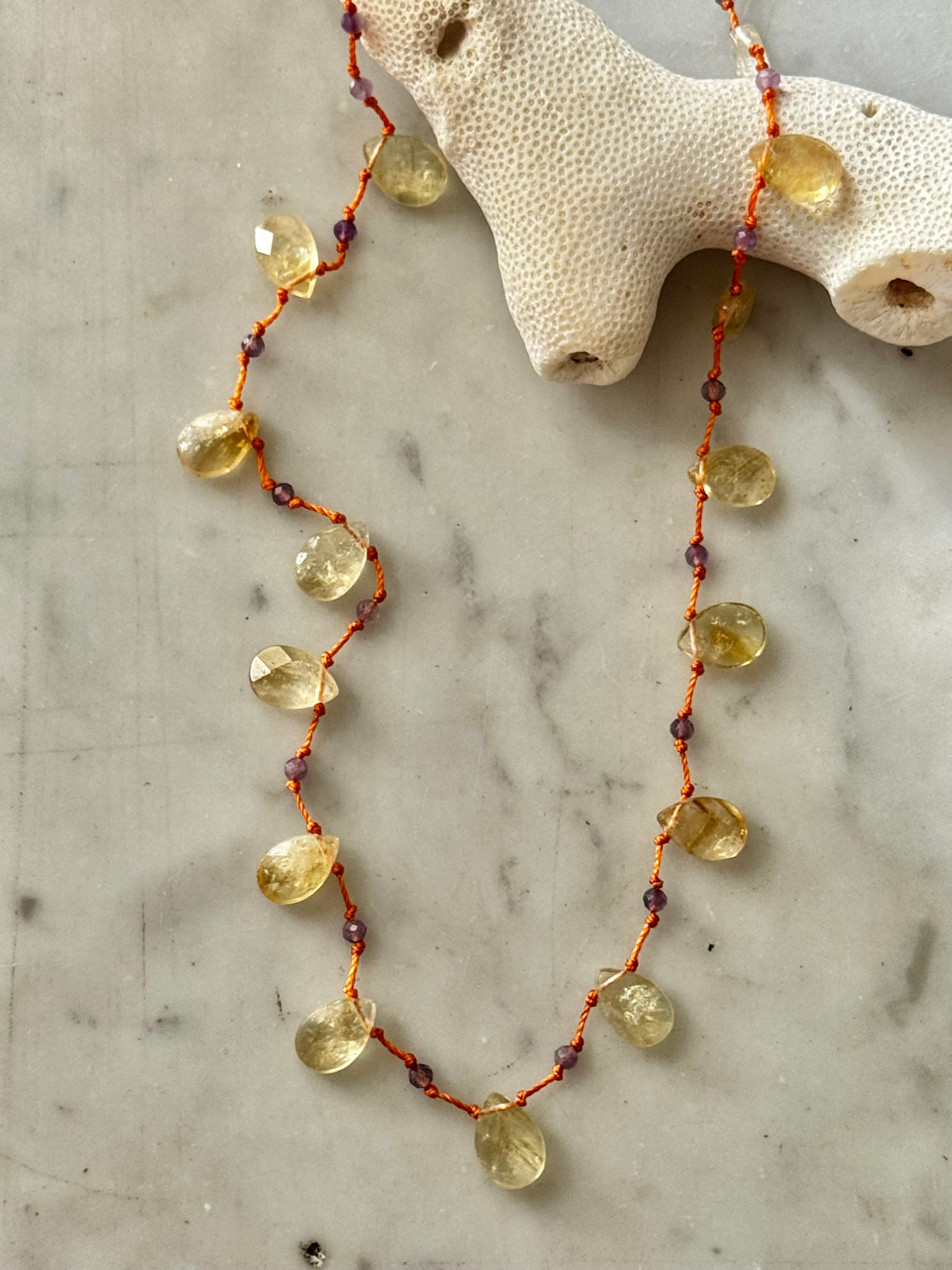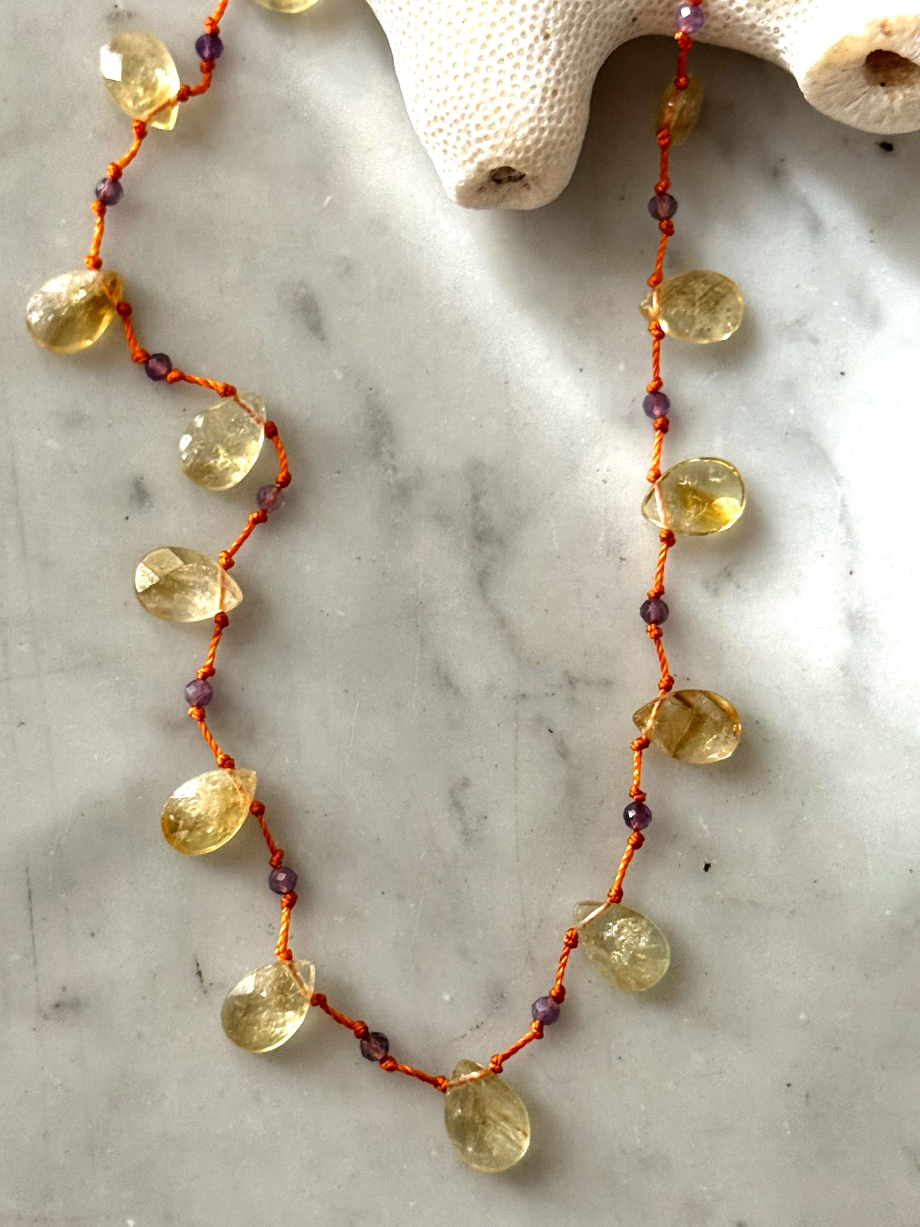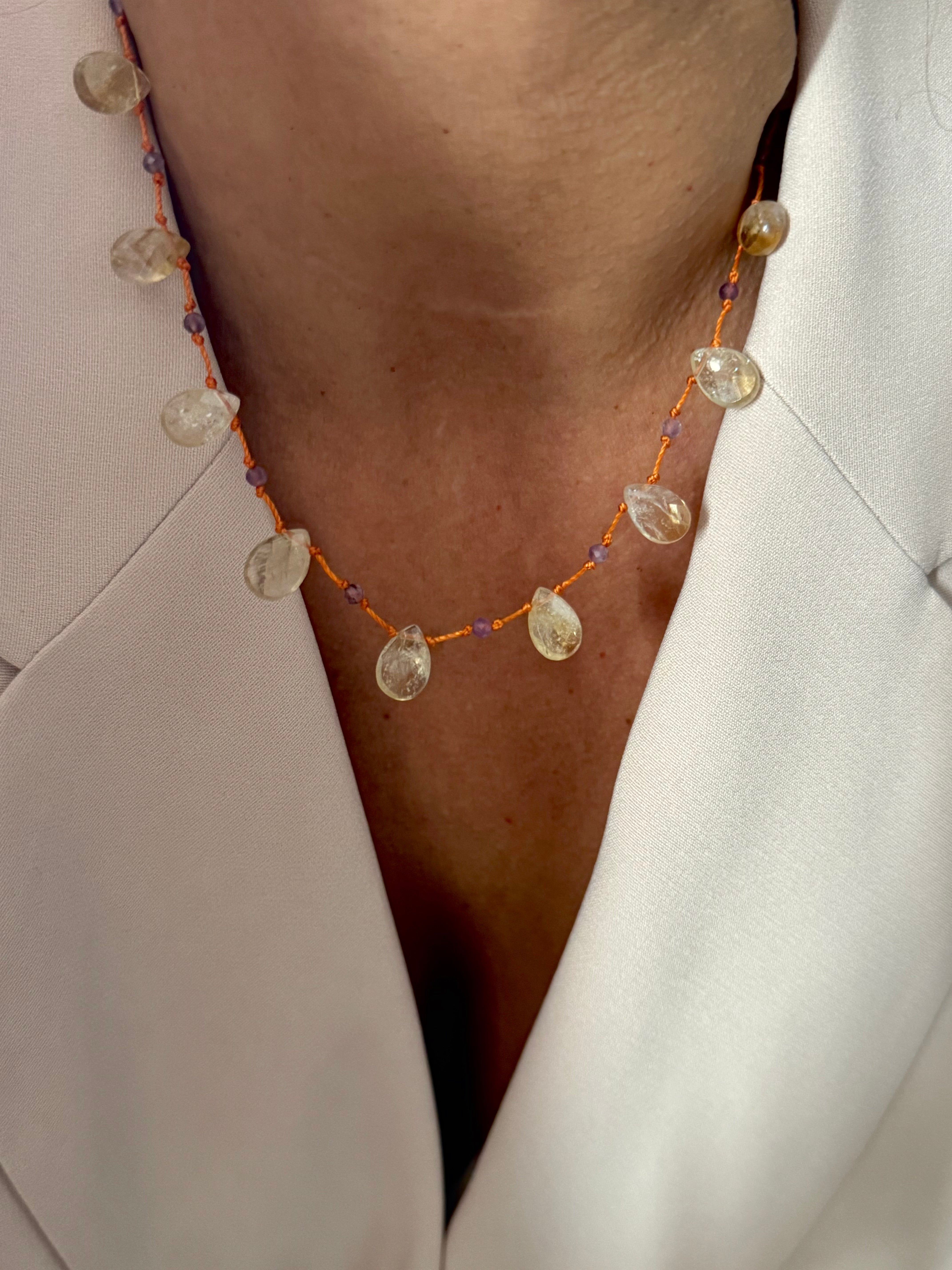 Gouttes en Citrine facettées et perles rondes facettées en améthyste, montées sur un fil de soie orange très résistant.