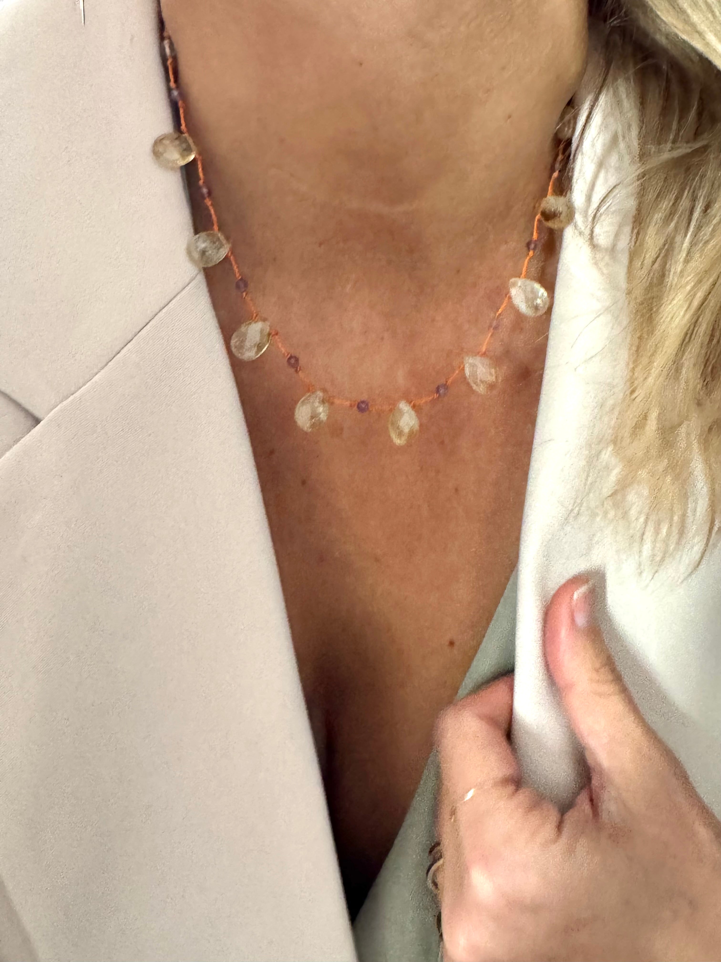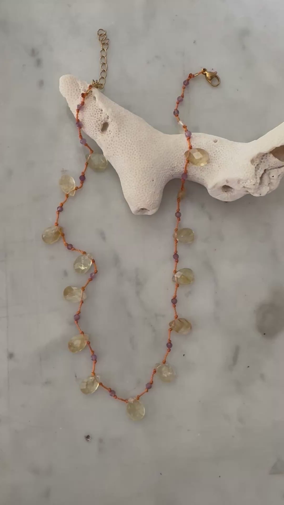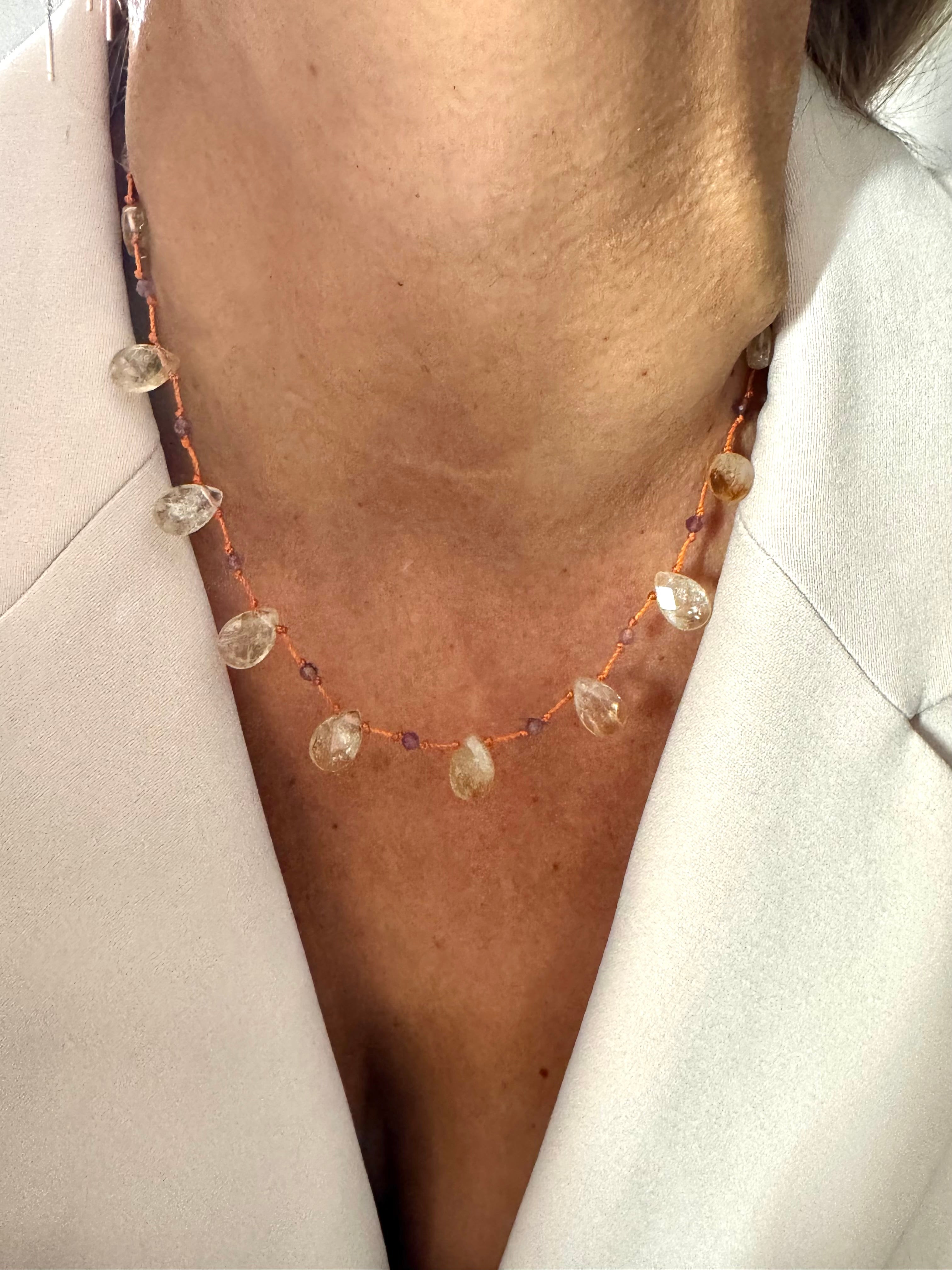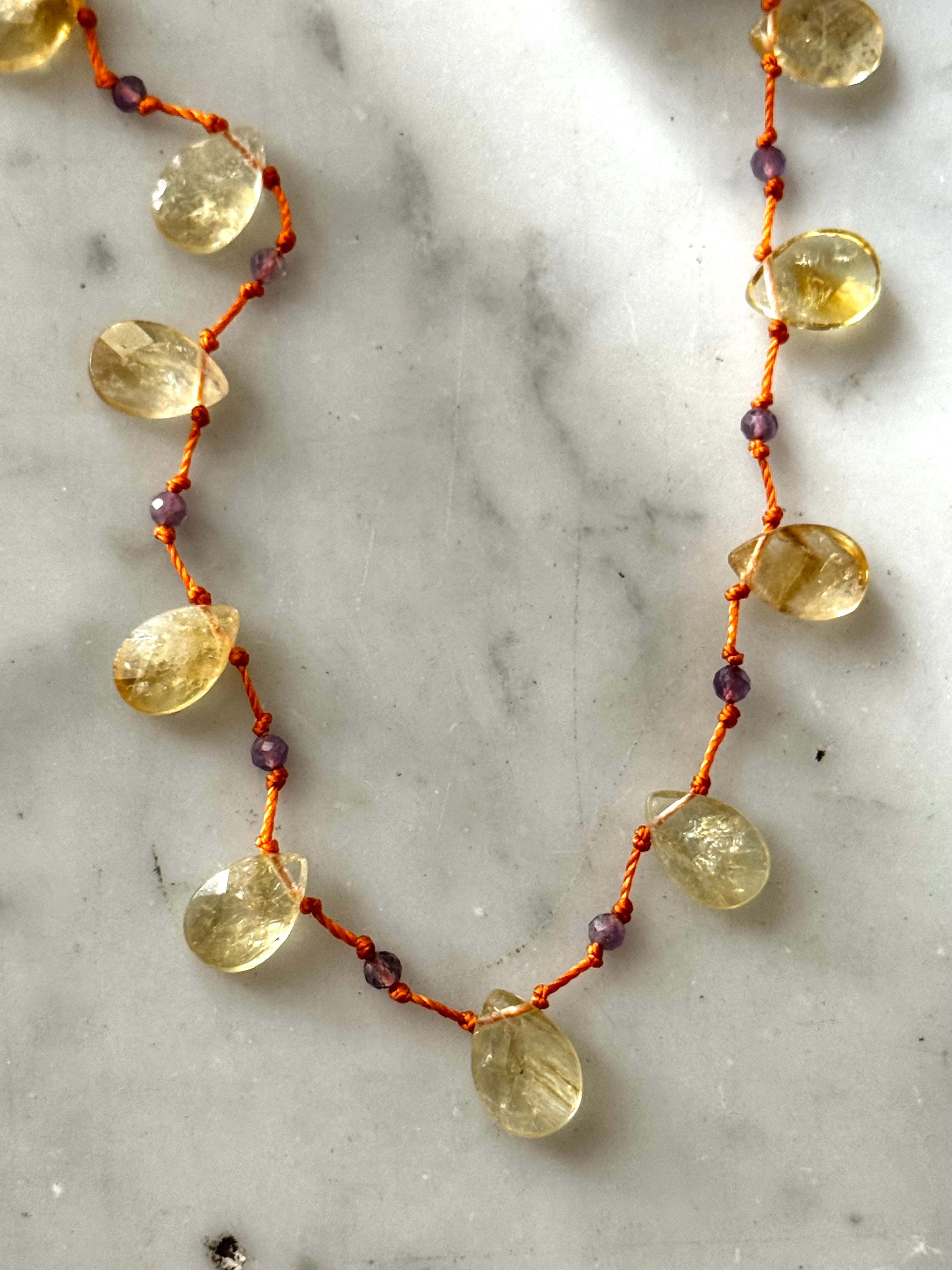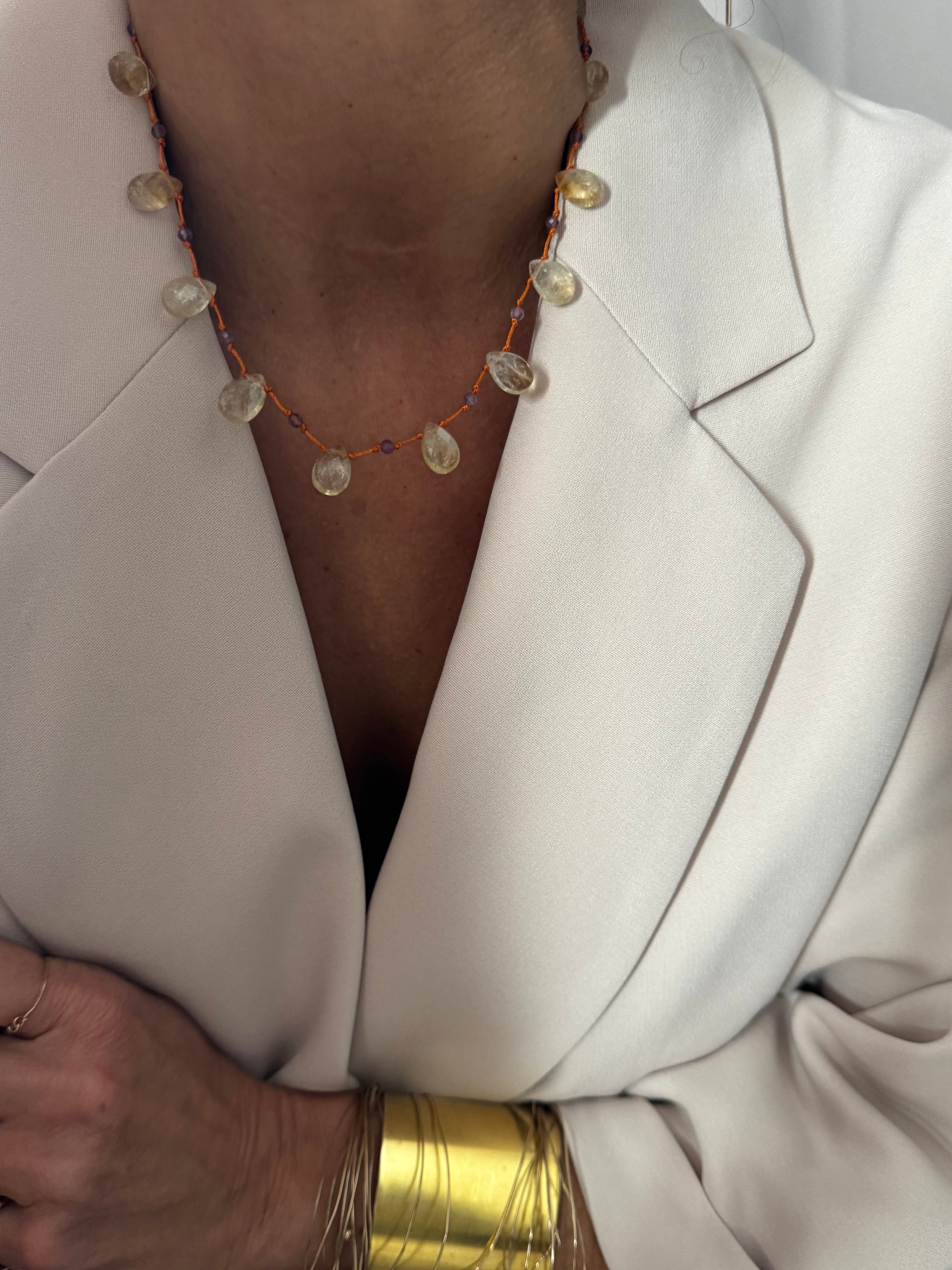 Gouttes en Citrine facettées et perles rondes facettées en améthyste, montées sur un fil de soie orange très résistant.