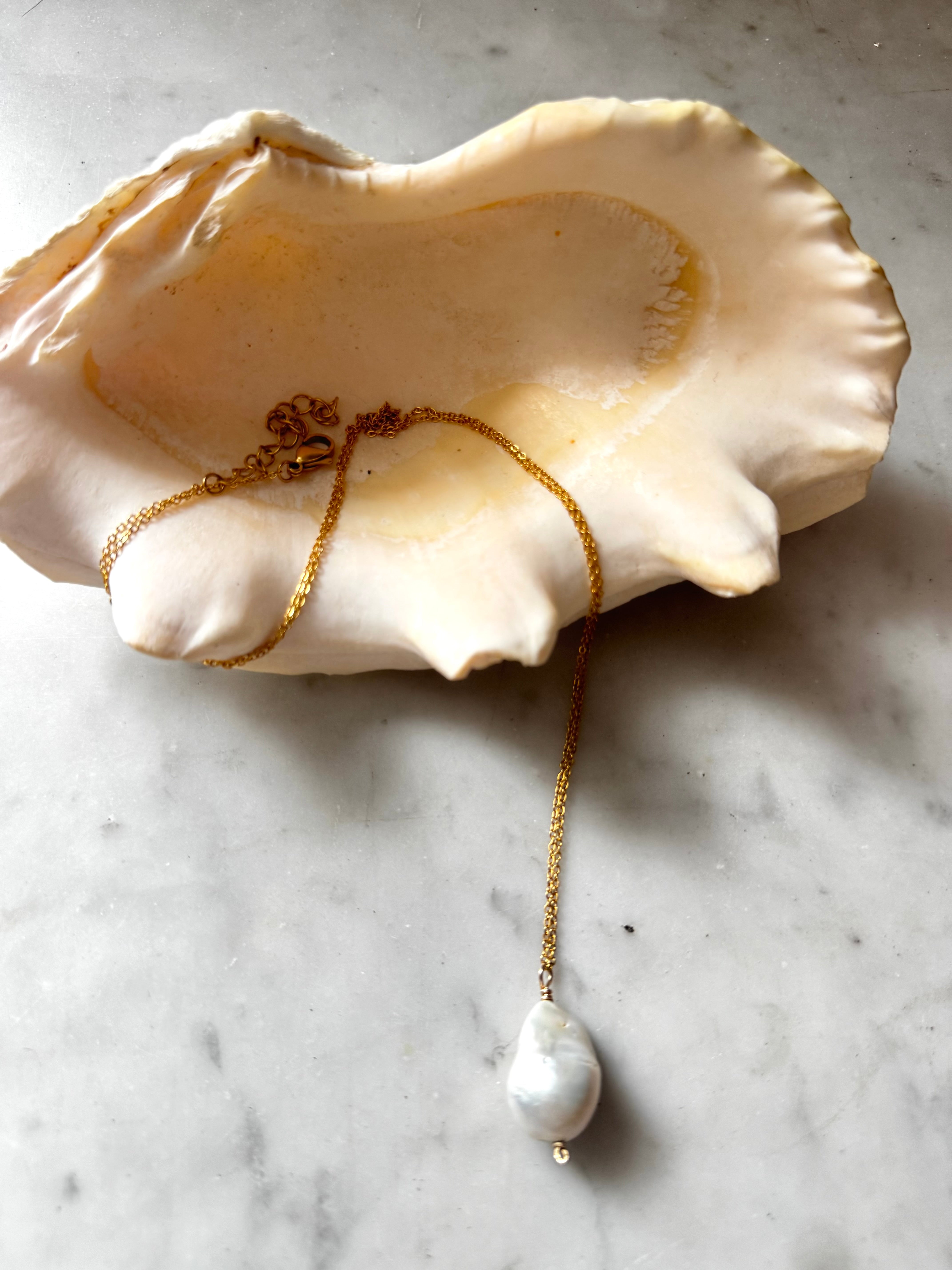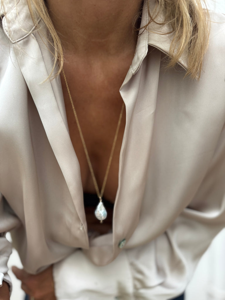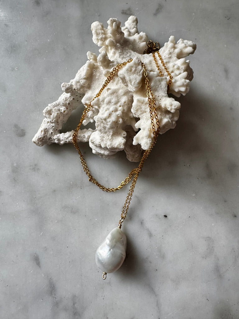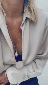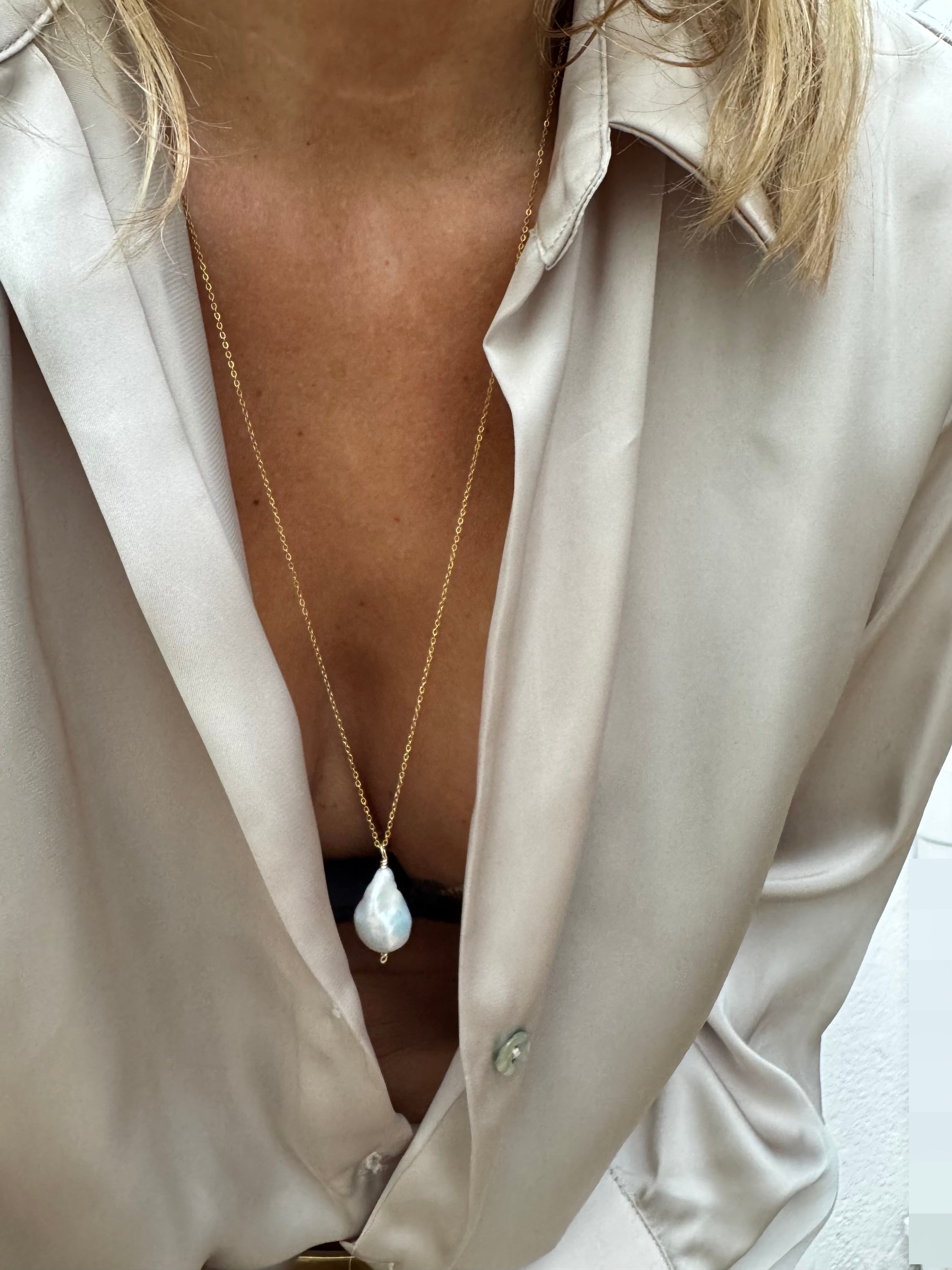 Chic, intemporel et un brin sexy comme j’aime ce collier va avec tout. Il est composé d’une longue chaîne fine en acier inoxydable avec une grosse perle baroque en pendentif.