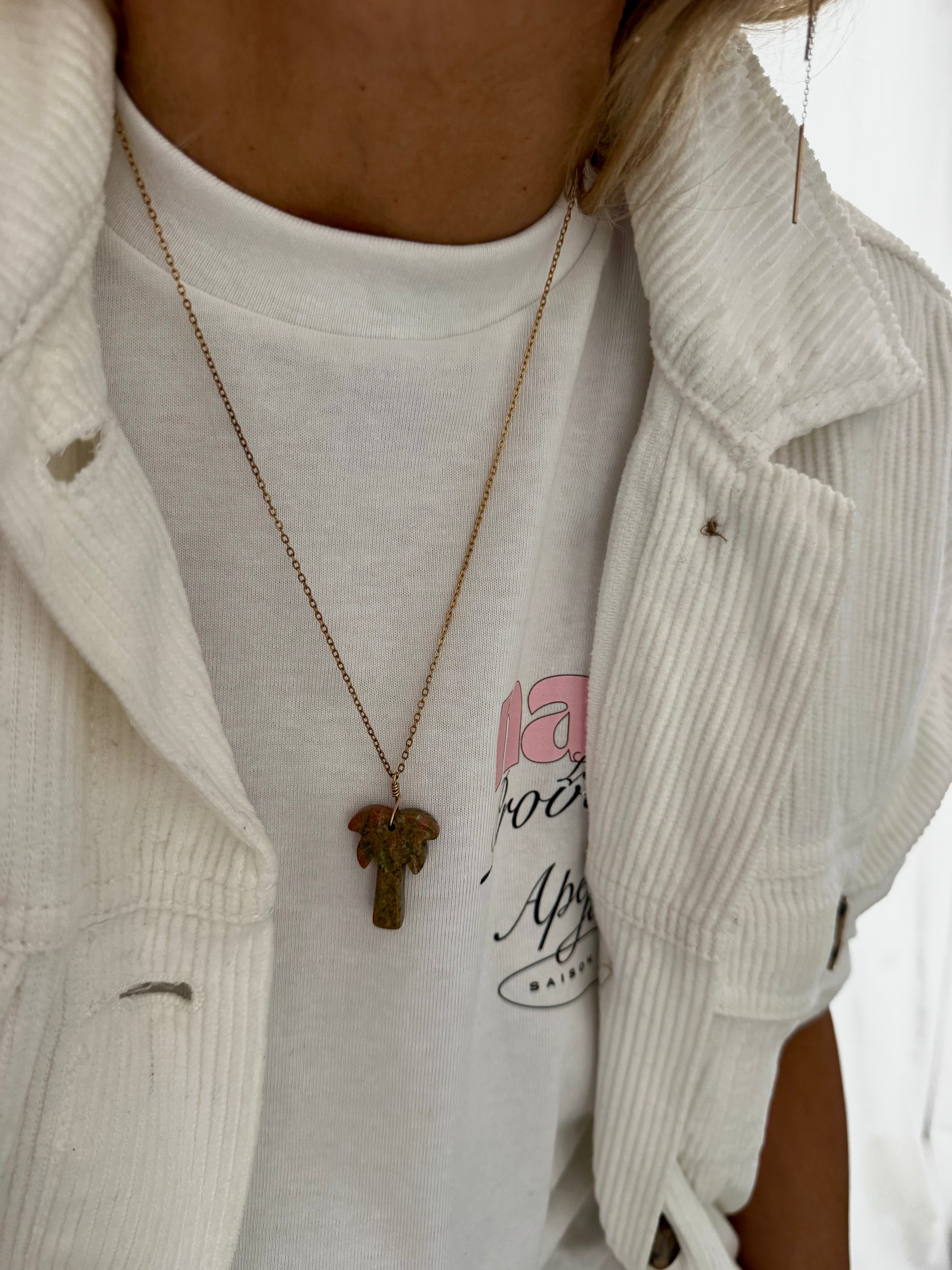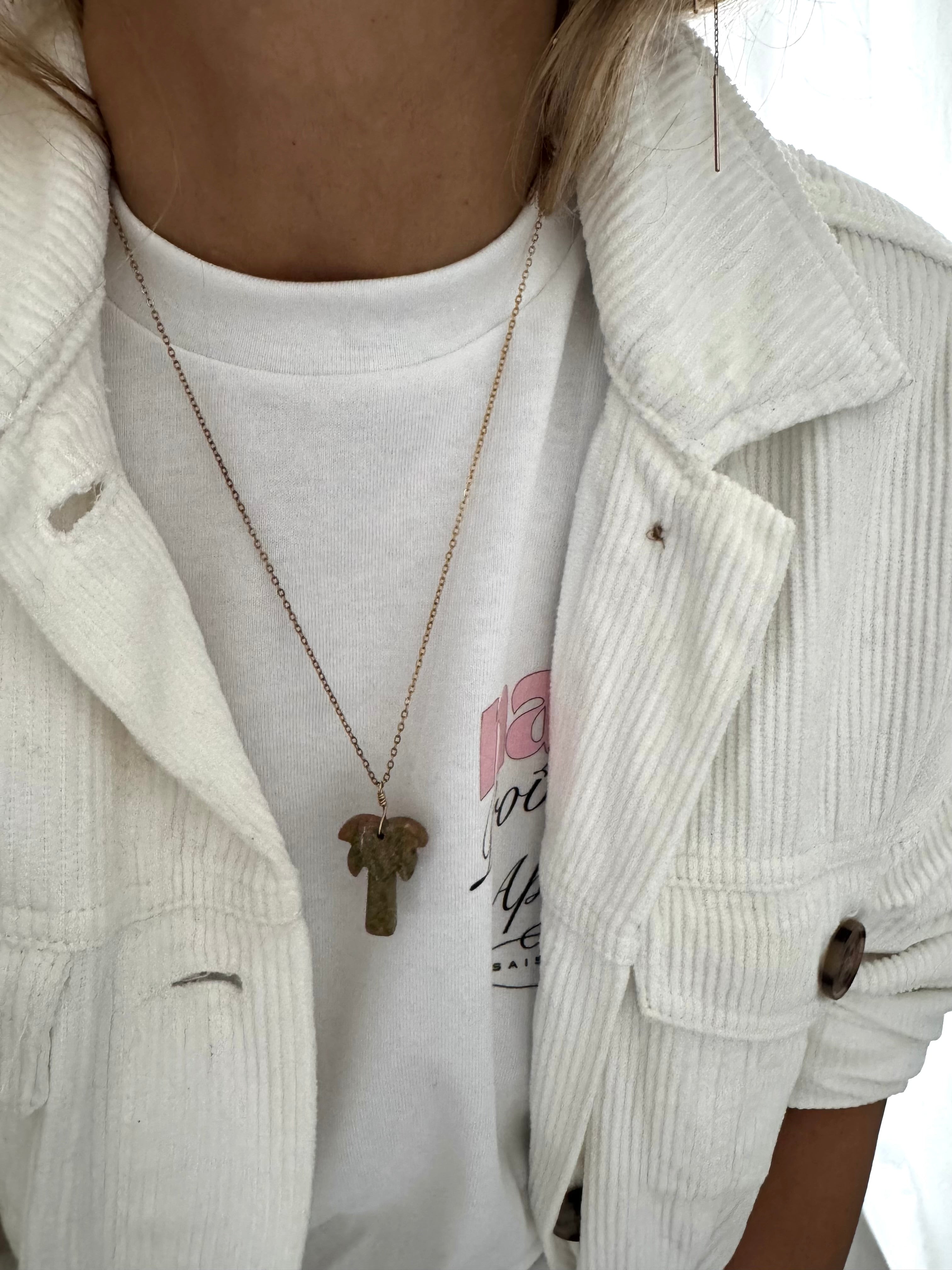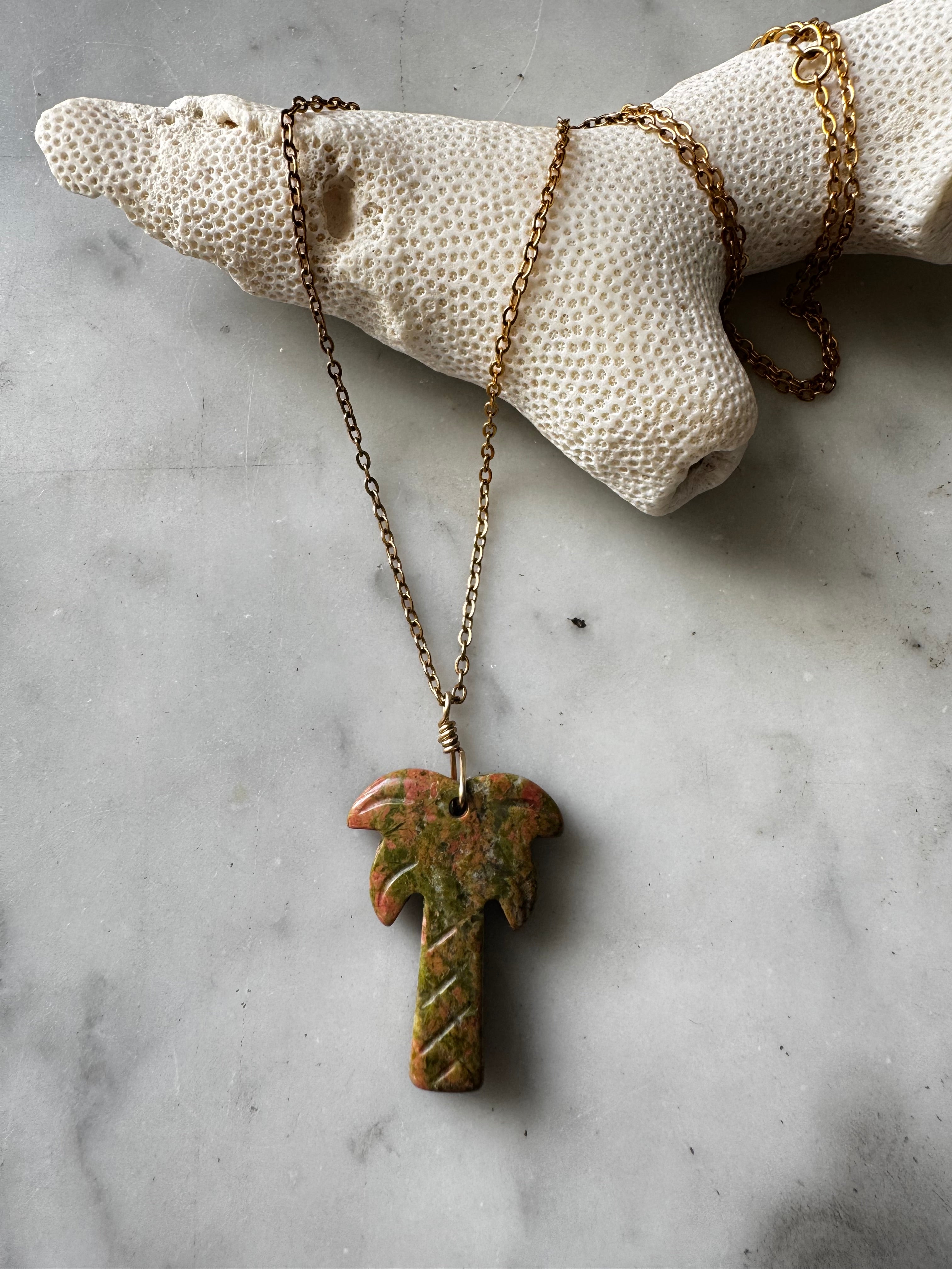 Chaîne en acier inoxydable doré or fin 24 carats et pendentif palmier en Unakite
