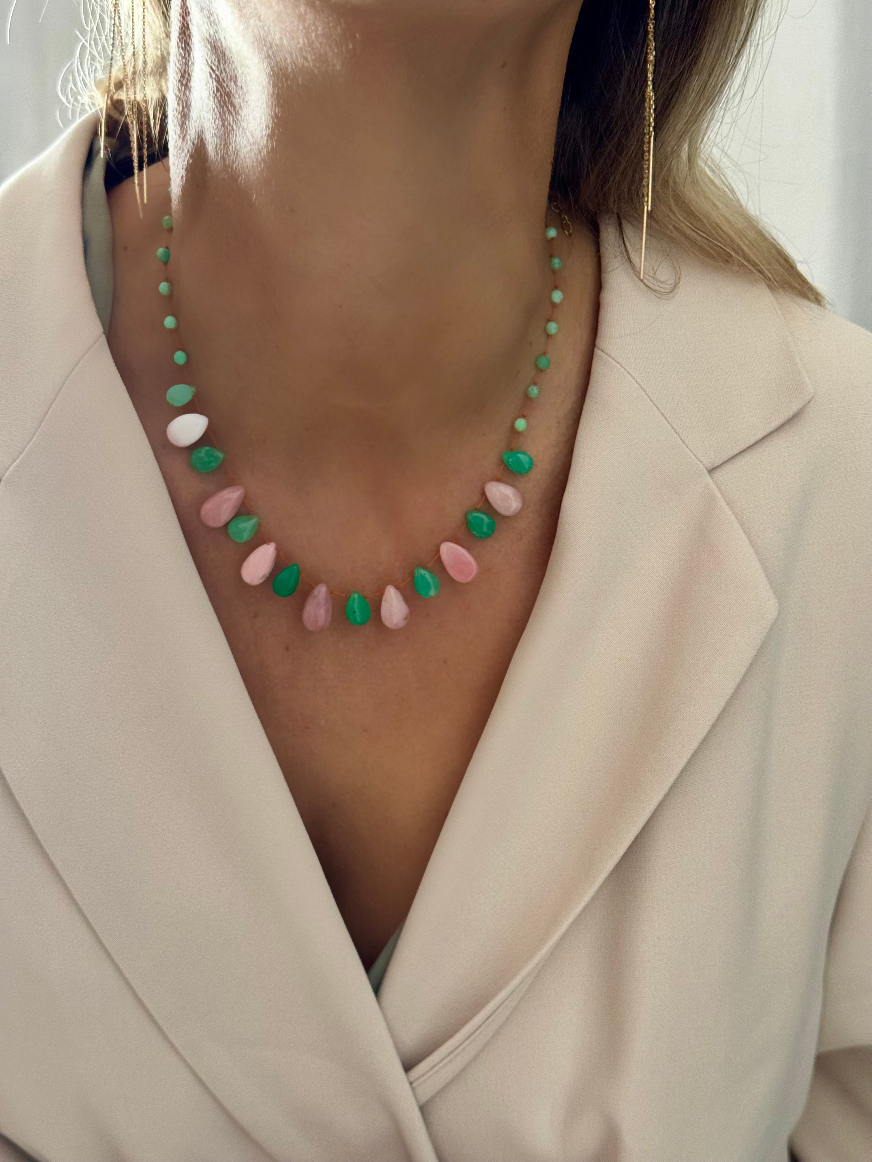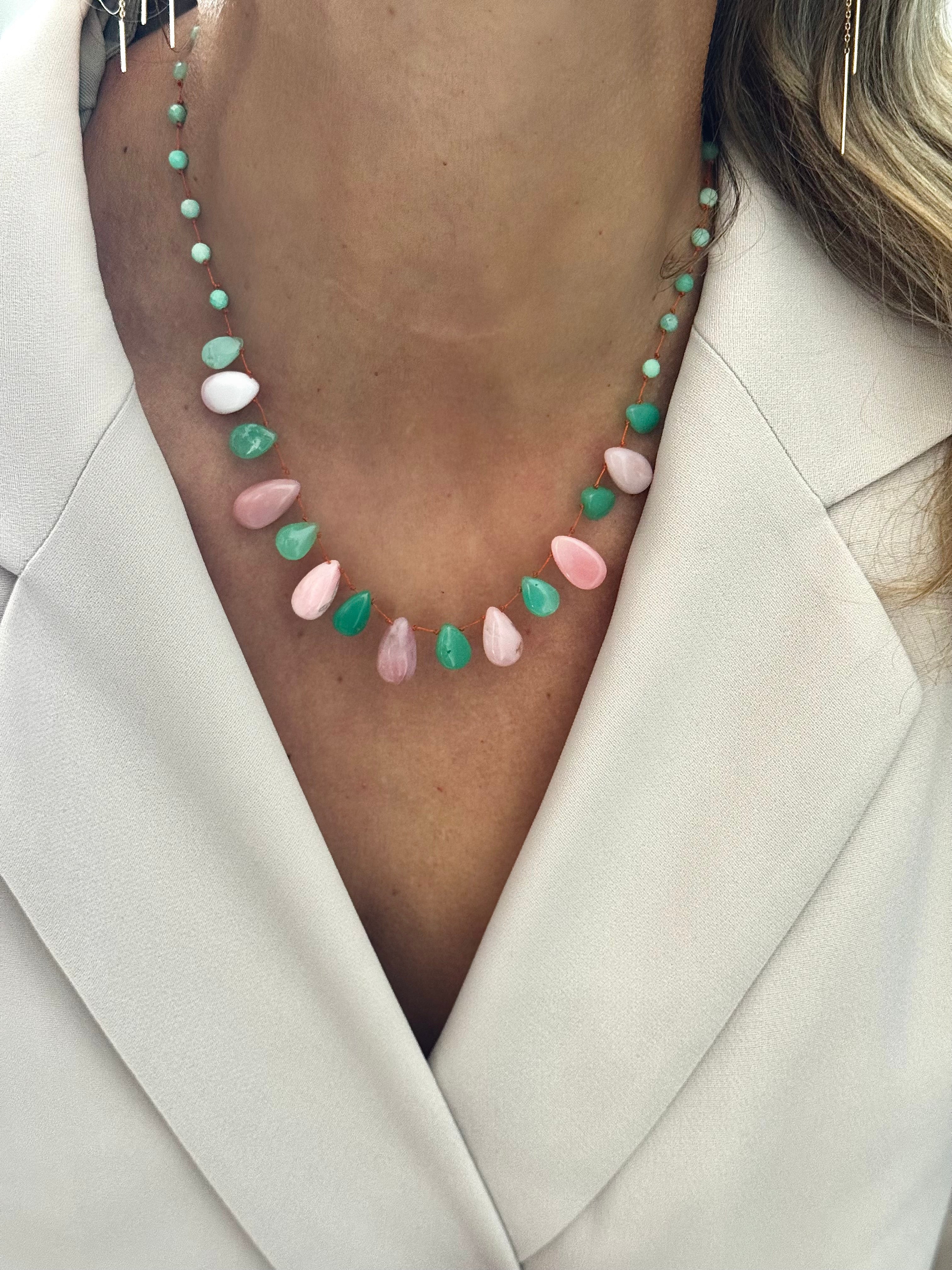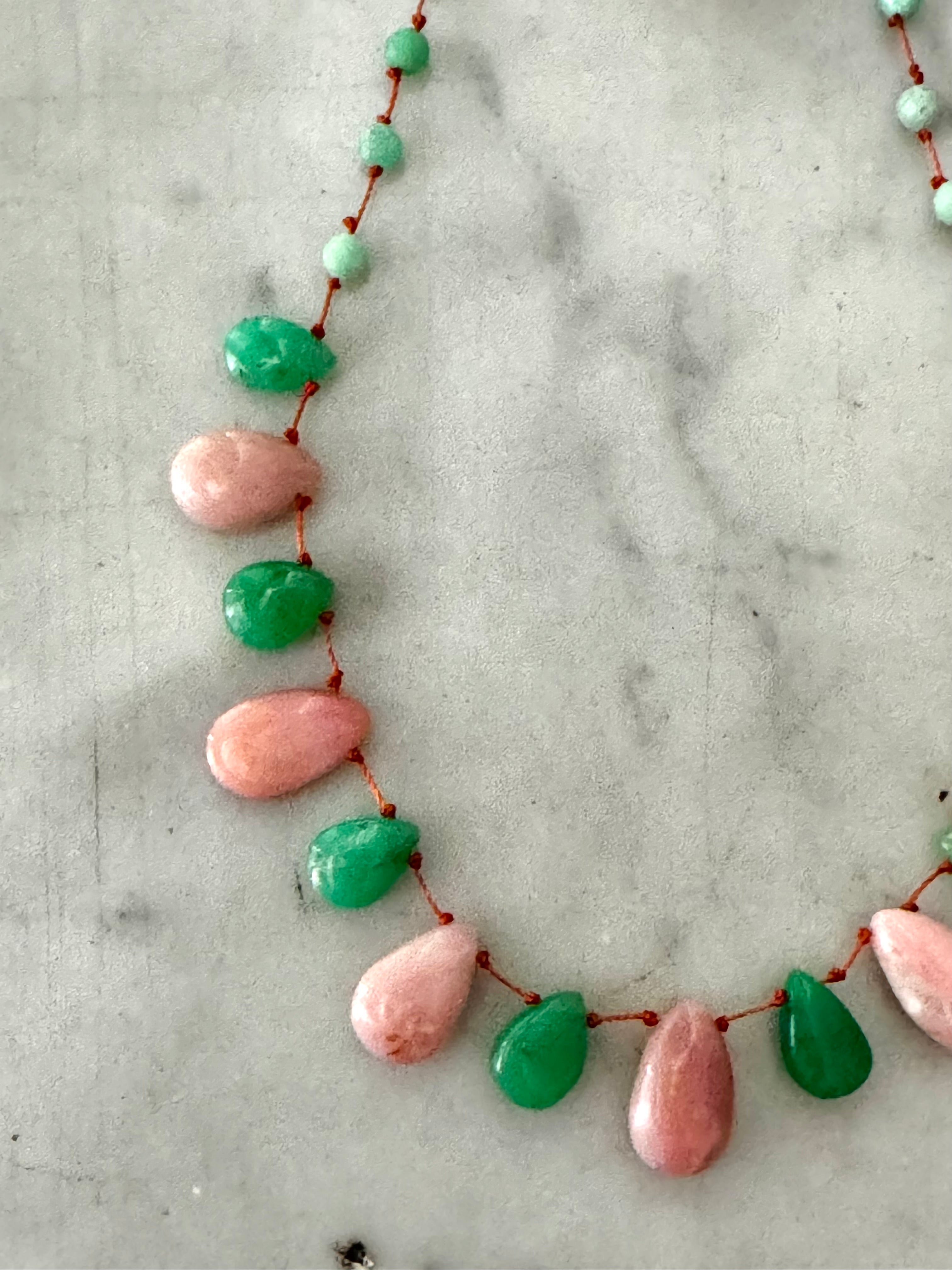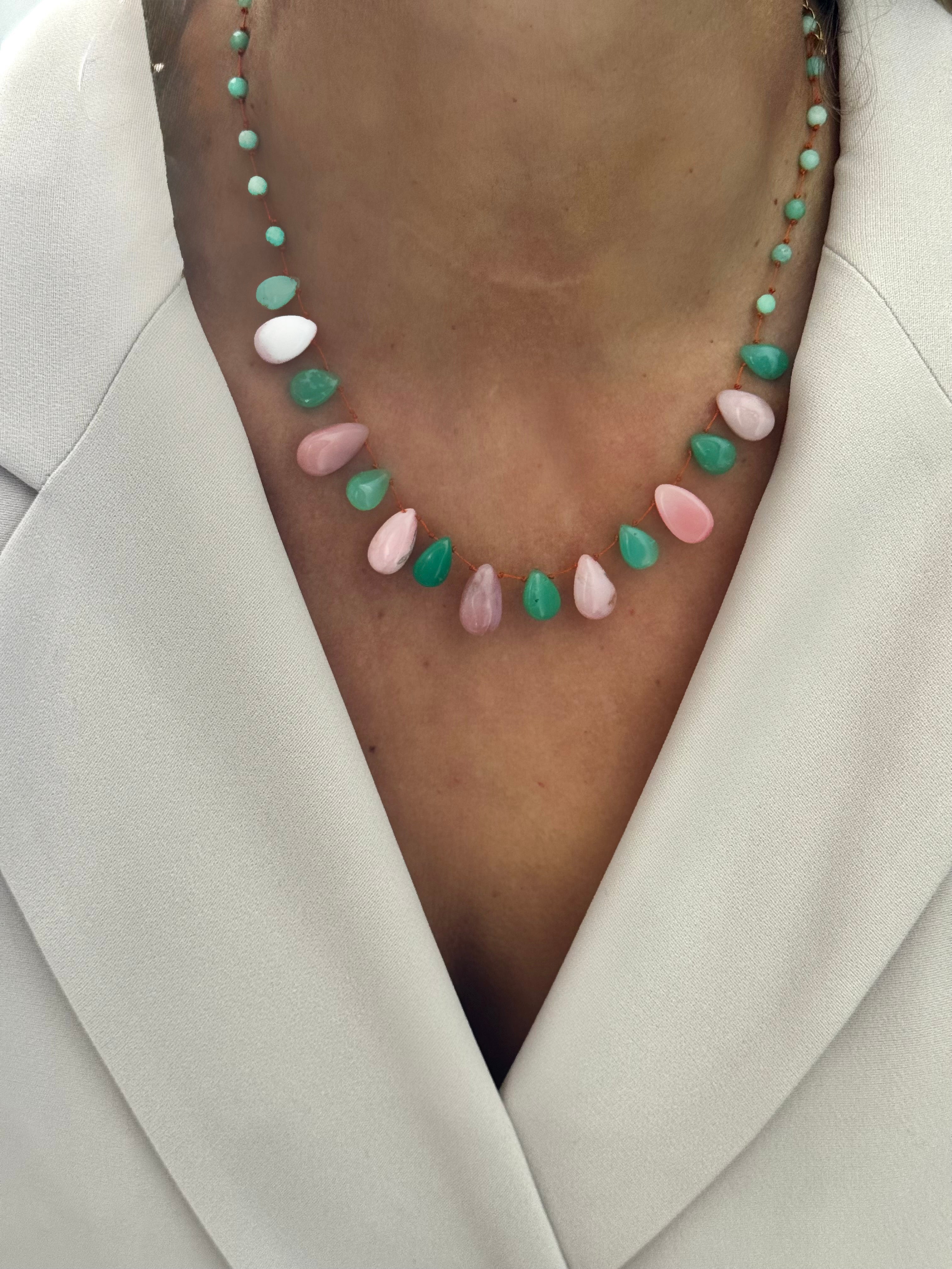 Magnifique collier en Chrysoprase et Opale rose lisses taillées en gouttes montées sur un fil de soie orange très résistant !