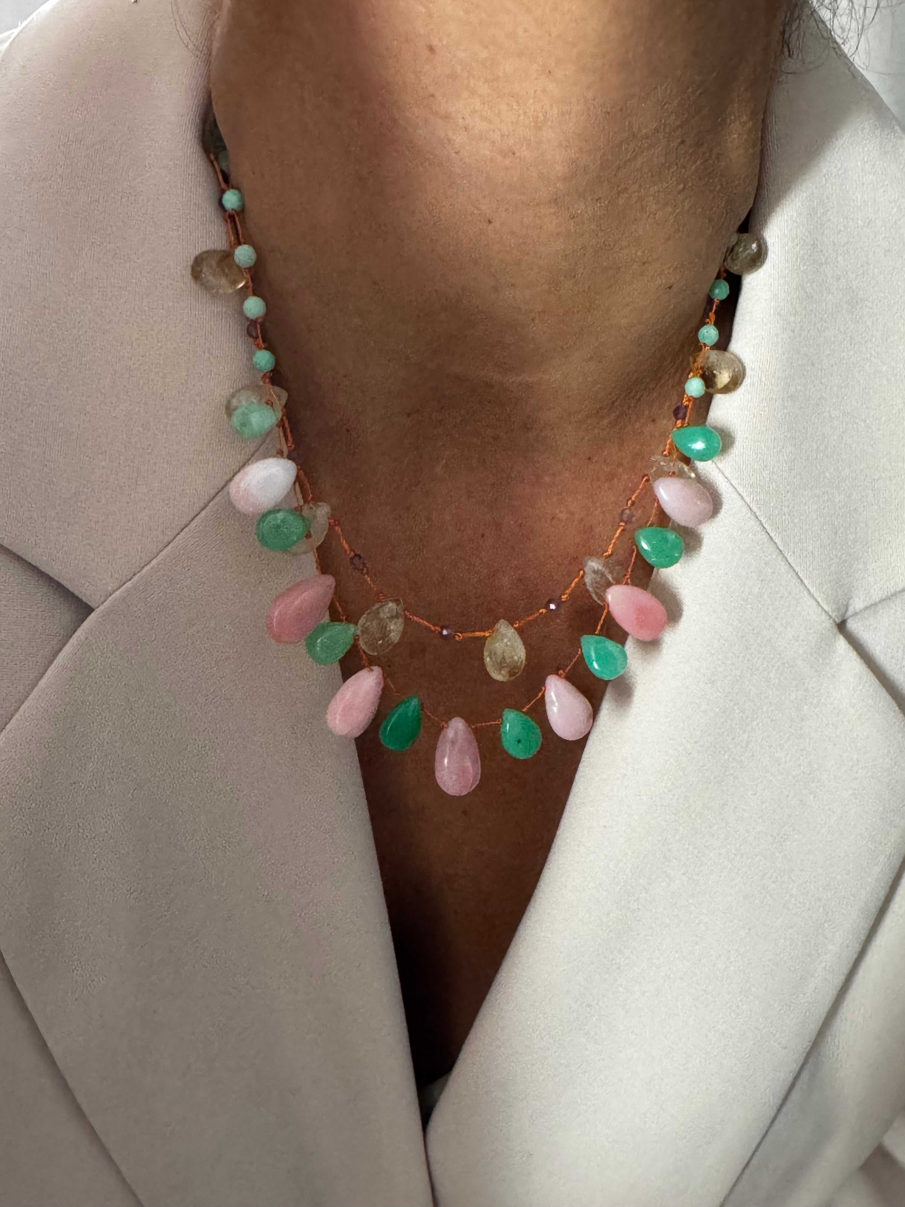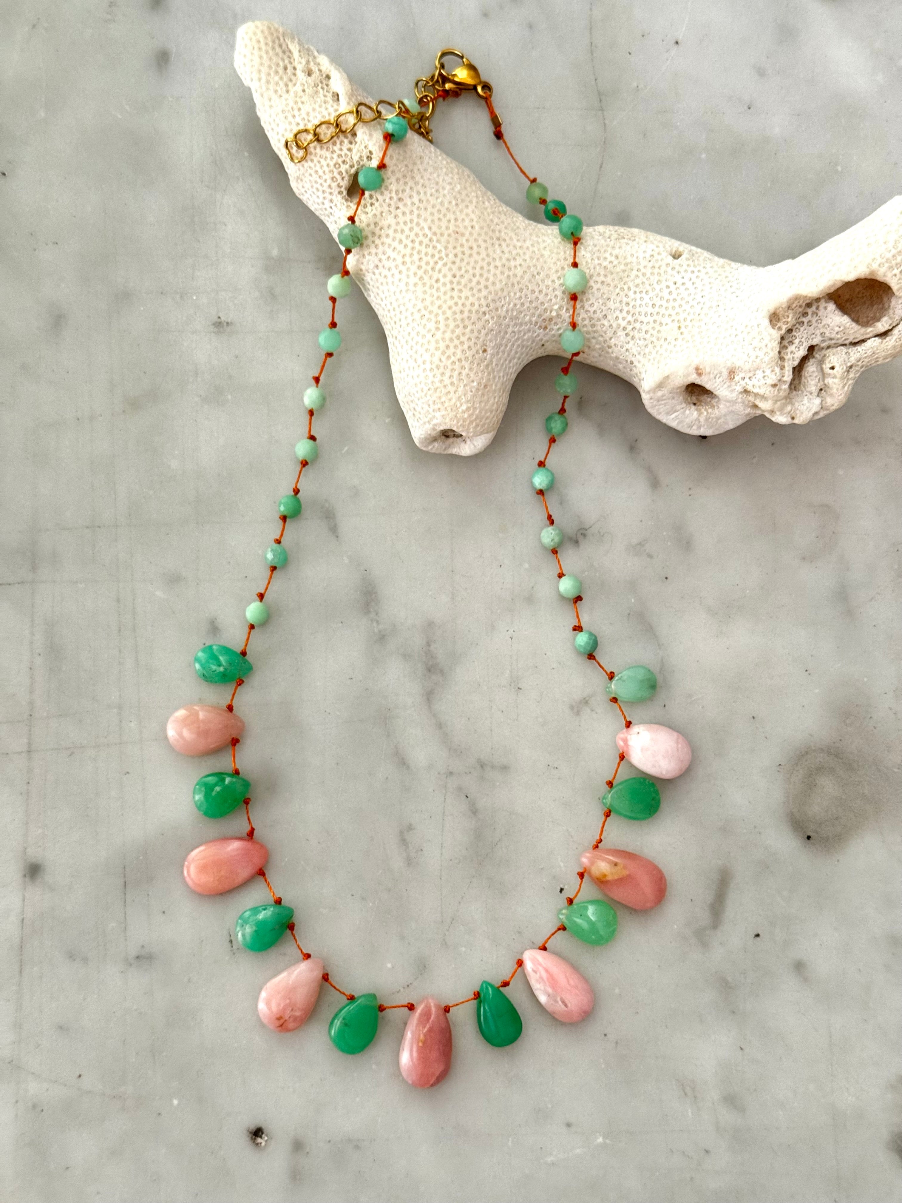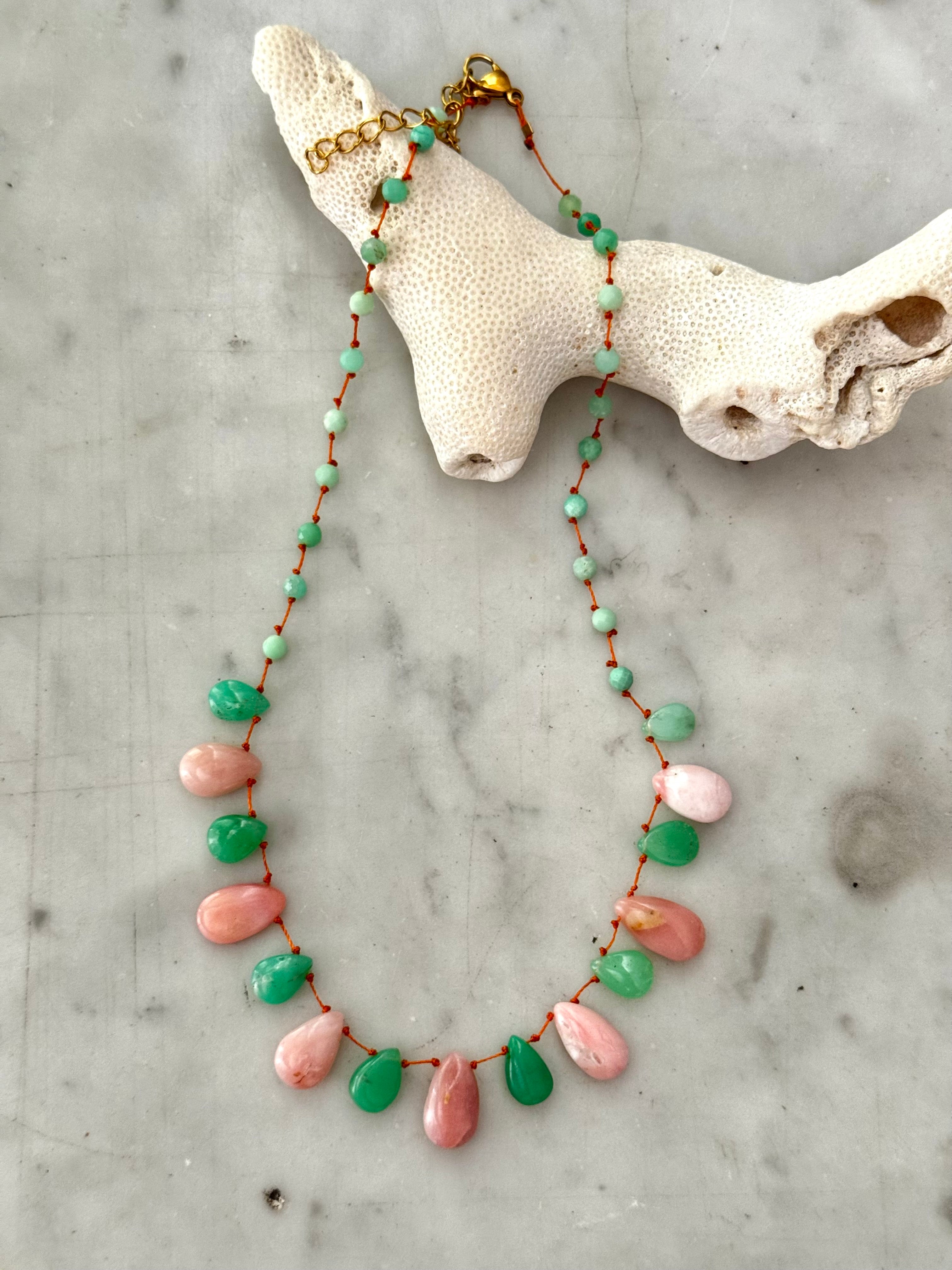 Magnifique collier en Chrysoprase et Opale rose lisses taillées en gouttes montées sur un fil de soie orange très résistant !