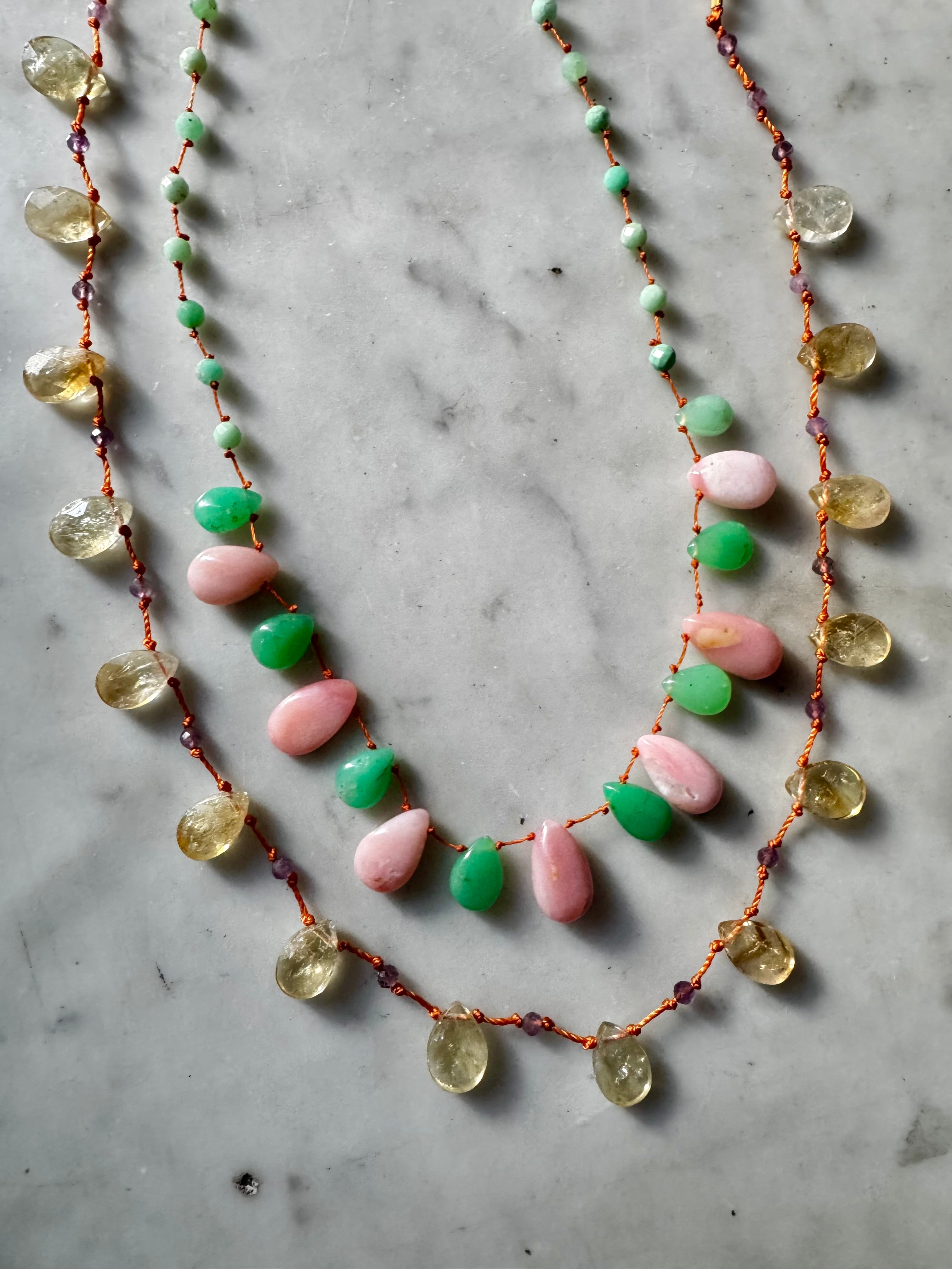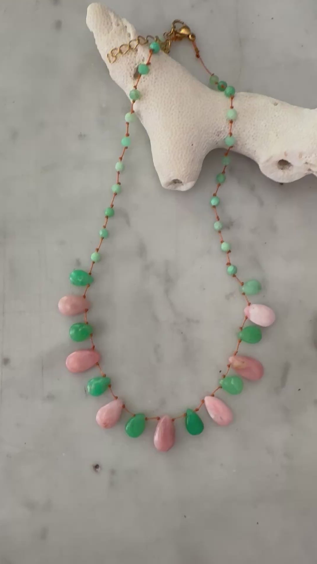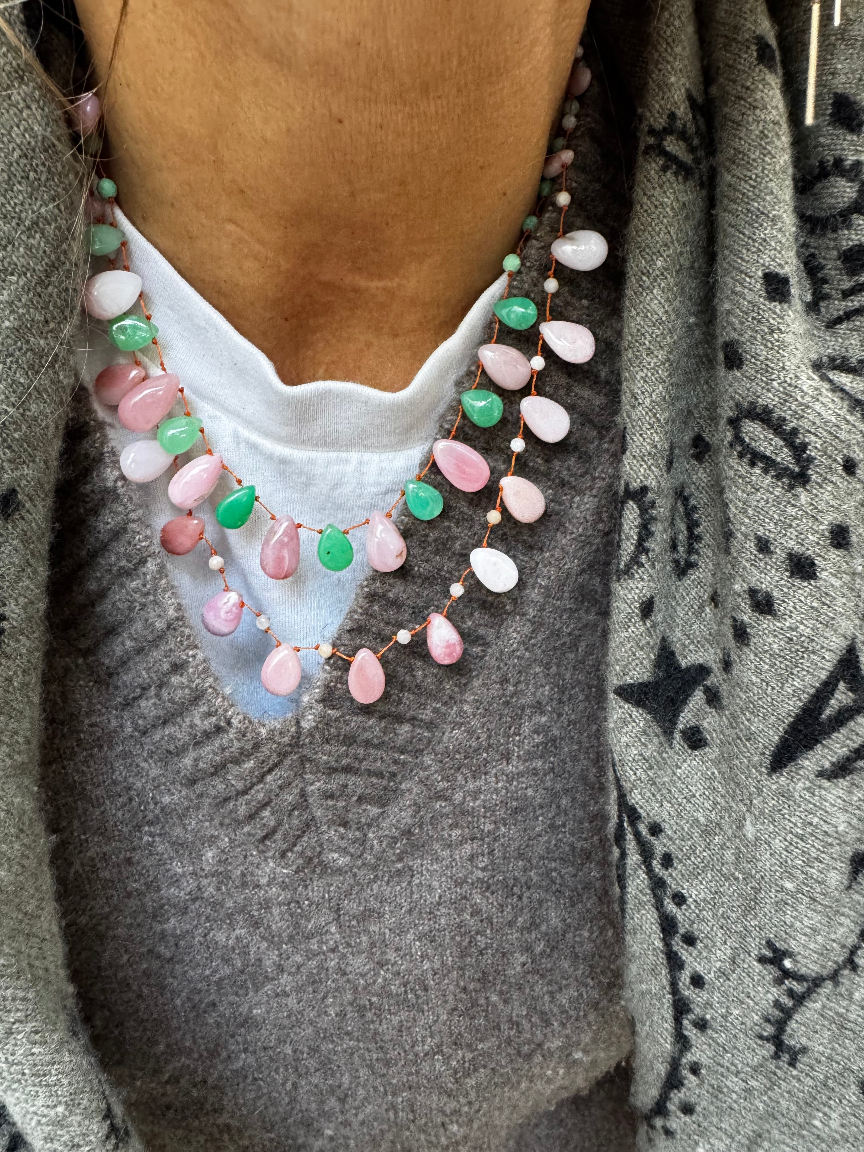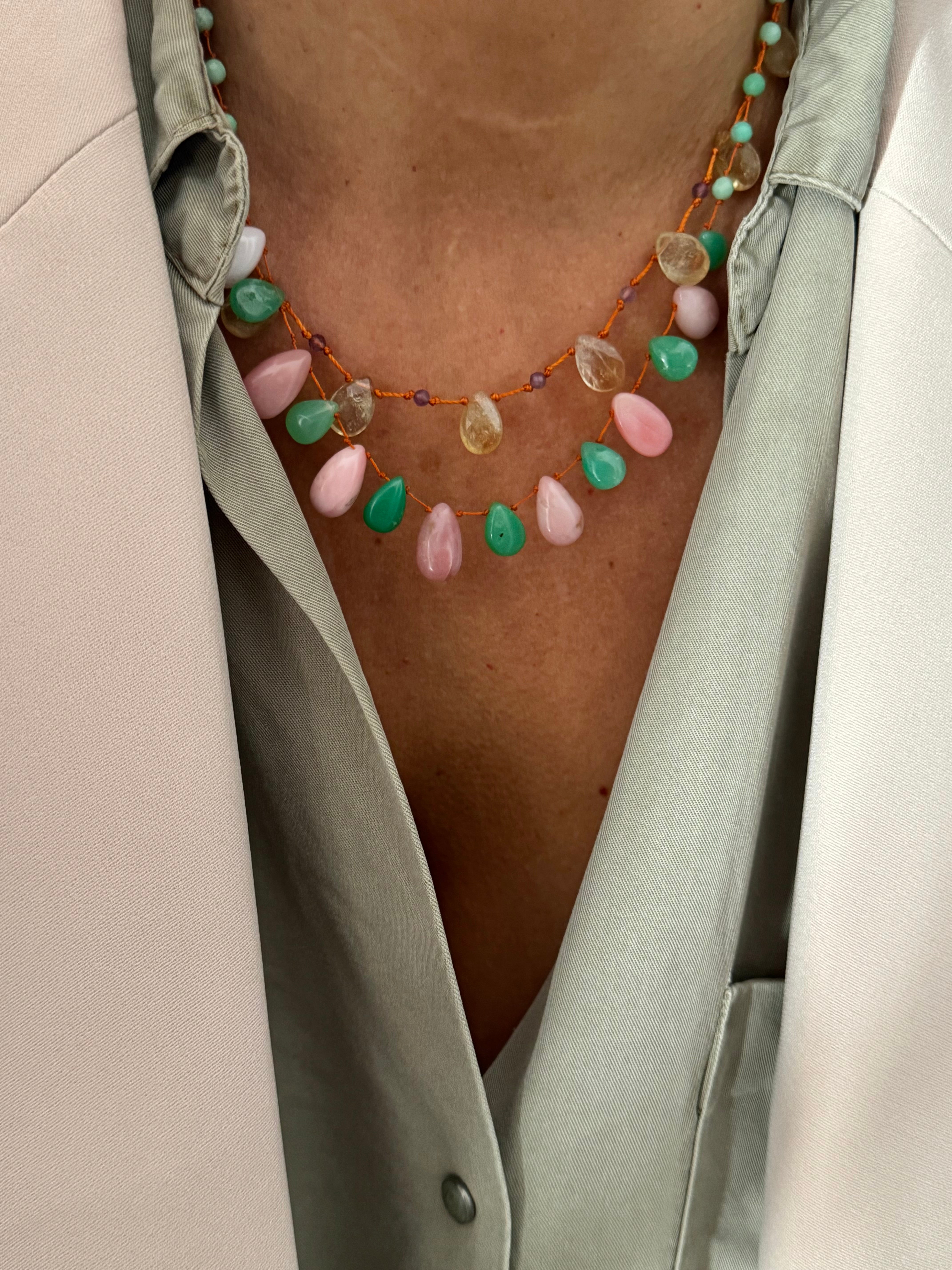 Magnifique collier en Chrysoprase et Opale rose lisses taillées en gouttes montées sur un fil de soie orange très résistant !